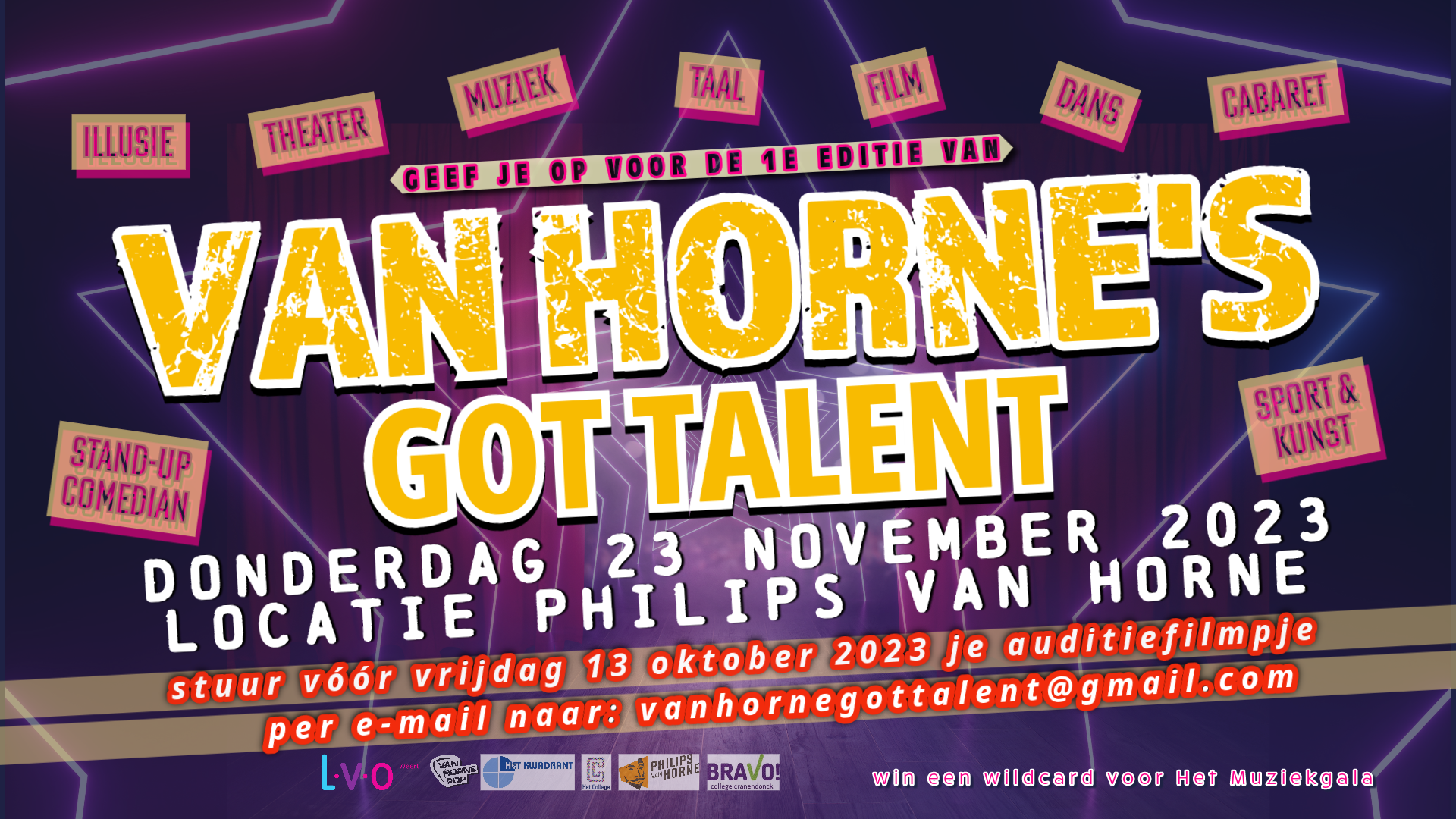 Een grote talentenshow, waarin leerlingen en personeel worden uitgenodigd hun talent tentoon te spreiden. Het evenement vindt plaats op donderdag 23 november 2023 in de aula van de Philips van Horne.