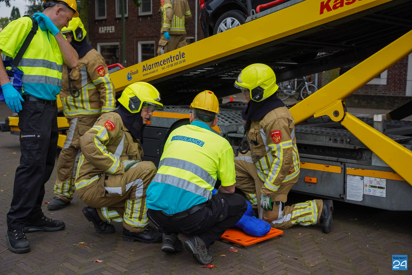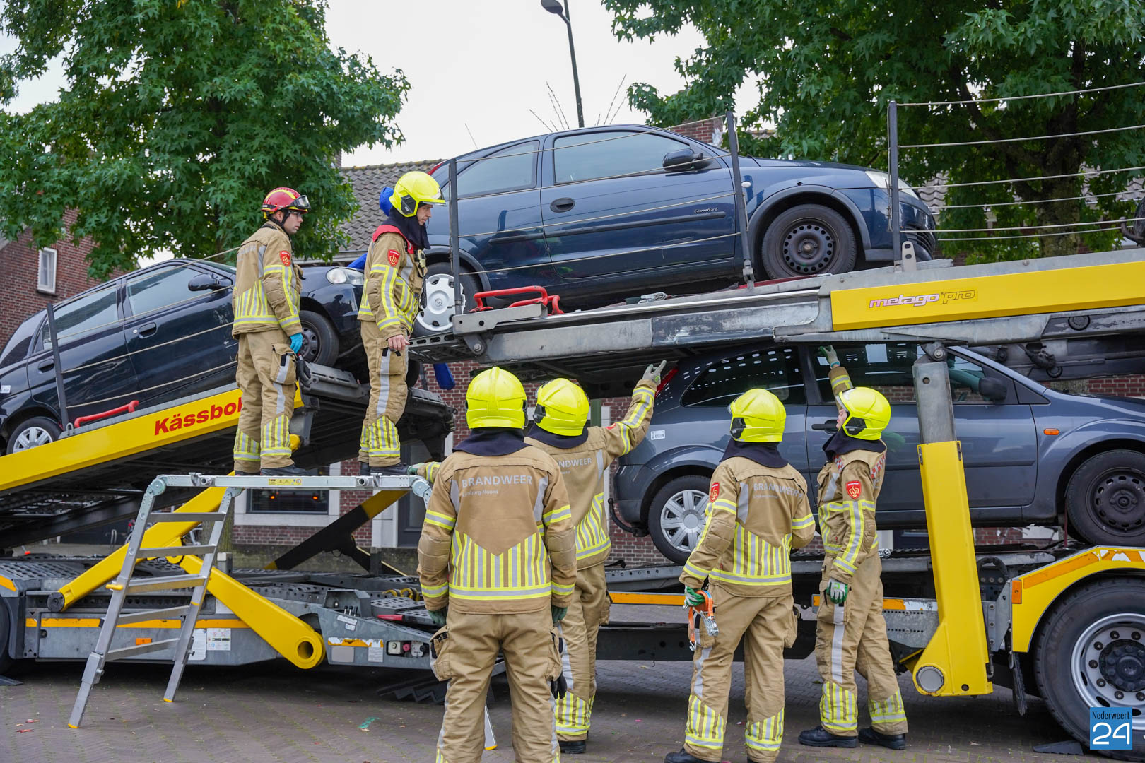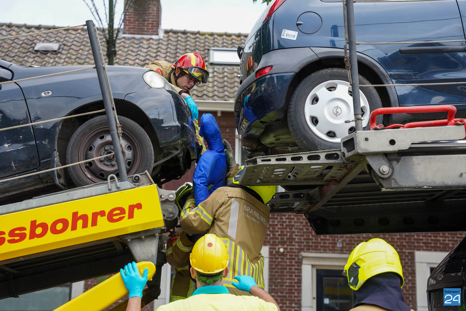 Een van de oefeningen waarmee de ploeg van Nederweert aan de slag ging startte vanmorgen al vroeg in Meijel. Een persoon zat zogenaamd klem tussen twee auto’s die boven op een berger stonden. Het was natuurlijk van belang dat deze persoon zonder te veel letsel tussen de auto’s uit werd gehaald. Door het samenwerken met het ambulancepersoneel werd de persoon tussen de twee auto’s gehaald en gestabiliseerd.