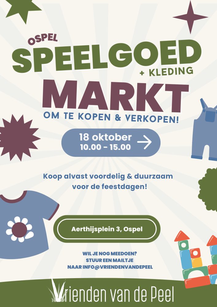 Bij Vrienden van de Peel in Ospel organiseren ze volgende week woensdag een speelgoed- en kledingmarkt. Hoe leuk is het om speelgoed en kleding een tweede leven te geven? Wil jij vast op tijd cadeautjes kopen voor de feestdagen? Kom dan zeker even kijken.