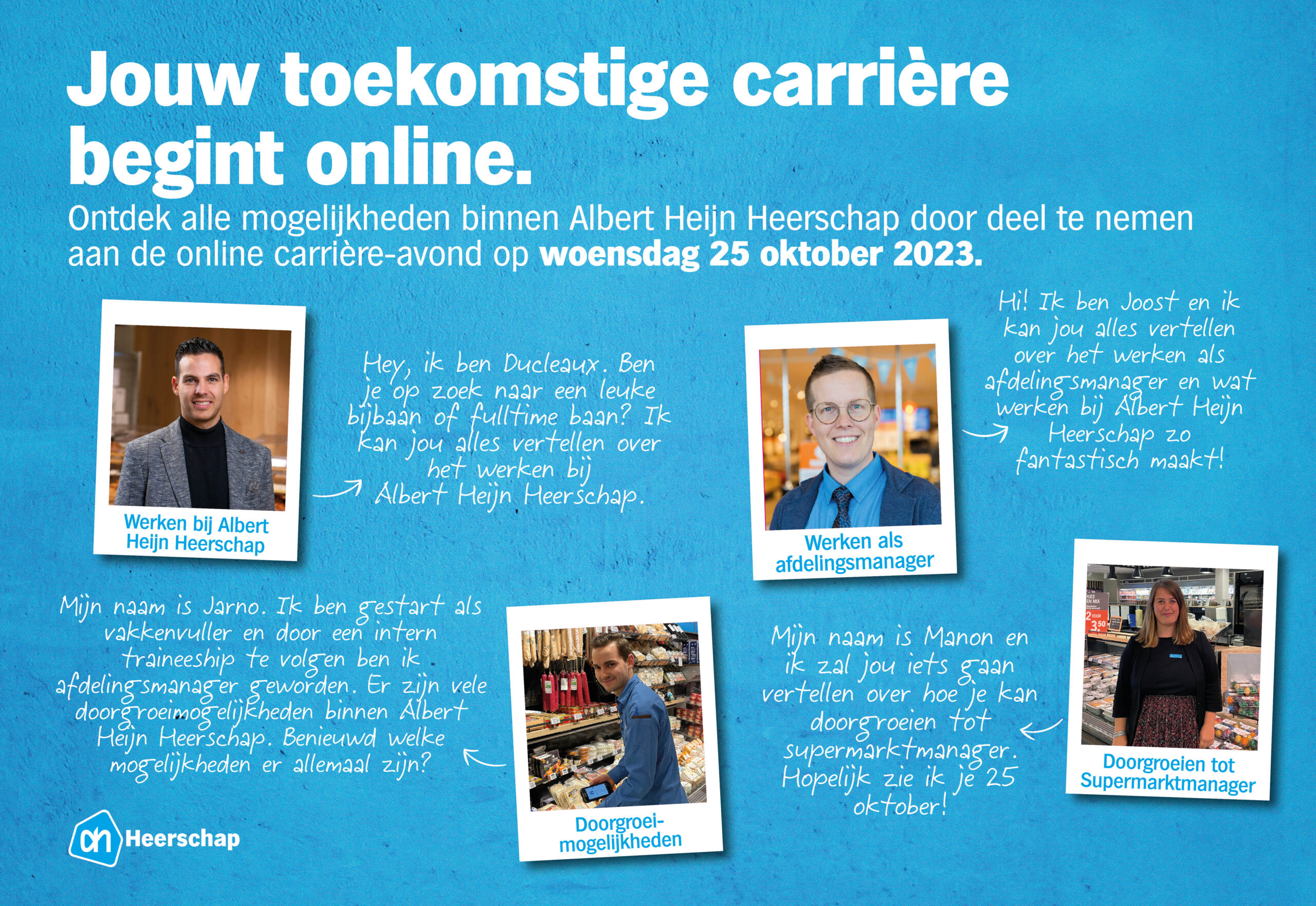 De talenten van Albert Heijn Heerschap groeien door! Daarom is het bedrijf op zoek naar nieuwe talenten en nodigt het iedereen uit voor een online carrière-avond op woensdag 25 oktober. Of je nu moet kiezen voor je eerste bijbaan of aan het begin van je loopbaan staat, een carrièreswitch overweegt of simpelweg nieuwsgierig bent naar de mogelijkheden, deze avond is jouw kans om de mogelijkheden bij Albert Heijn Heerschap te ontdekken.