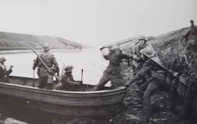 Duitse krijgsgevangenen worden afgevoerd per boot. Op de achtergrond is de opgeblazen Schoorbrug te zien. De locatie van deze evacuatie-actie is ter hoogte van de bij het archeologisch onderzoek ontdekte loopgraven.