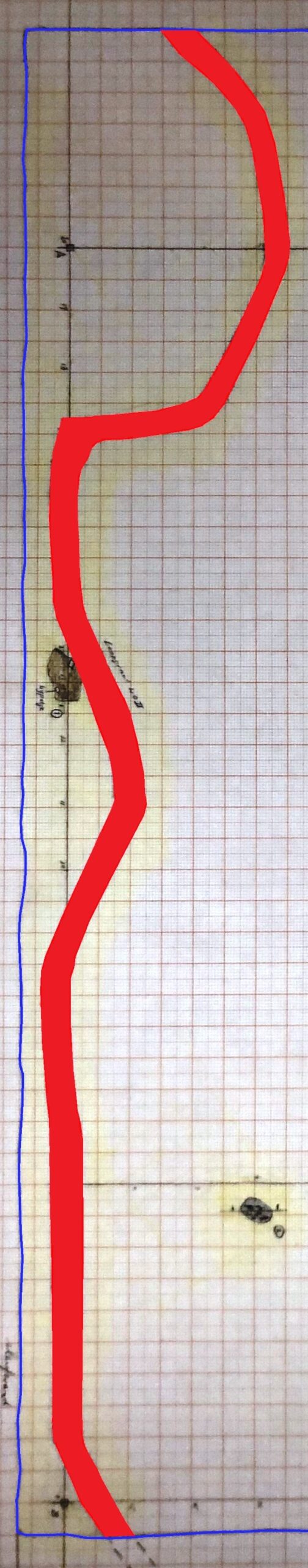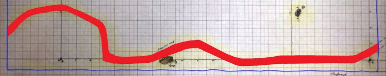 Tekening van een stuk van de gevonden loopgraaf op de oever van het kanaal. De afgebeelde lengte is 17 m. De kanaalzijde is aan de bovenkant.