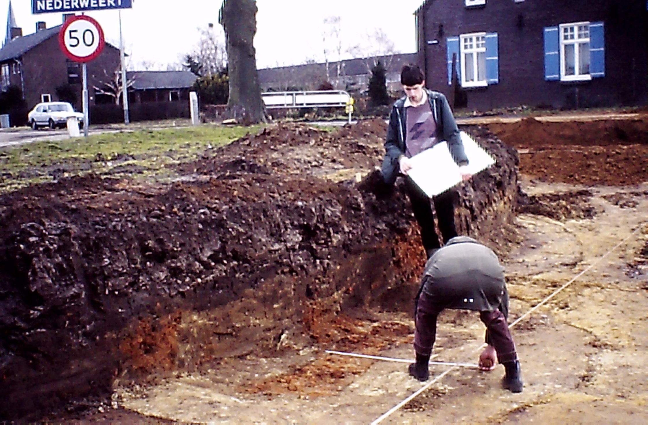 In 1985 startte de gemeente Nederweert met de uitvoering van het uitbreidingsplan Bredeweg/Molenweg. Eén van de infrastructurele aanpassingen in dat kader was het veranderen van de aansluiting van de Molenweg op de Bredeweg. Sommigen zullen zich de locatie nog goed herinneren: op die plek (‘Bi-j Mueën’, fam. Van Loon) stond een prachtige lindenboom met een veldkruis. In het voorjaar van 1985 werden de wegwerkzaamheden uitgevoerd. Het nieuw-uitgegraven wegcunet bood de mogelijkheid om als kijkgaatje te fungeren naar de archeologische ondergrond.