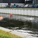 Medewerkers van de dierenambulance waren door medewerkers van het bedrijf naast het waterbassin geïnformeerd over een gewonde zwaan. Ze kwamen ter plaatse maar constateerden al snel dat er hulp nodig was van de brandweer om de zwaan te vangen.