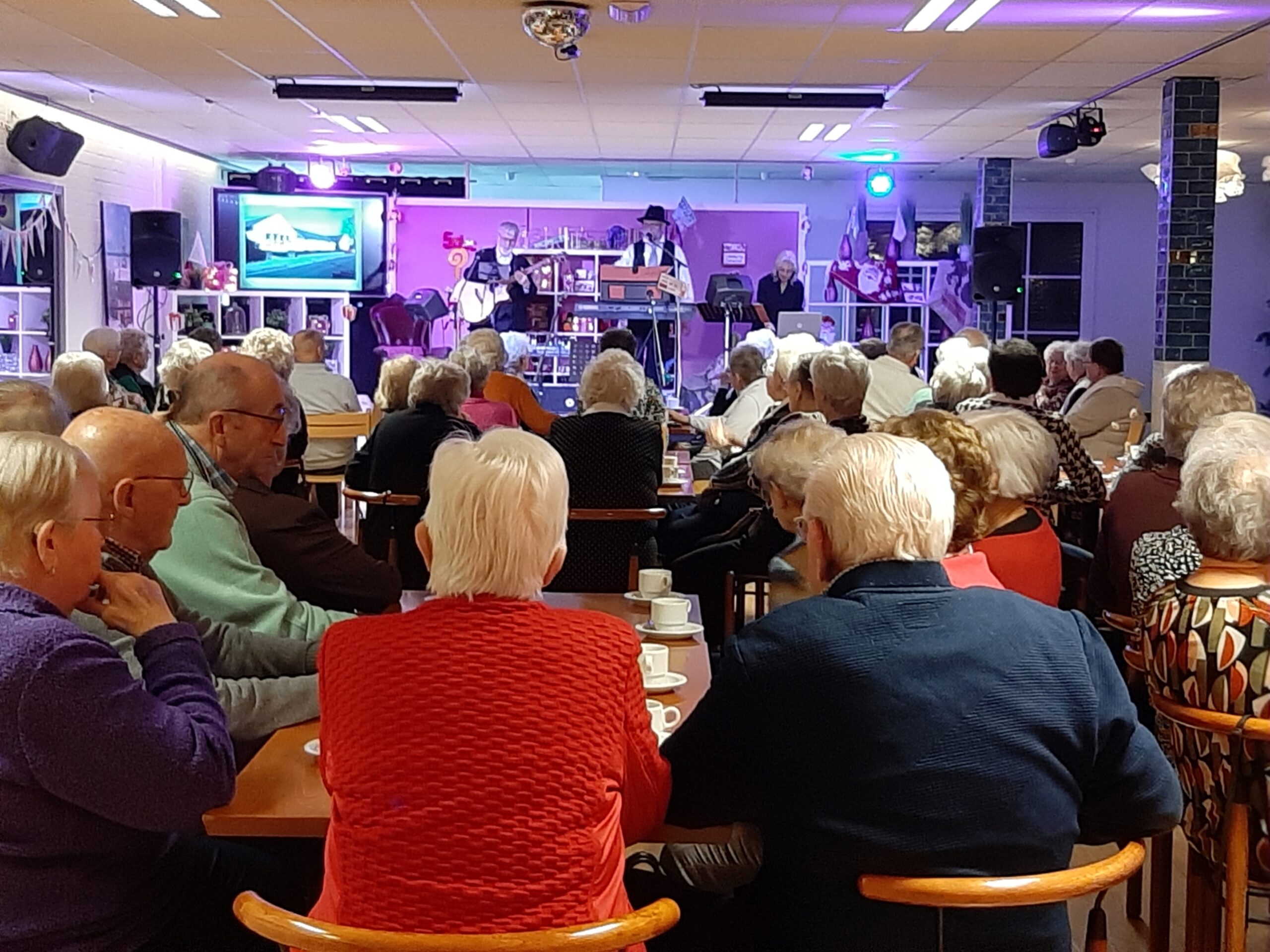 Na een korte pauze was het de beurt aan het duo “Jan en Wim” van toneelgroep De Krottenpoffers uit Nederweert. Al zingende “kom maar binnen met je…” werd het tweetal door de aanwezigen binnengehaald. Hun welbekende act uit de 60-70 jaren was in een nieuw jasje gestoken waarvan de aanwezigen zichtbaar genoten. Plaatselijke anekdotes, gelardeerd met een vleugje ironie en veel jolijt, passeerden de revue waarbij ook bekende dorpsfiguren op de hak werden genomen. Vervolgens nam Sante Kroam het laatste gedeelte van de middag weer over. Een zanggroep die al vele jaren de geschiedenis van Nederweert bezingt en kwistig met “muzikale noten” strooide.