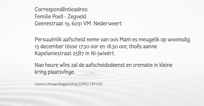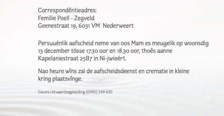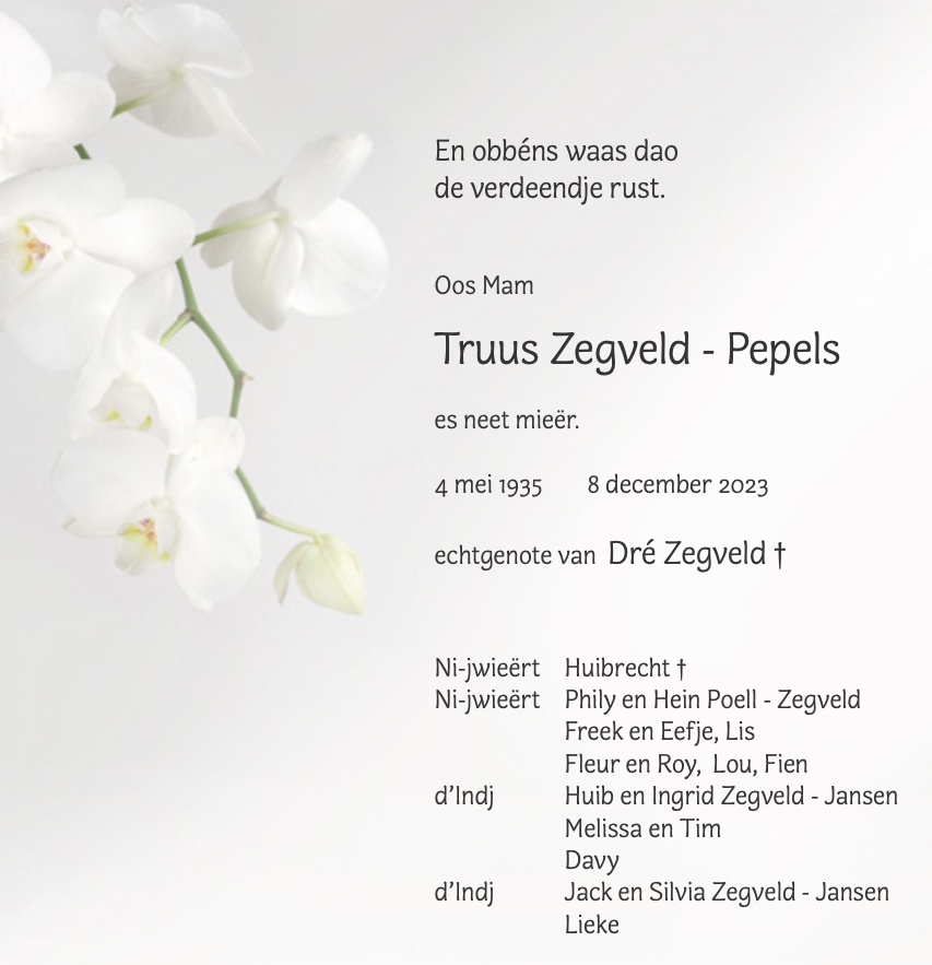 Overlijdensbericht | Truus Zegveld – Pepels †