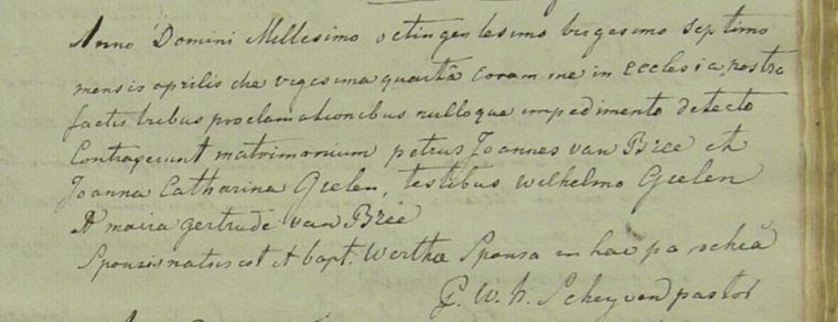“In het jaar van de Heer 1837 april 24 zijn in mijn tegenwoordigheid Petrus Joannes van Bree en Joanna Catharina Geelen na drie roepen in onze kerk die geen bezwaar aan het licht hebben gebracht een huwelijk aangegaan met als getuigen Wilhelmus Geelen en Maria Gertrude van Bree.