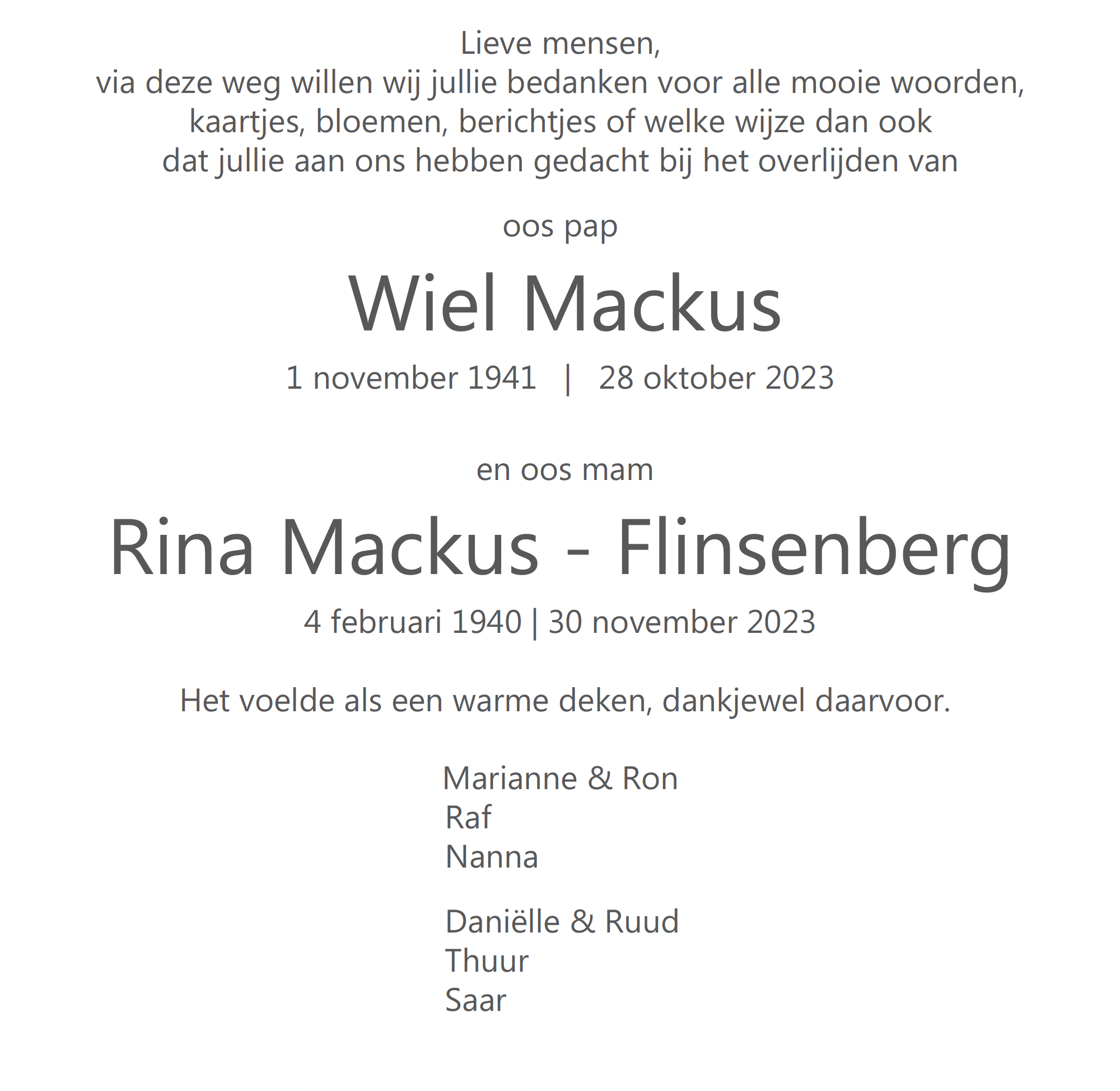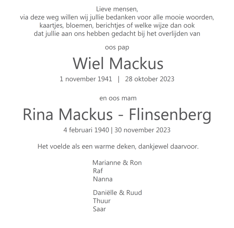 Dankbetuiging Wiel Mackus en Rina Mackus – Flinsenberg