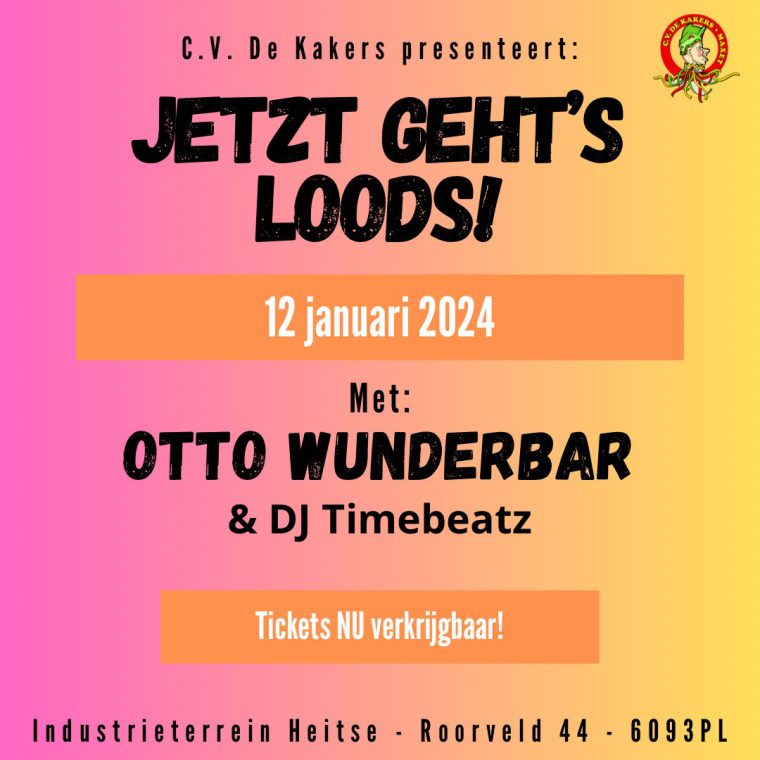 Op vrijdag wordt het feestweekend afgetrapt met Jetzt Geht’s Loods! Het beloofd een gezellige avond te gaan worden welke worden verzorgd met optredens van onder andere Otto Wunderbar en DJ Timebeatz. Er zijn nog enkele tickets verkrijgbaar: kijk hiervoor op de facebook of instagram van CV de Kakers!