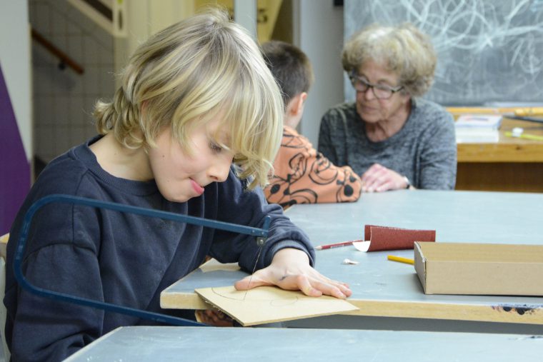Deze week vormt het surrealisme de inspiratie voor een kunstwerk. Deze kunststroming gaat uit van het absurde. Docente Emmy vertaalt de kunststijl naar kindertaal. “Waar droom je van? Dat wat er in je hoofd zit, gaan we maken van hout en karton. Die materialen vormen dan een ‘reliëf’ op een ondergrond.” De kinderen kijken enthousiast naar het voorbeeld van docente Emmy en gaan vervolgens aan de slag met de figuurzaag.
