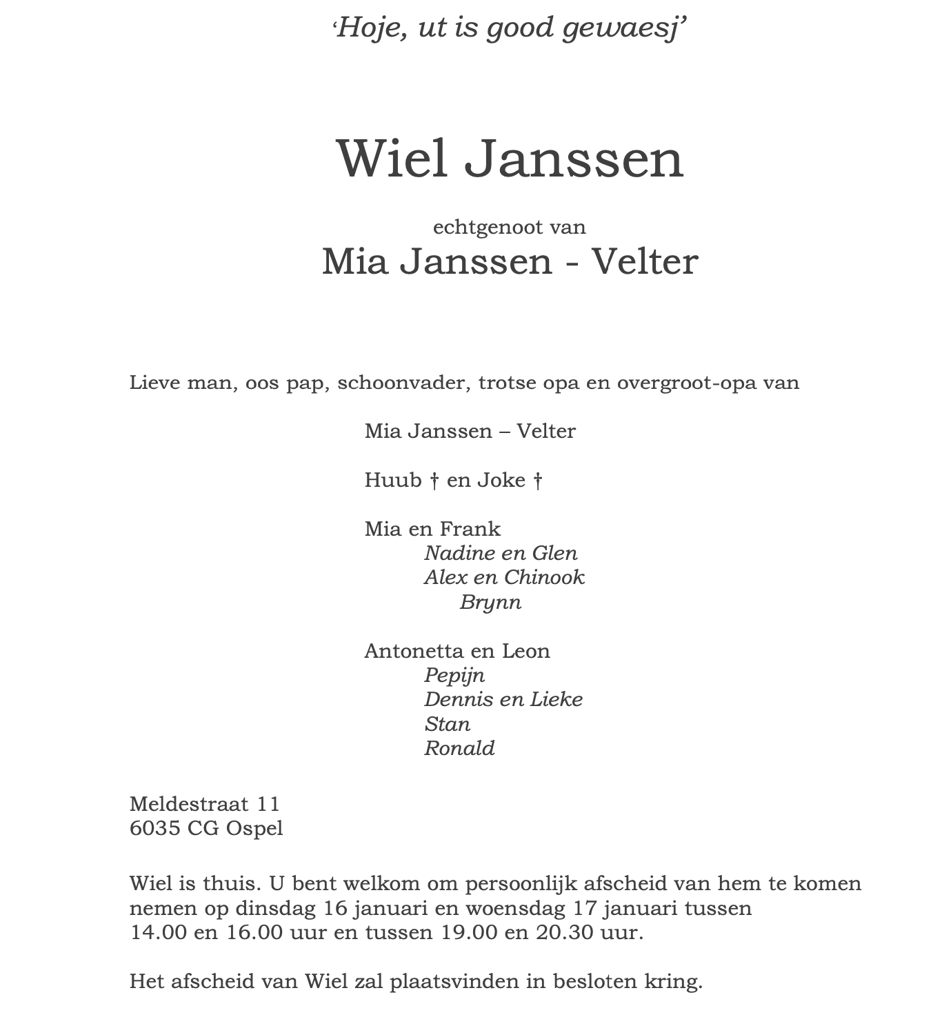 Mia, kinderen en kleinkinderen gecondoleerd met het overlijden van Wiel.