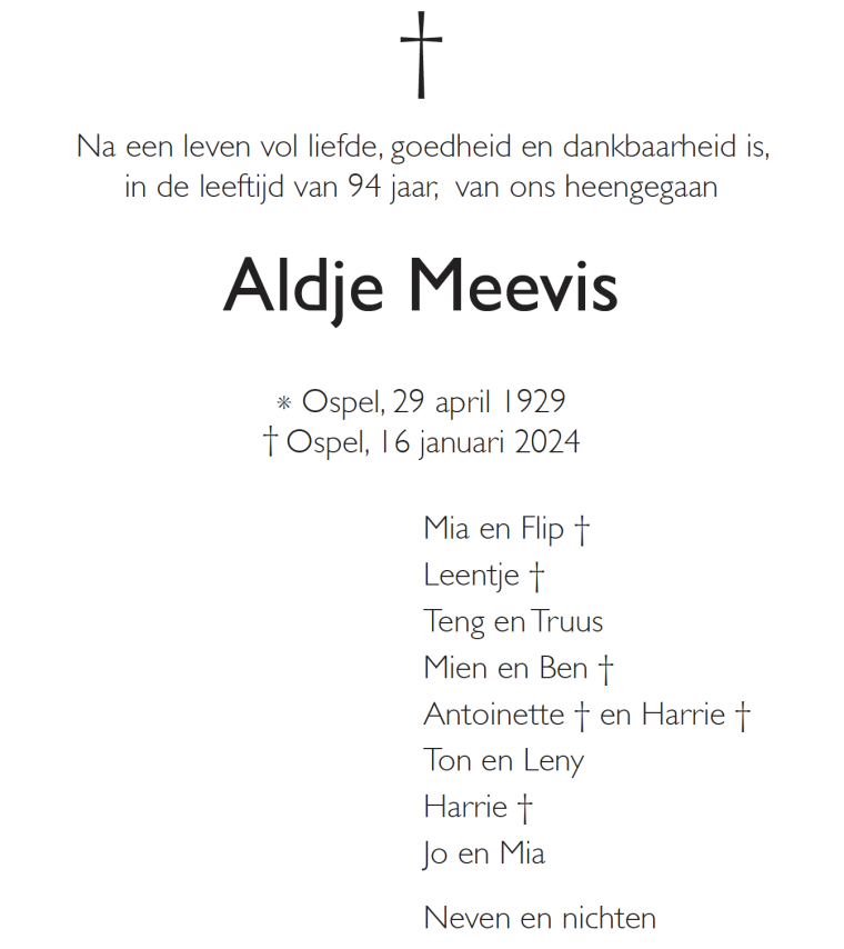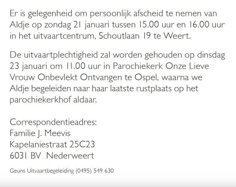 2. Fam. Meevis veel sterkte gewenst bij het afscheid van jullie (schoon)zus en tante Aldje.