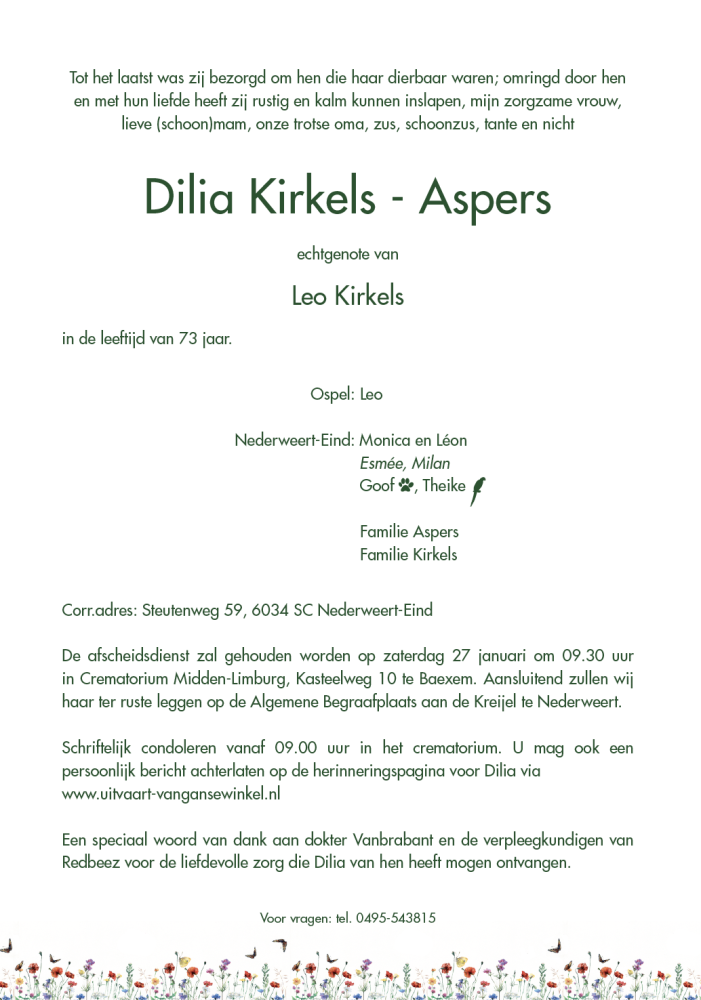 Overlijdensbericht: Dilia Kirkels – Aspers †