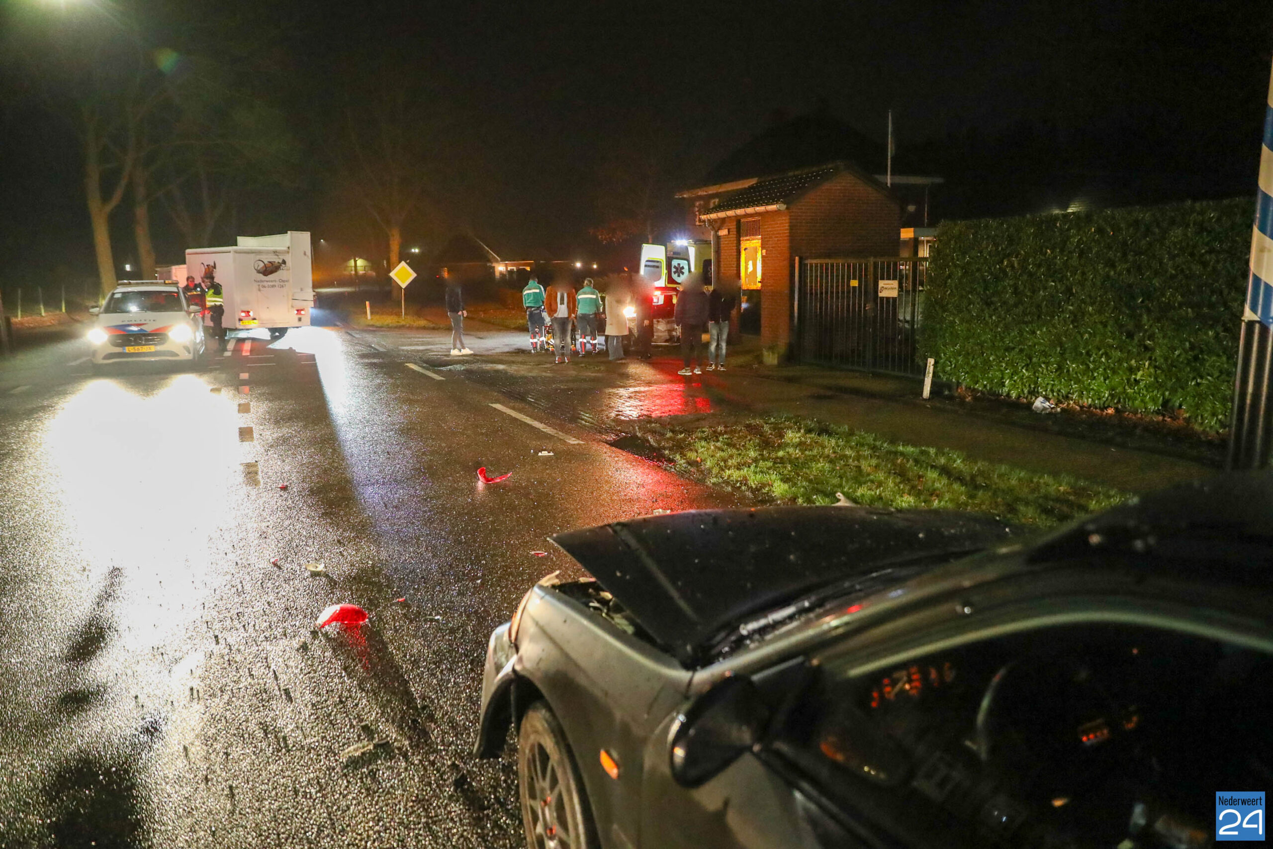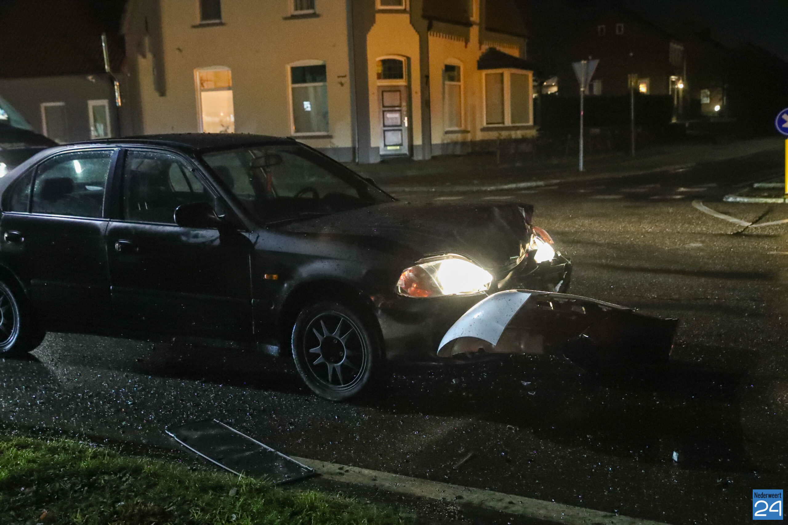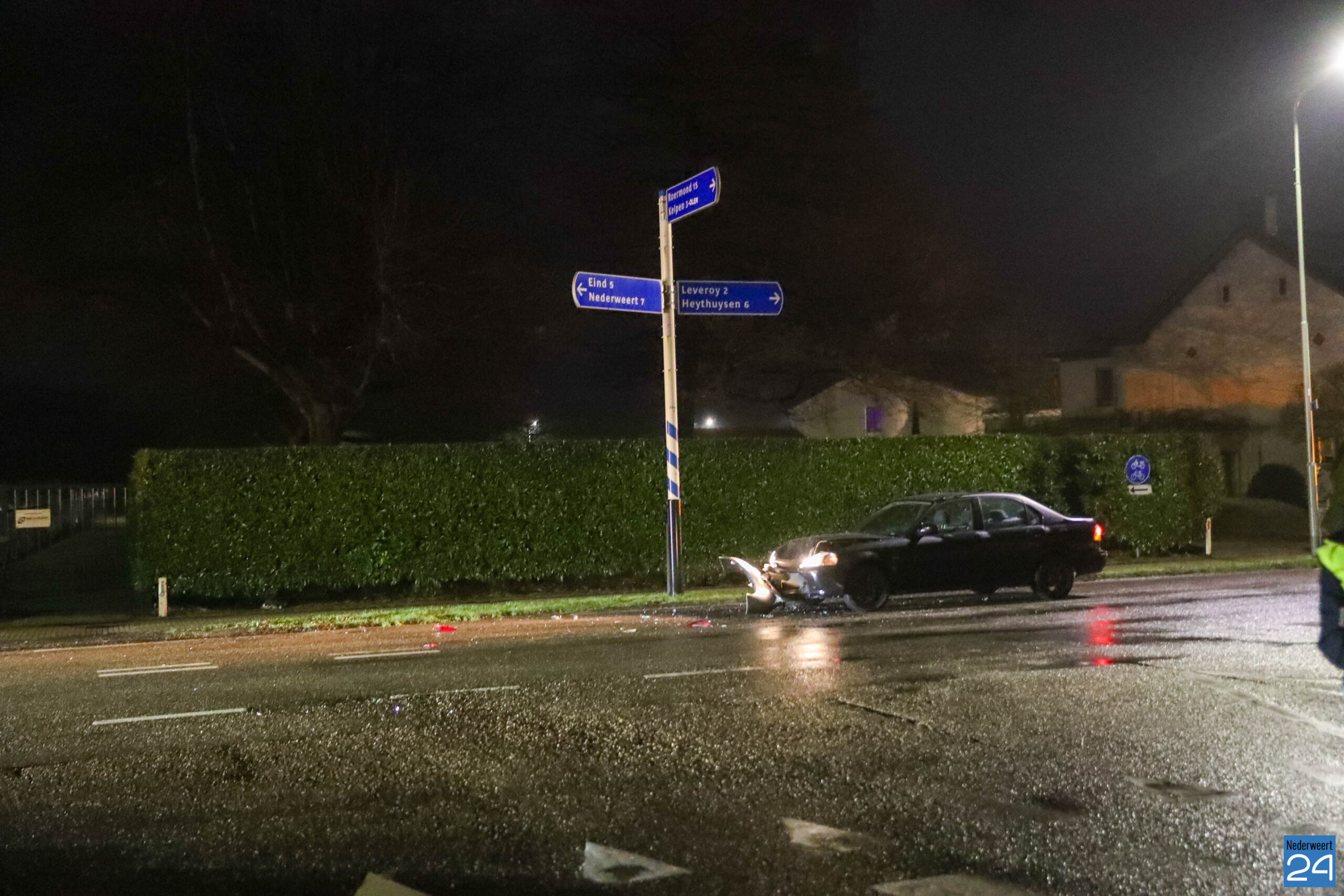 Beide voertuigen reden vanuit Leveroy in de richting van Nederweert. Op de T-splitsing kwam het tot een botsing waarbij één van de auto’s zijn voorganger hard raakte. De impact was zo groot dat de voorste auto van de weg werd geduwd, over het fietspad schoot en uiteindelijk naast een stroomhuisje tot stilstand kwam.