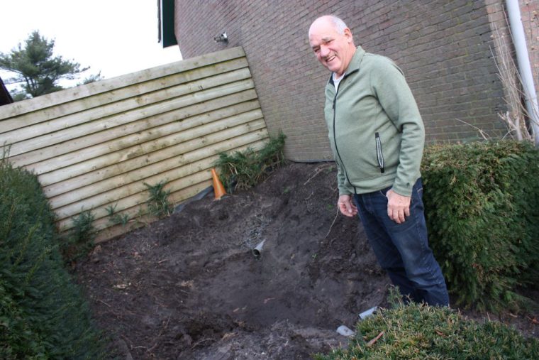 Theu Briels heeft daarom naast de woning een plek uitgegraven voor een wadi die zo’n 3.000 liter hemelwater kan opvangen. Water dat vervolgens weer in de bodem kan sijpelen. Er werd een sleuf gegraven, waar rioleringsbuizen in liggen die aansluiten op de wadi. Hiervoor stak Theu zelf de handen uit de mouwen. “Een paar dagen werk. De uitgegraven grond kon ik bij mijn zoon kwijt. Ik moest alleen door een laag puin graven die onder de oprit lag. Dat zorgde voor wat extra zweetdruppels.”