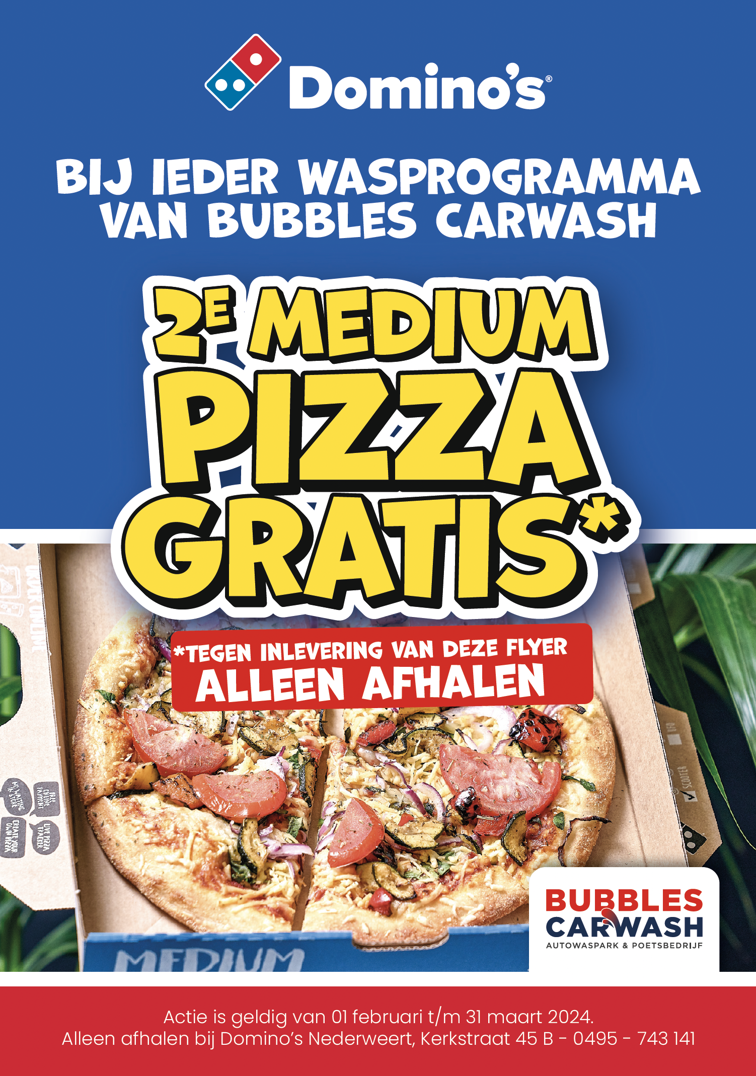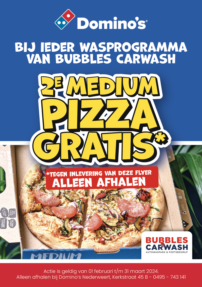 Bubbles Carwash en Domino’s Pizza Nederweert hebben een smakelijke en leuke actie voor hun klanten. Was je jouw auto bij Bubbles Carwash dan krijg je een voucher waarmee je jouw 2e medium pizza gratis krijgt! Dit geld alleen voor het afhalen van pizza’s.