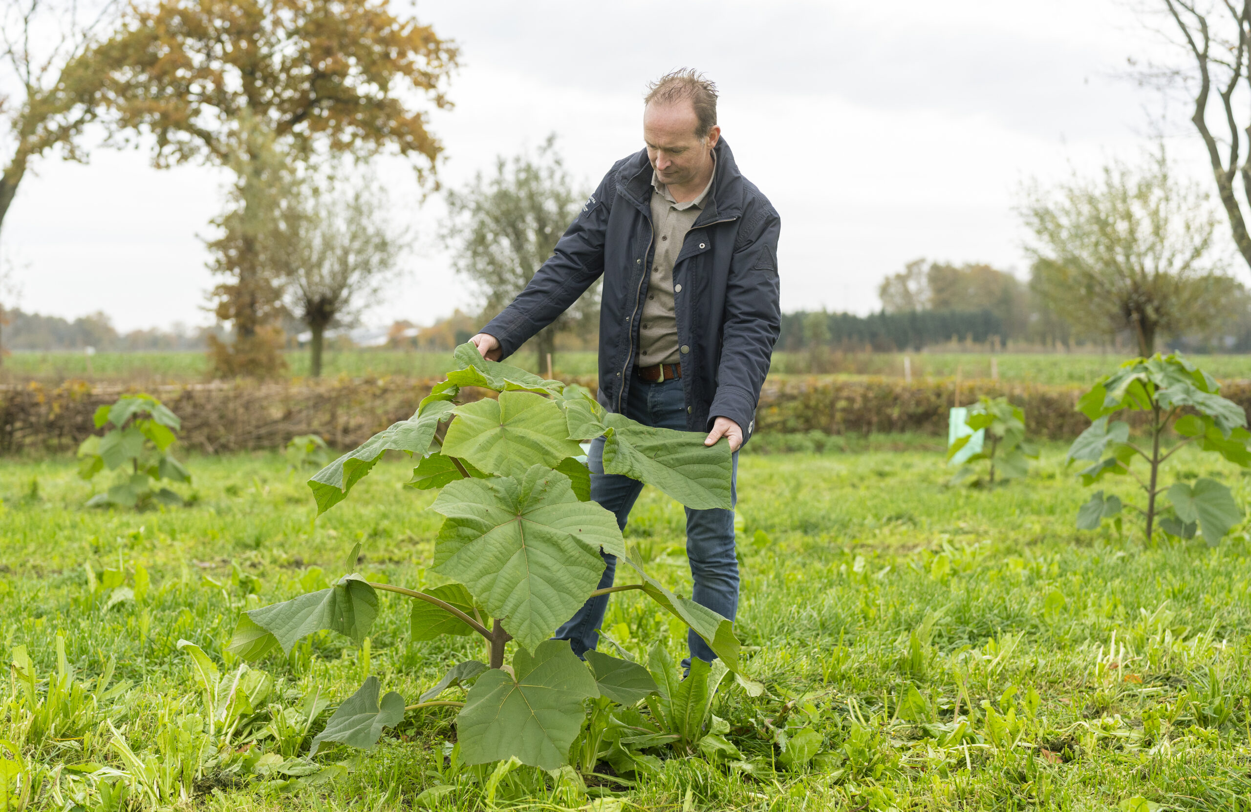 Hij wijst naar een Kiriboompje, recht voor hem op de akker. “In slechts zeven jaar tijd groeit-ie uit tot een boom van wel tien meter hoog met een doorsnede van veertig centimeter. De Kiri, ook wel Paulowna genoemd, houdt veel meer CO₂ vast dan andere bomen. Hij bevordert de biodiversiteit, verrijkt de bodem, houdt het water vast en draagt ook nog bij aan een oplossing voor het stikstofprobleem. Sterker nog: als alle akkerbouwers in Nederland op vijf procent van hun akkers Kiribomen planten, is dit probleem opgelost”.