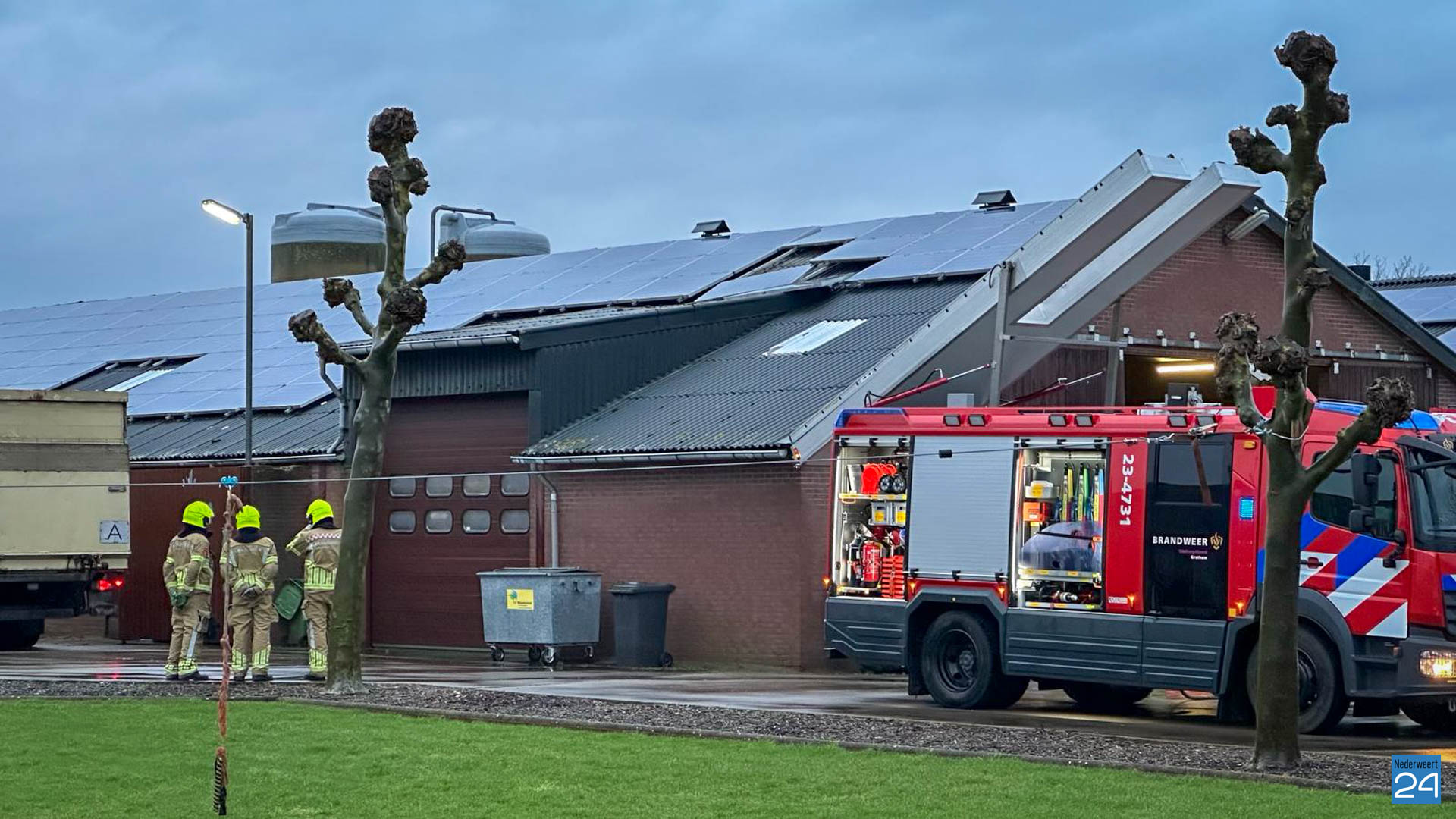 De hoogwerker vanuit Roermond kwam ter plaatse om te kijken hoe de zonnepanelen er bij liggen om te voorkomen dat ze eventueel wegwaaien of kortsluiting veroorzaken.