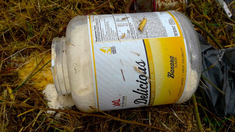 Deze krachtpatser had geen zin meer in de bananensmaak van zijn voedingssupplement. De Kampersweg in Ospel leek blijkbaar een goede plek om dit achter te laten.