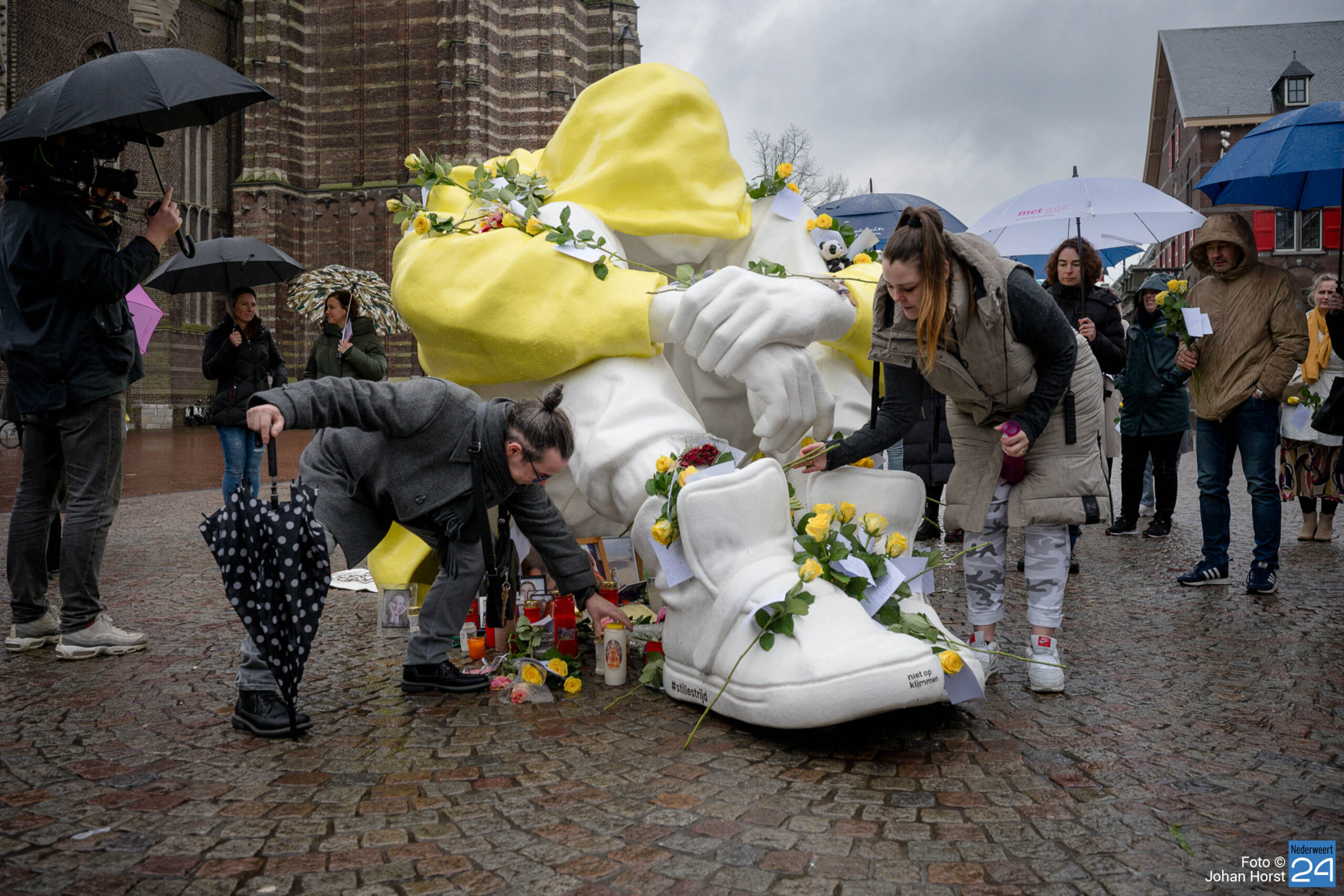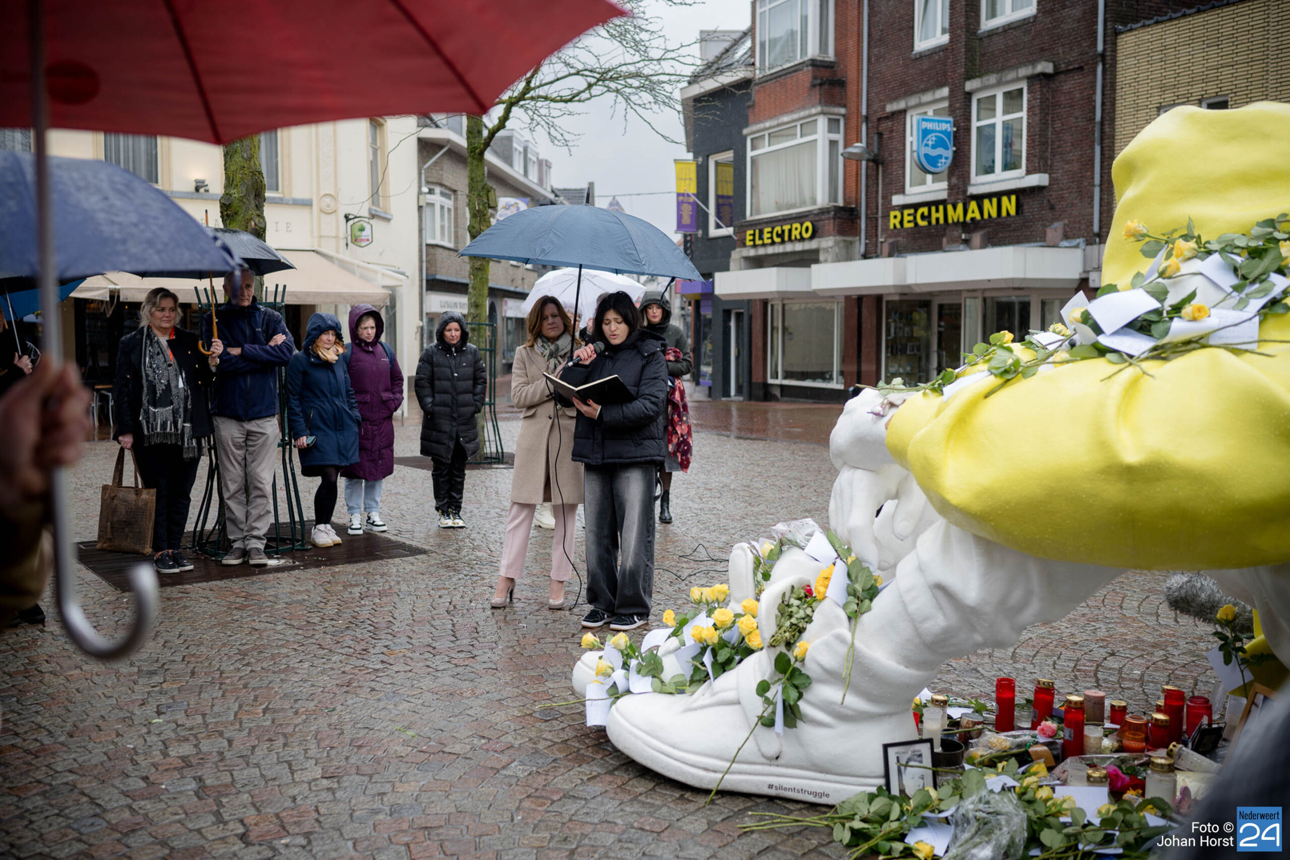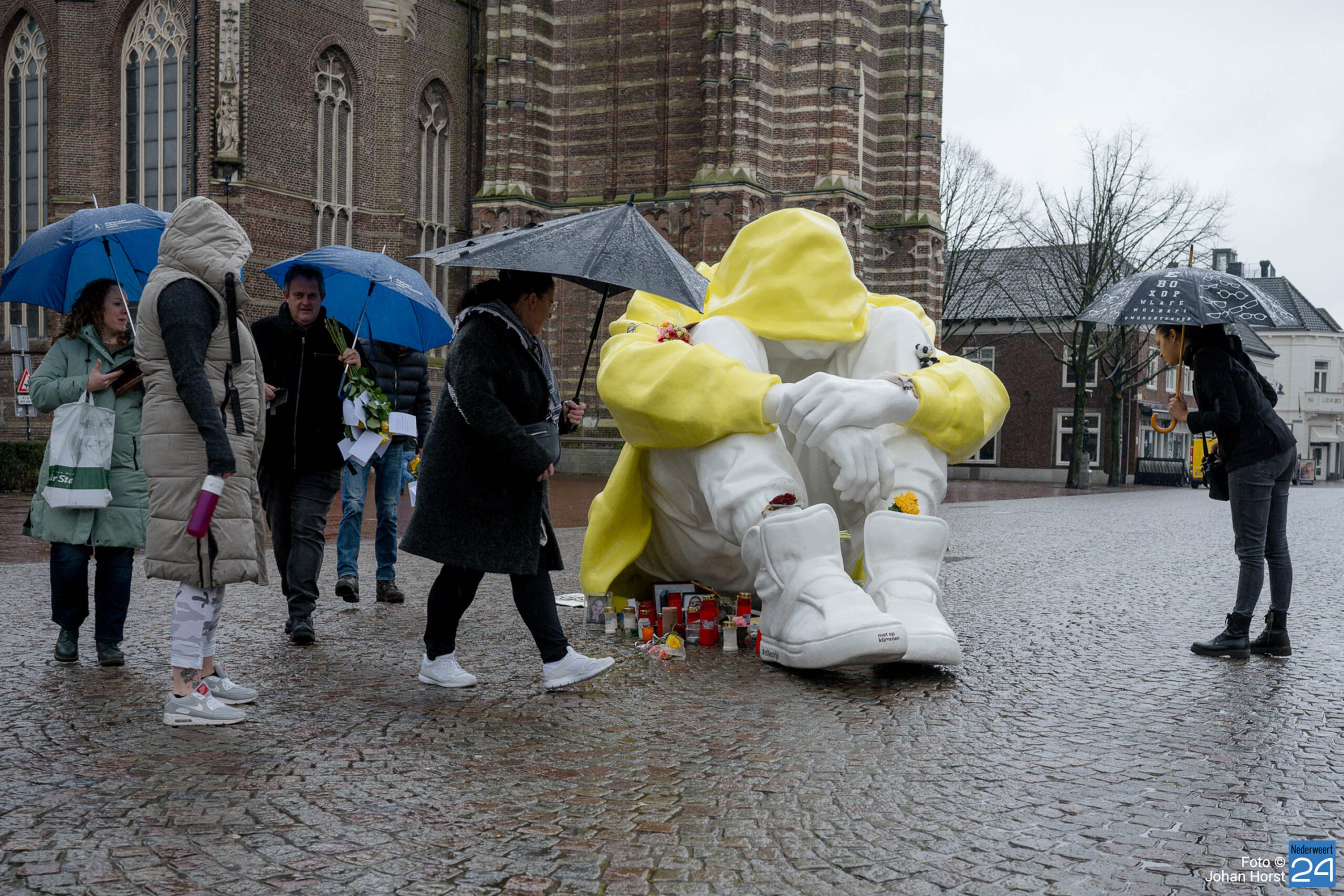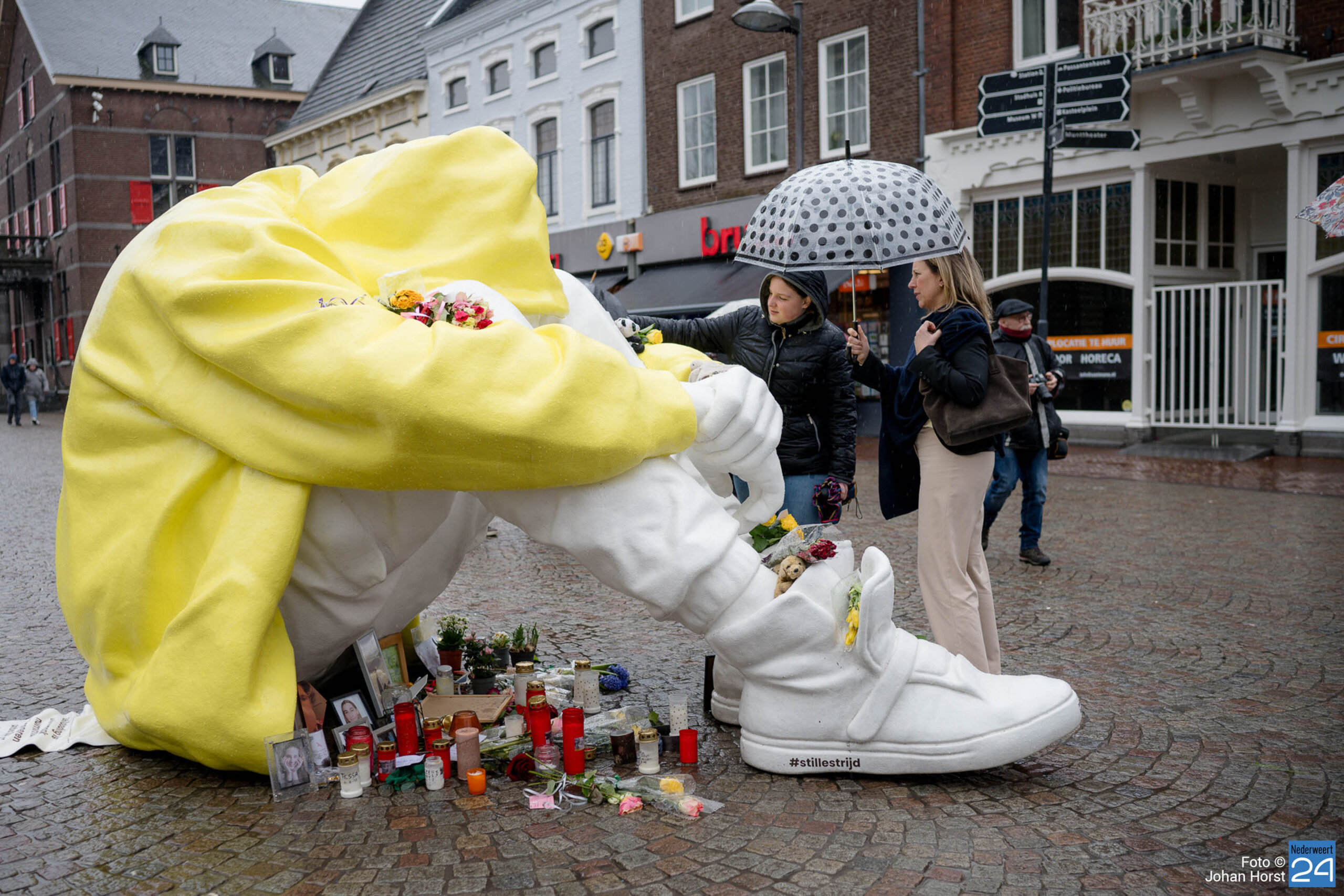 Van 26 februari tot 10 maart staat het beeld ‘Stille Strijd‘ op de Markt in Weert. Het beeld van een in elkaar gedoken jongere staat symbool voor de innerlijke strijd die veel depressieve jongeren voeren. Het beeld is van verre zichtbaar door zijn grote afmeting van zo’n 2,5 meter hoog en 4 meter lang en zijn felle, gele kleur.