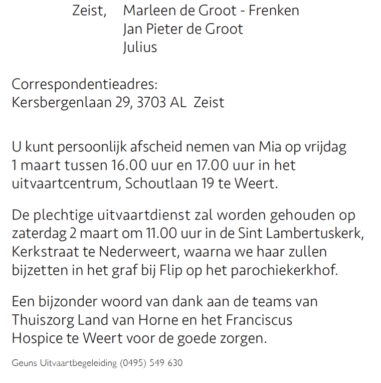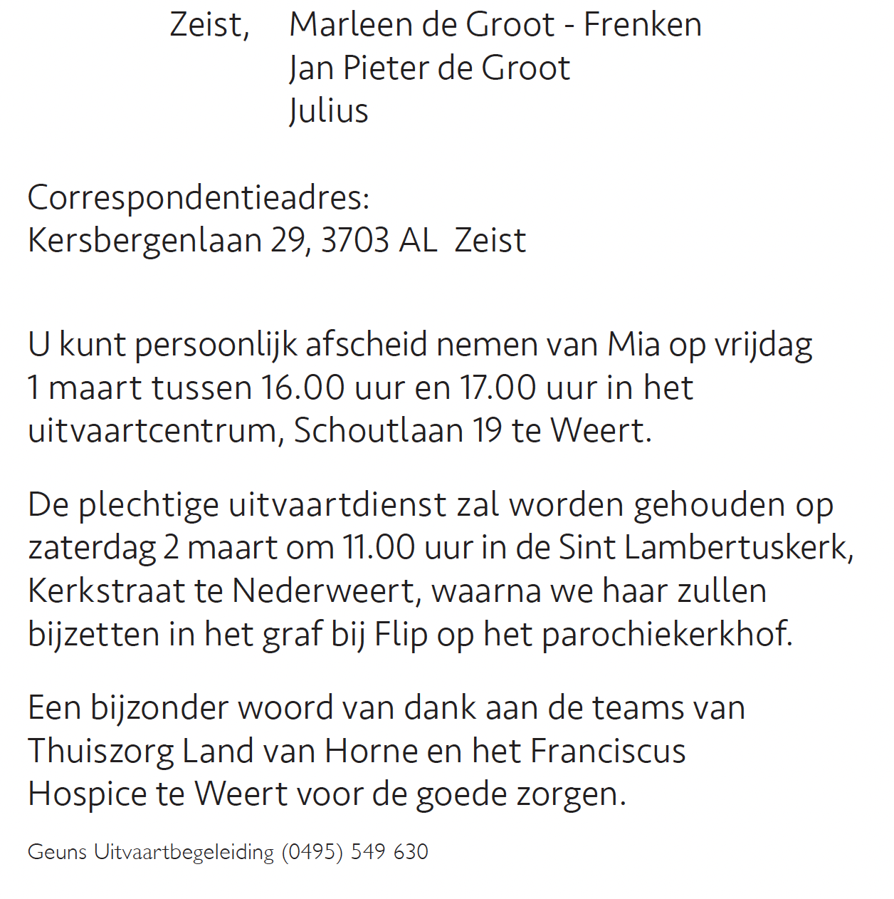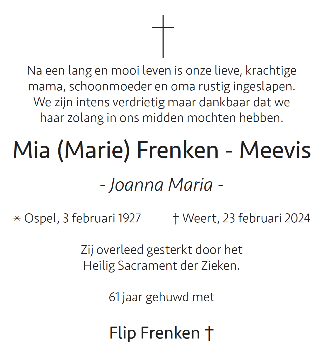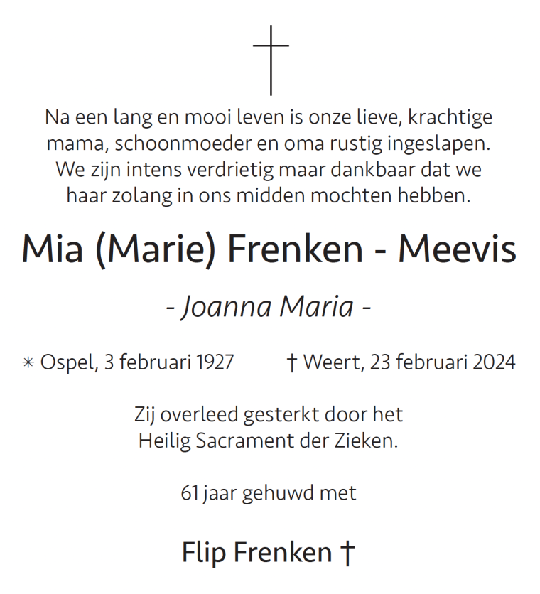 Overlijdensbericht | Mia (Marie) Frenken – Meevis †
