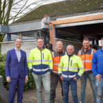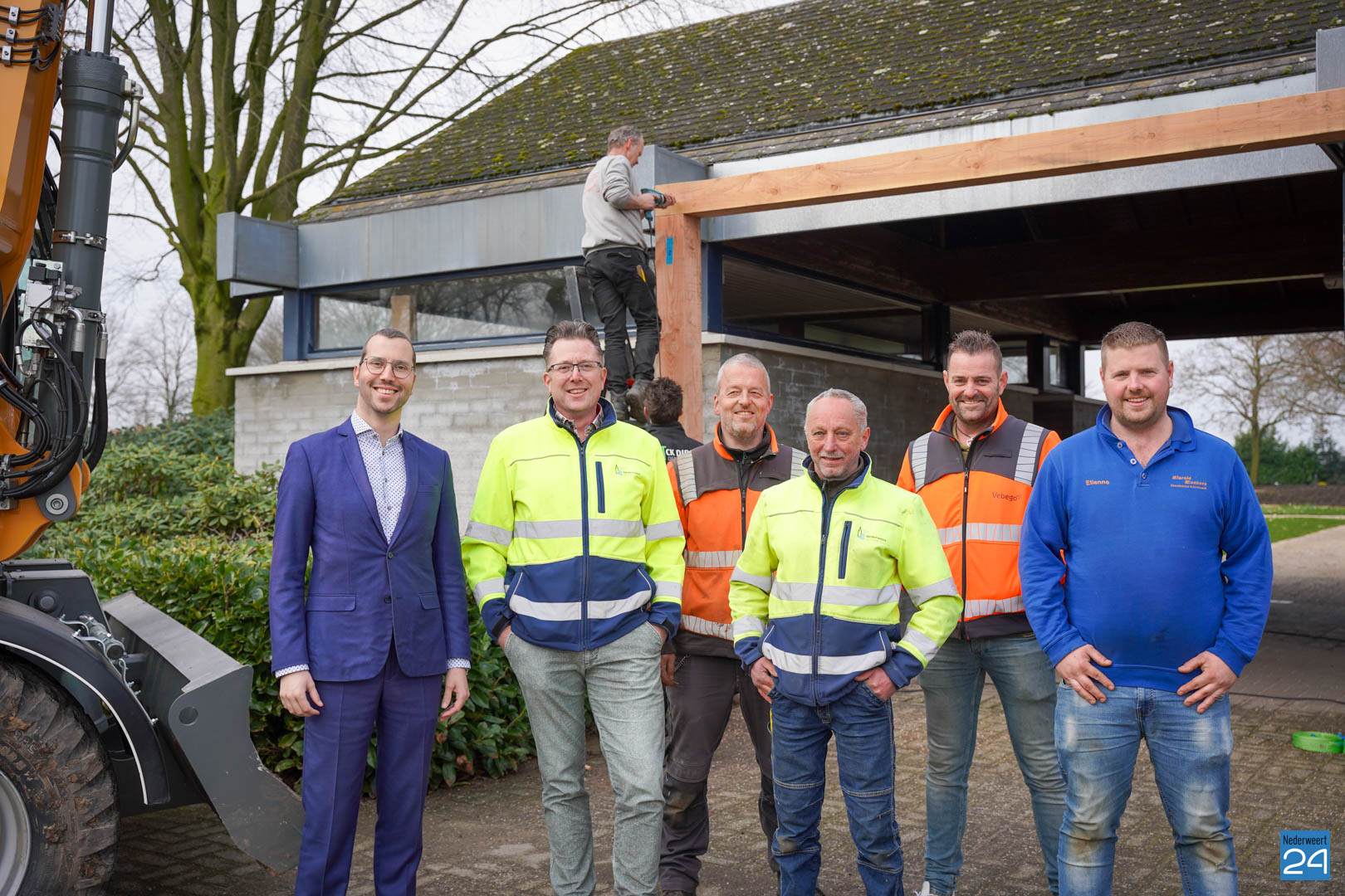 Op de foto v.l.n.r.: Wethouder Jorik Franssen, Bram Rulkens (gem. Nederweert), Ron Kessels (Vebego), Johan van Heugten (gem. Nederweert), Tim Schreurs (Vebego) en Etienne Demeijer (Donkers BV) aan de voorzijde van de algemene begraafsplaats