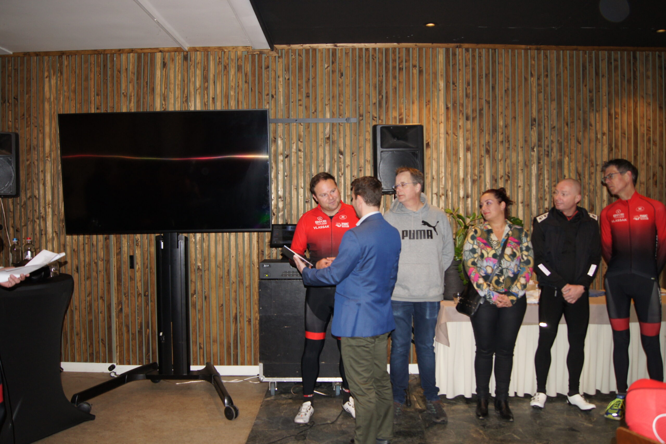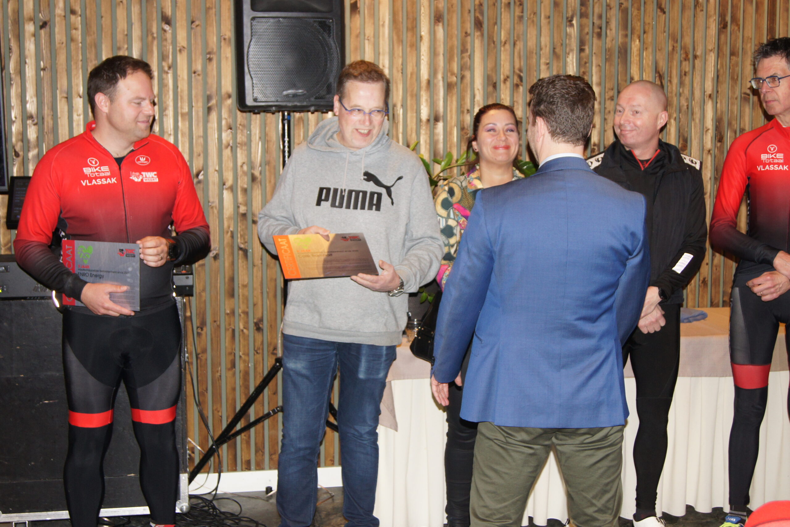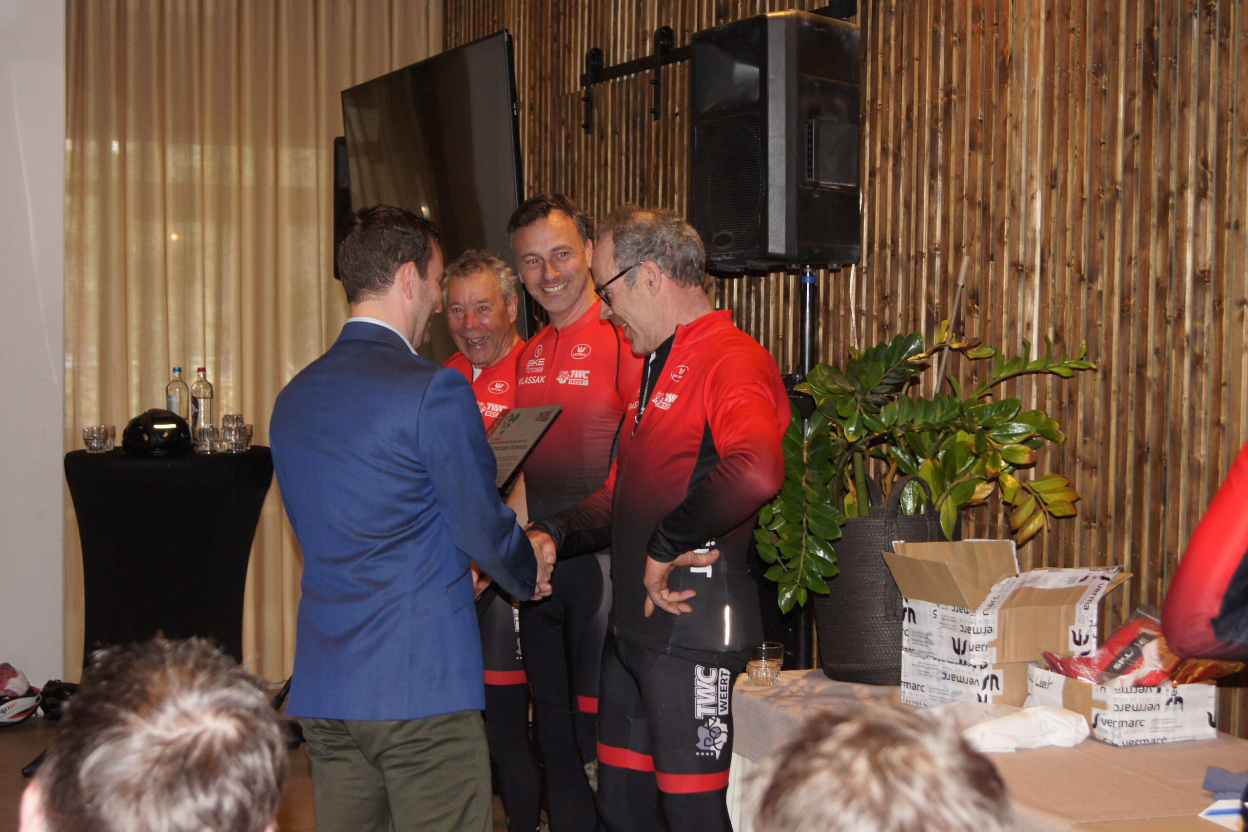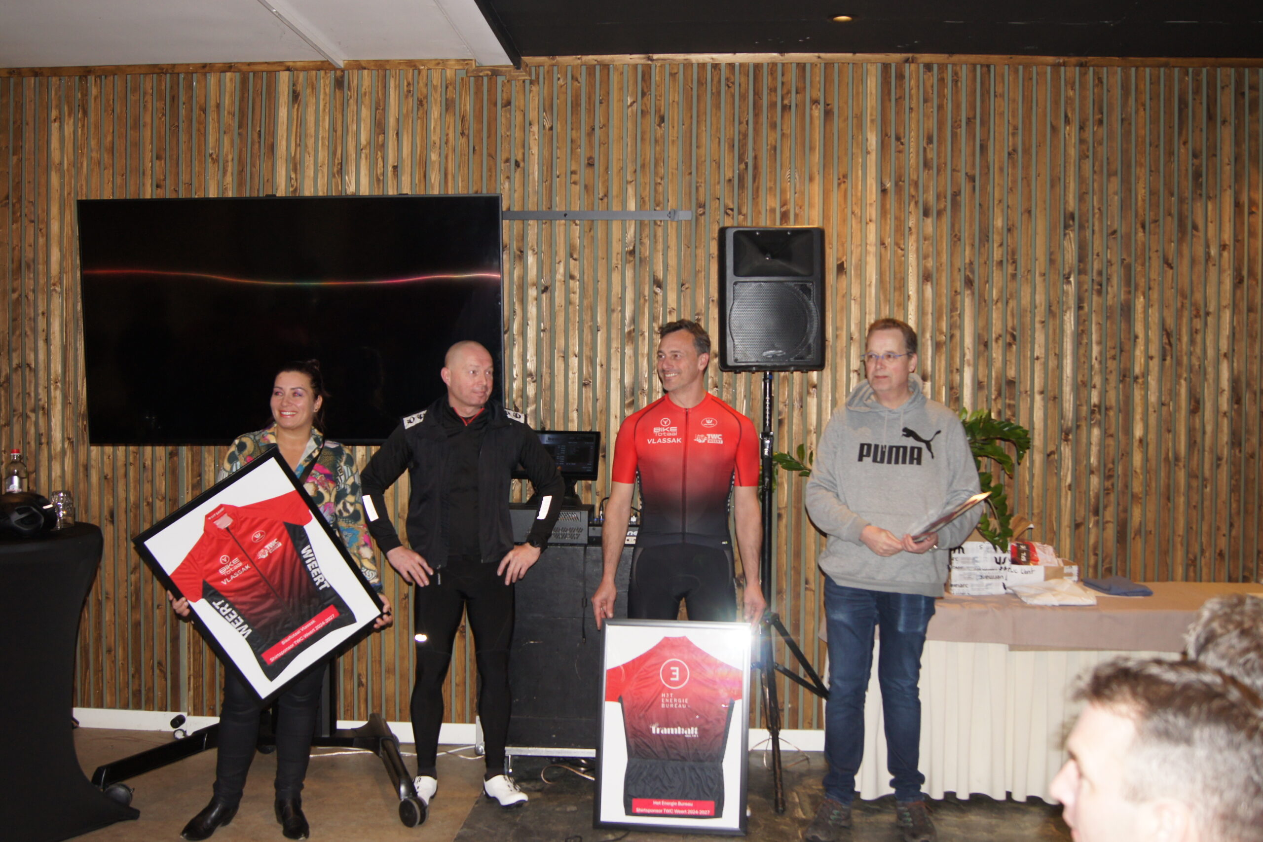 Na een heerlijk douche was Wethouder sport Martijn van den Heuvel weer present om de leden van TWC Weert en de aanwezige sponsoren toe te spreken. Daarna werden de drie shirtsponsors BikeTotaal Vlassak, Het EnergieBureau en café Tramhalt naar voren geroepen. Voorzitter TWC Weert; Johan Creemers bedankte de drie shirt-sponsors voor hun commitment en bijdrage aan het nieuw tenue waardoor het tenue kosteloos aan de leden beschikbaar gesteld konden worden. Als blijvende herinnering kregen alle drie de sponsors een Mock-up in lijst of in de vorm van een plakkaat uitgereikt die ze een plaats kunnen geven in hun onderneming.