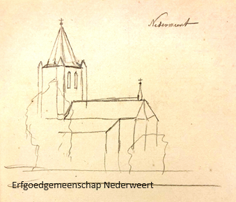 In 1873 waren er opnieuw landmeters actief in Nederweert. Een van hen maakte in zijn aantekenboekje een schets van de kerk van Nederweert, gezien vanaf de huidige Beuldersweg. Heel goed herkenbaar op die tekening is de toen nog aanwezige lage torenspits die in 1900 vervangen werd door de huidige ranke spits. Een ander opvallend detail – voor de fijnproevers – is het klokkentorentje op het middenschip, het zogenaamde ‘trömpke’ (‘trömpen’ is een oud dialectwoord voor klokkenluiden). Dat torentje staat tegenwoordig halverwege het middenschip, maar in 1873 stond het nog boven het priesterkoor, zoals de tekening fraai laat zien.