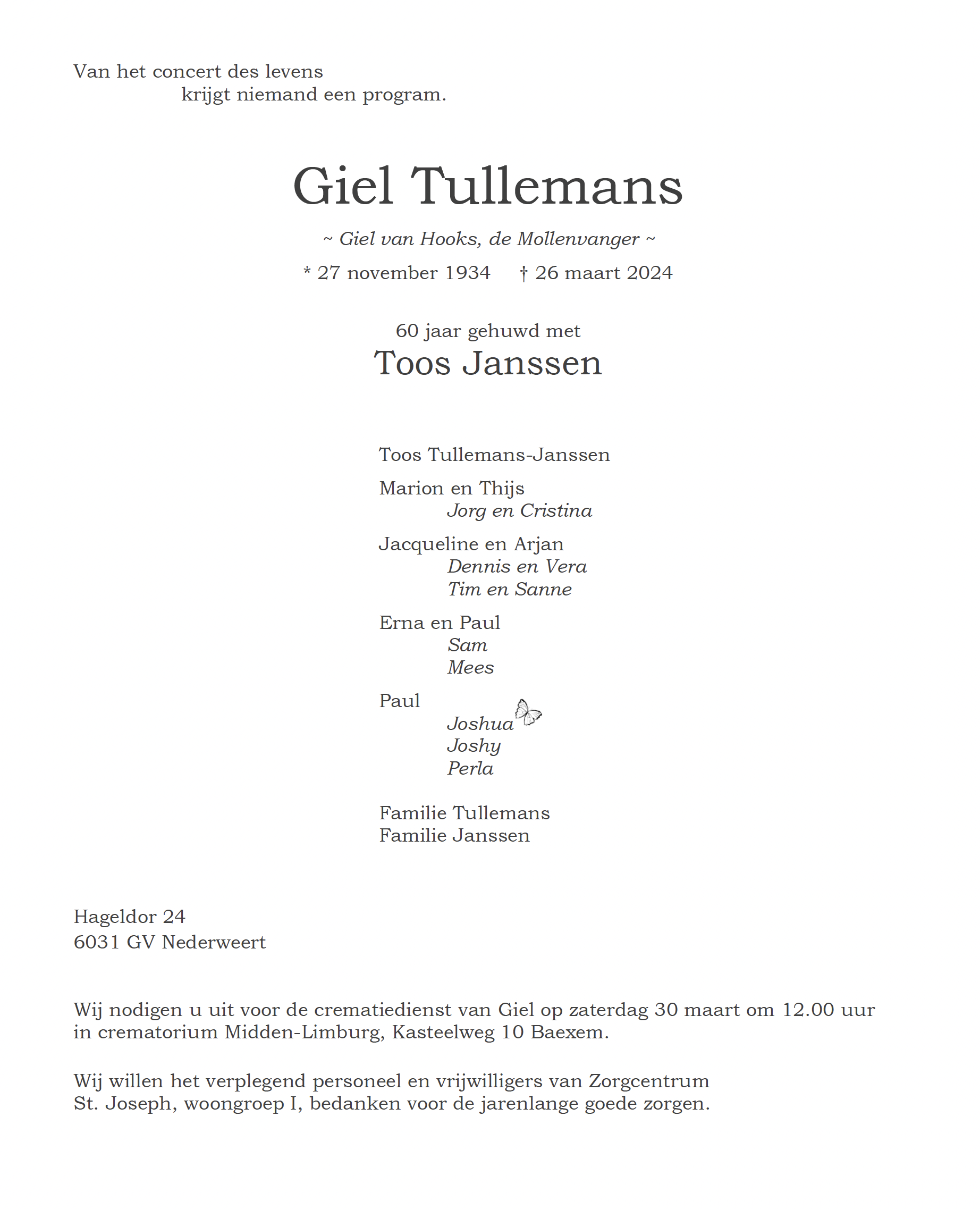 We wensen Toos, kinderen en kleinkinderen heel veel sterkte toe.