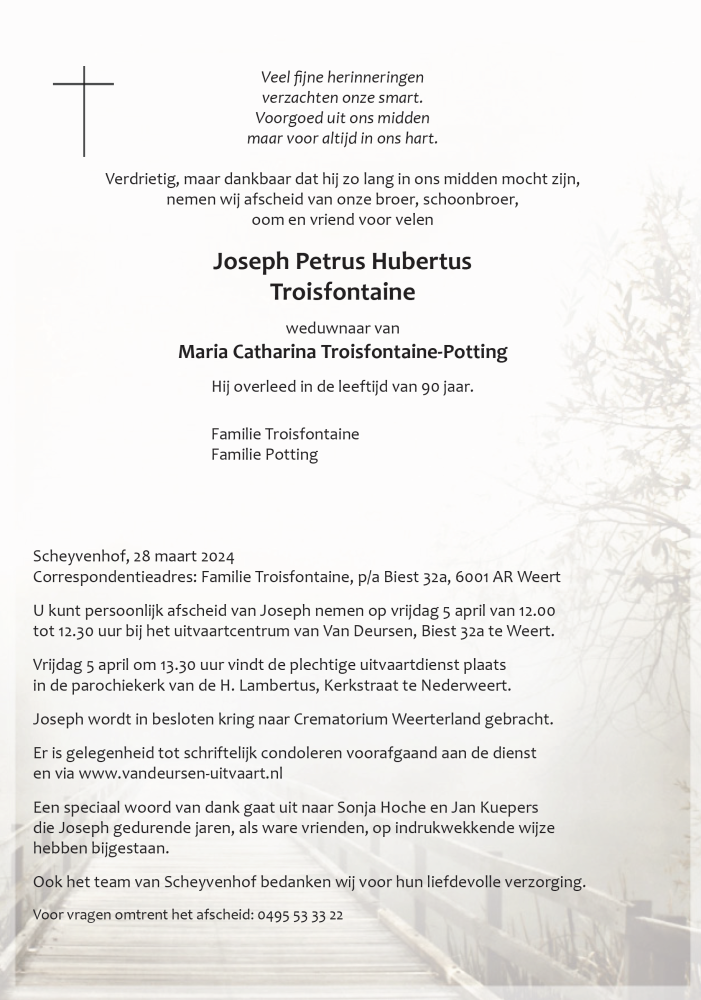 Overlijdensbericht | Joseph Petrus Hubertus Troisfontaine †