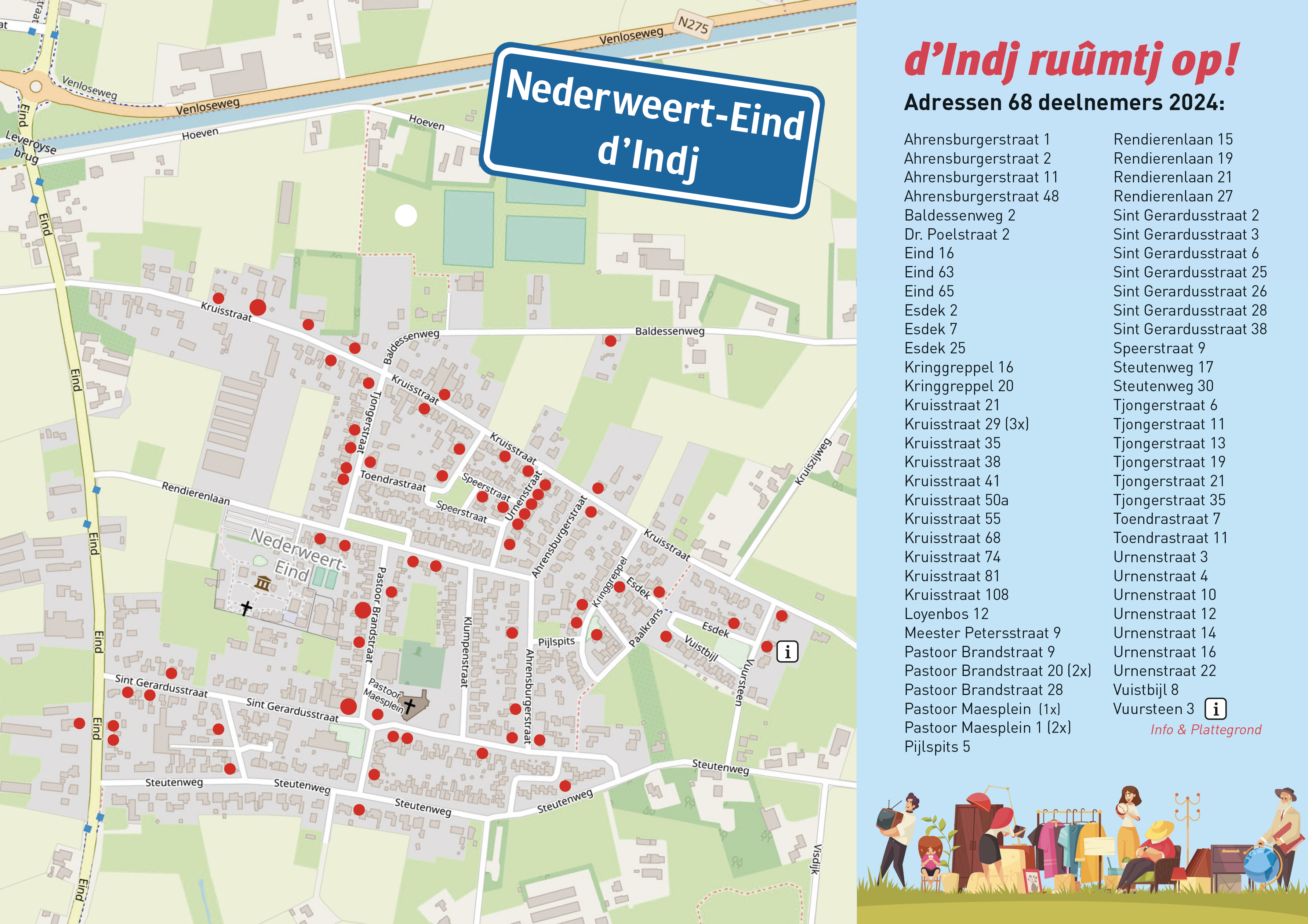 Inwoners van Eind hebben hun zolder opgeruimd en bieden hun overbodige spullen te koop aan vanaf hun voortuin, oprit of garage om deze een duurzaam tweede leven te geven. Deelnemers die buiten de kern wonen verkopen hun spullen vanaf het Pastoor Maesplein. Met bijna 70 deelnemers is er voor elk wat wils en zowel de toegang als het parkeren is gratis. De organisatie is in handen van de dorpsraad Eind.