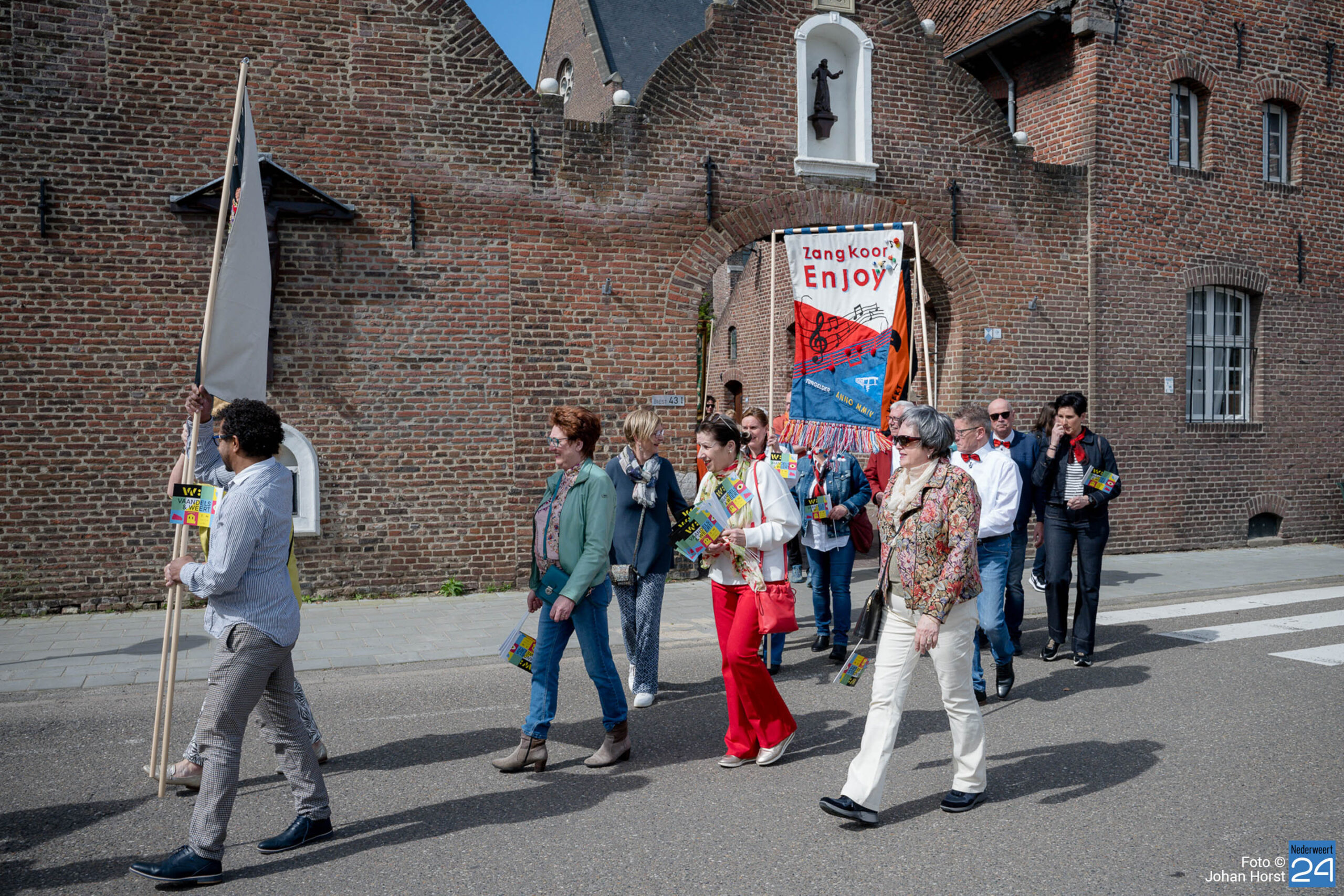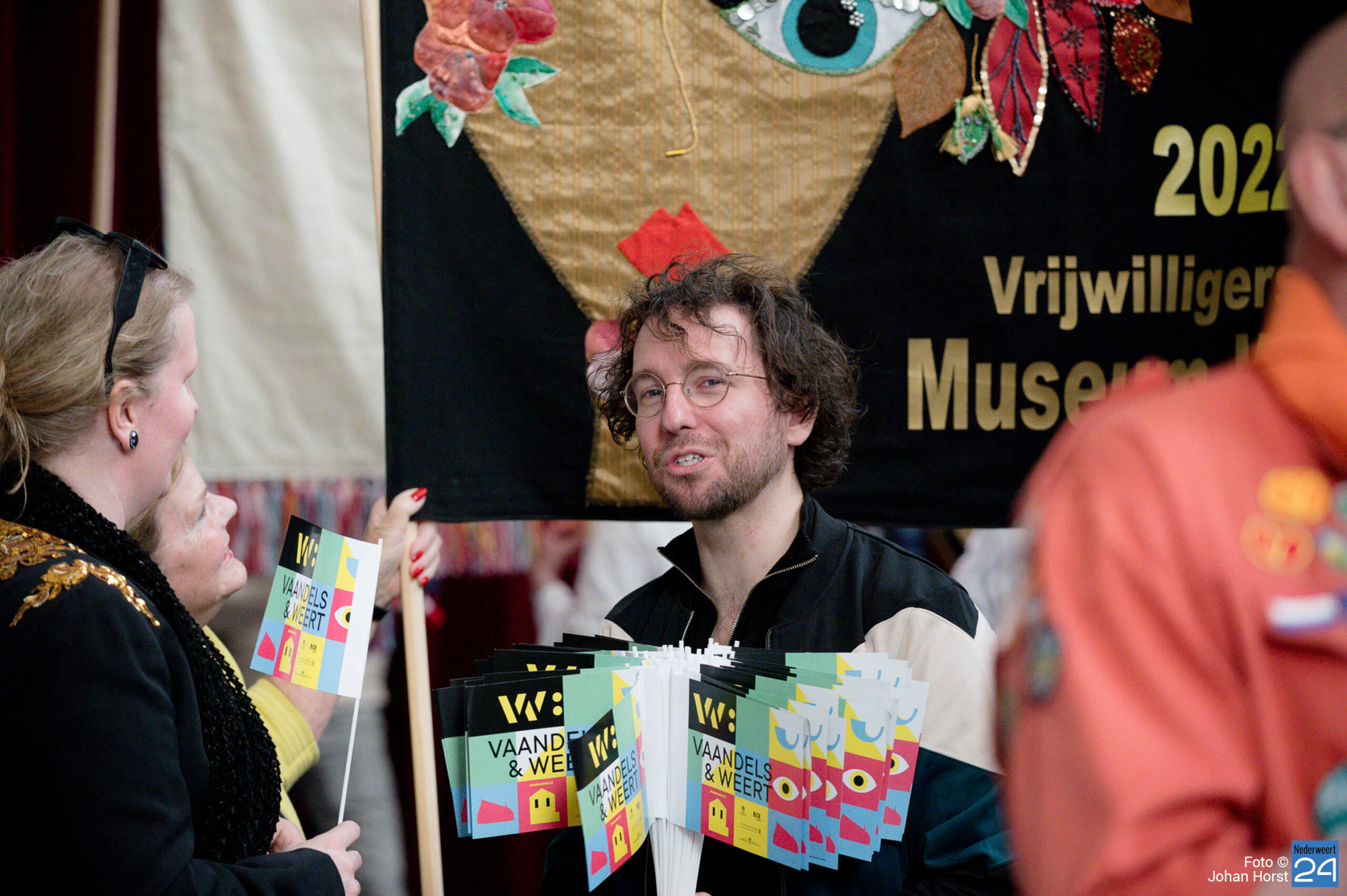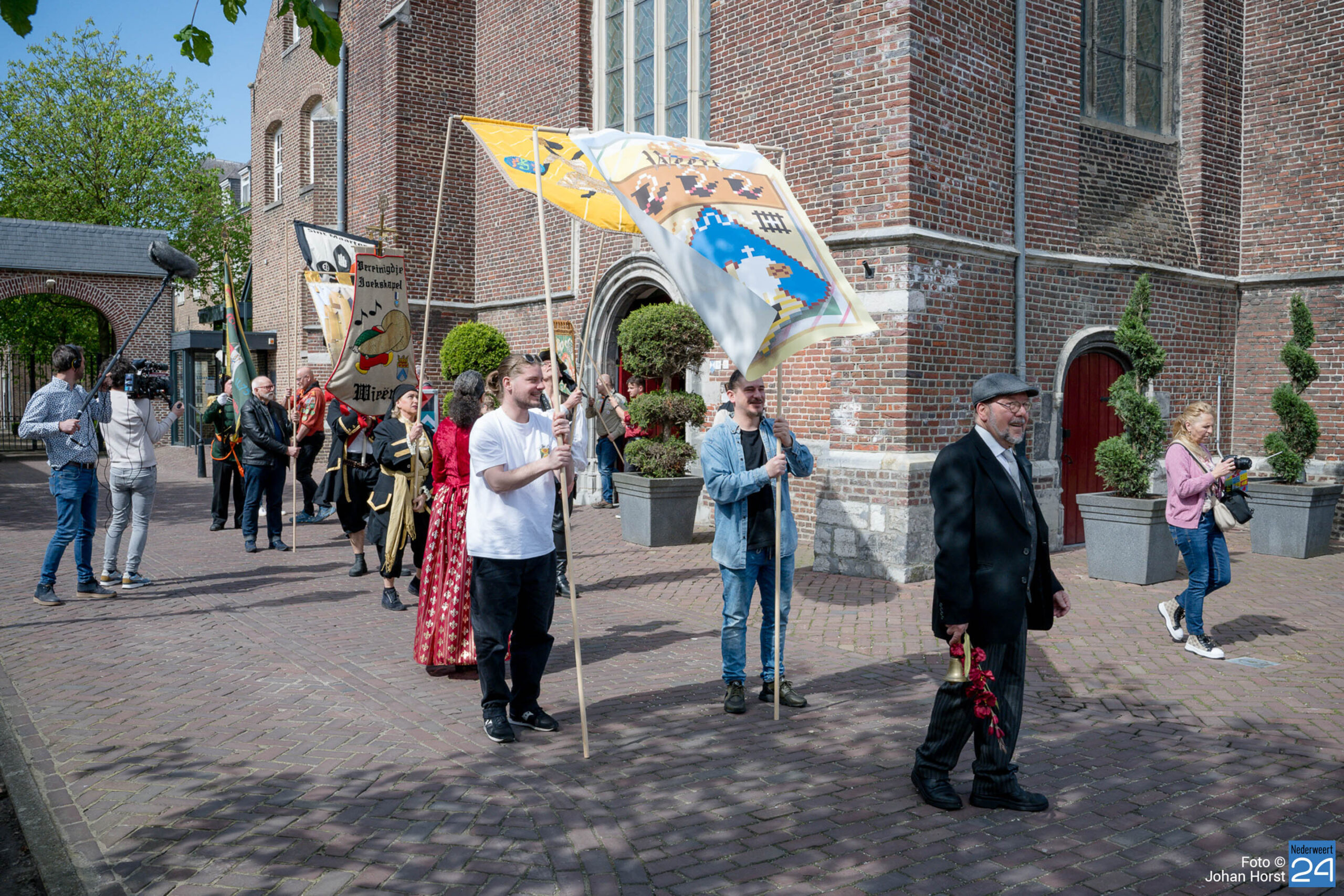 Er was veel belangstelling voor de historische en wat minder historische vaandels. Ze waren de afgelopen week al te bekijken in de Paterskerk. Vandaag gingen ze in een optocht door o.a. het park en langs Museum W. Daar werden ze toegezongen door Antje die wel in haar nopjes is met zoveel kleur.