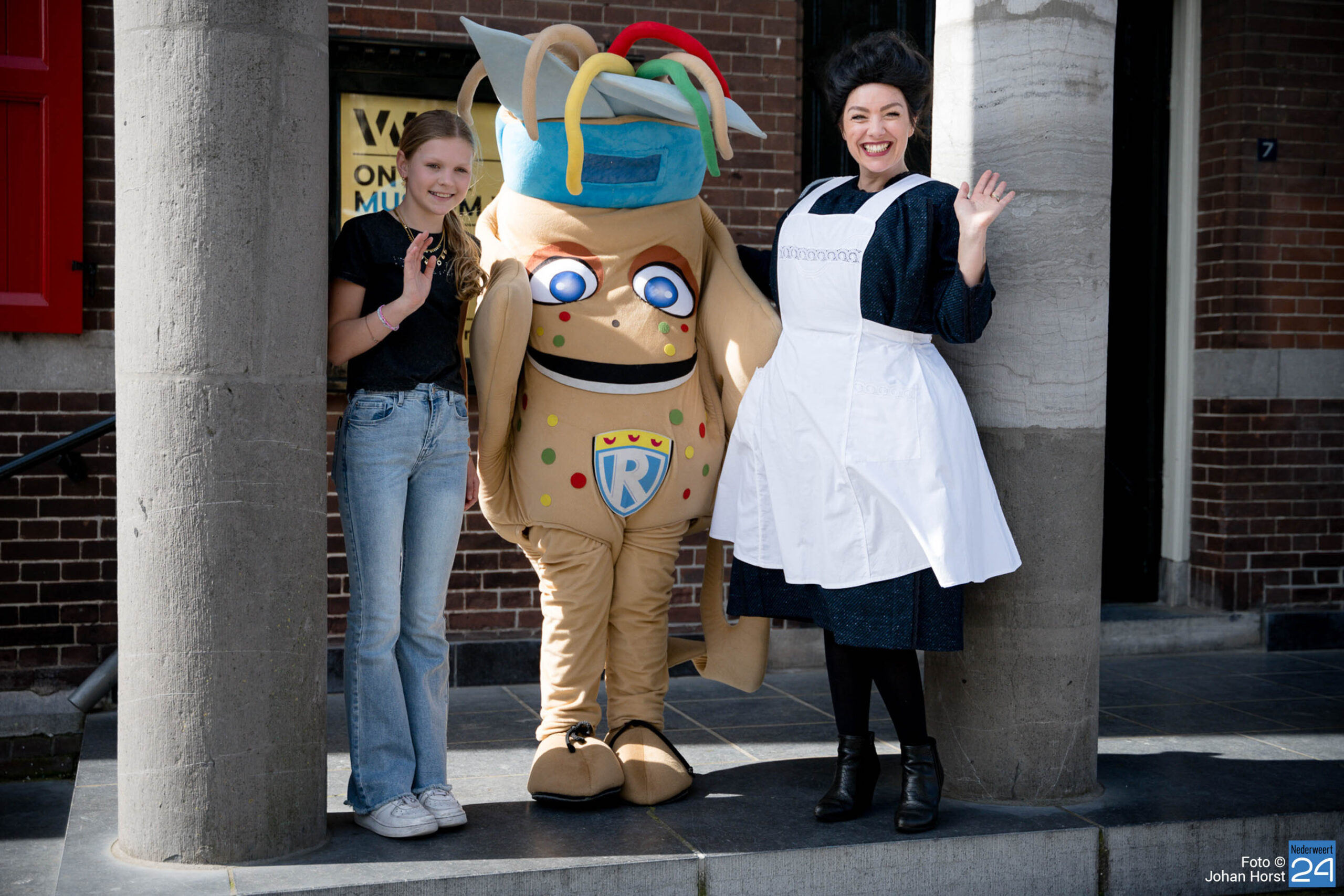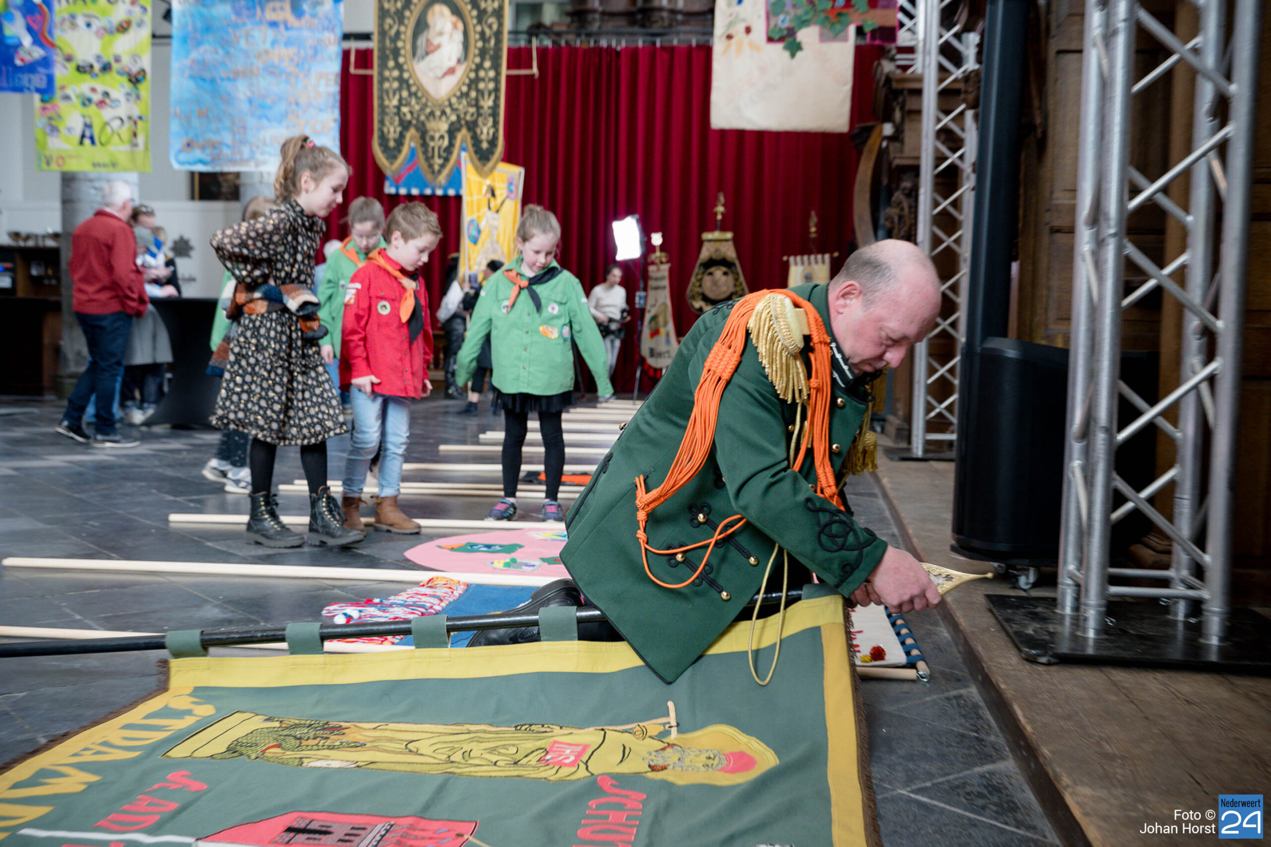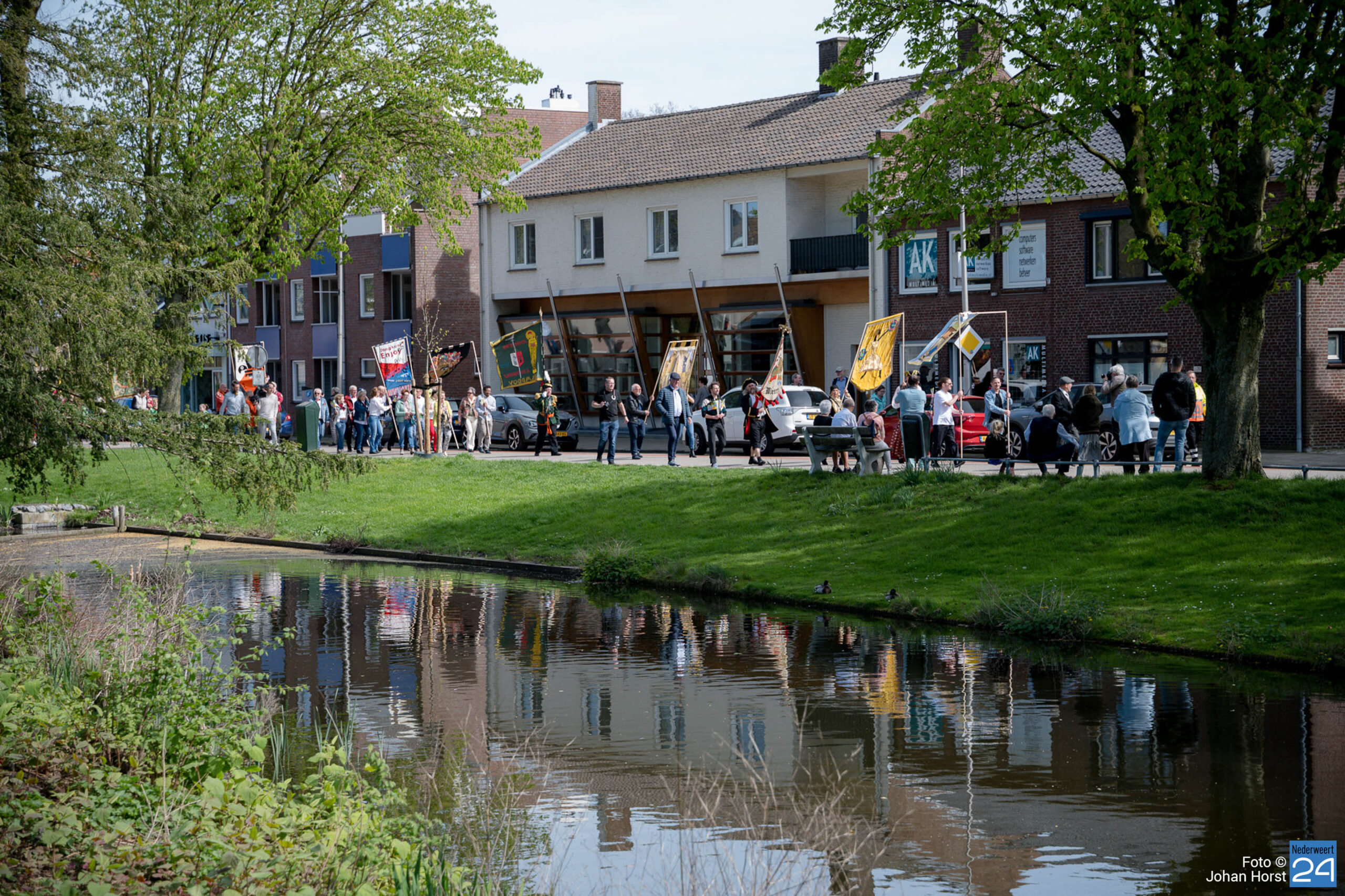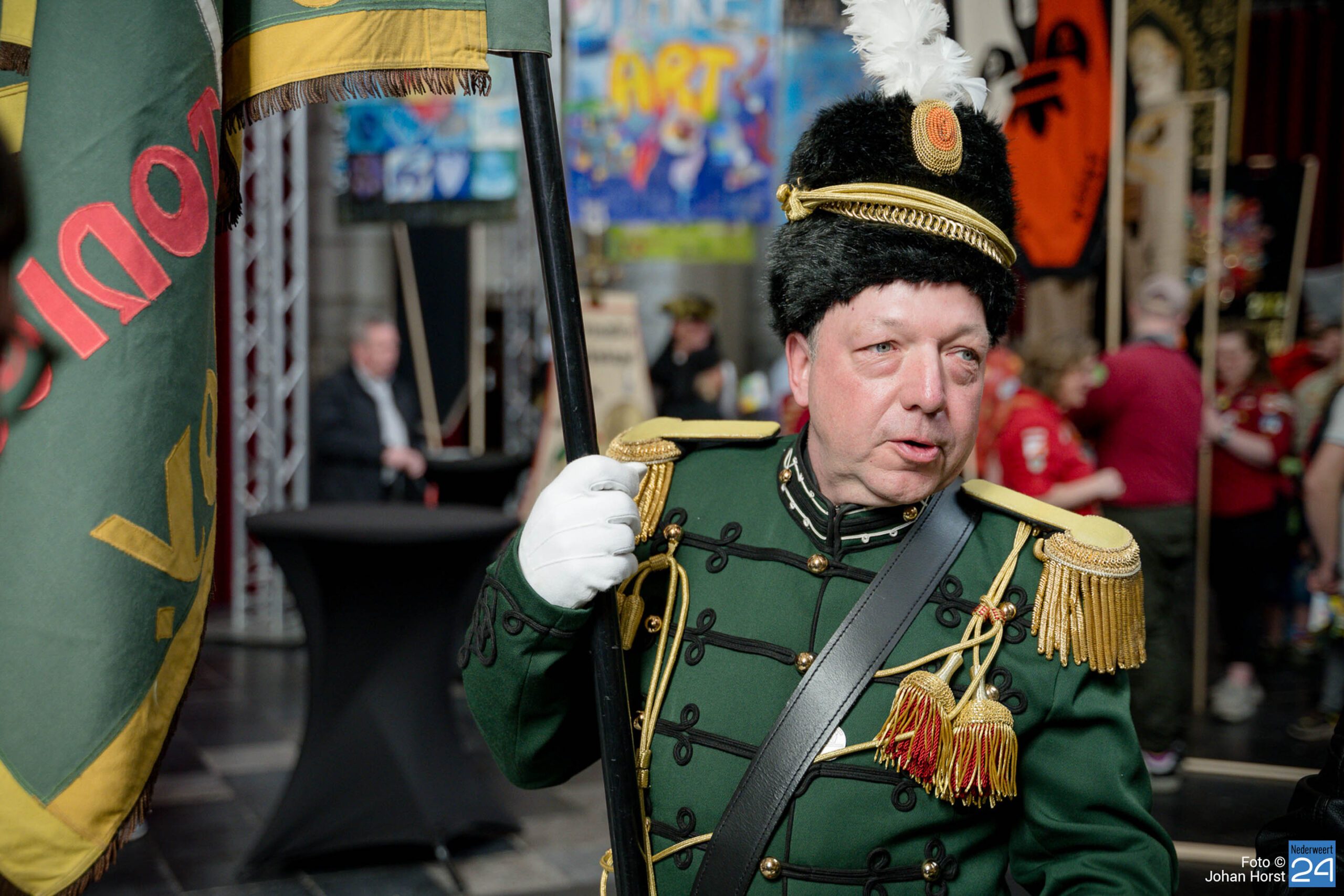 Er was veel belangstelling voor de historische en wat minder historische vaandels. Ze waren de afgelopen week al te bekijken in de Paterskerk. Vandaag gingen ze in een optocht door o.a. het park en langs Museum W. Daar werden ze toegezongen door Antje die wel in haar nopjes is met zoveel kleur.