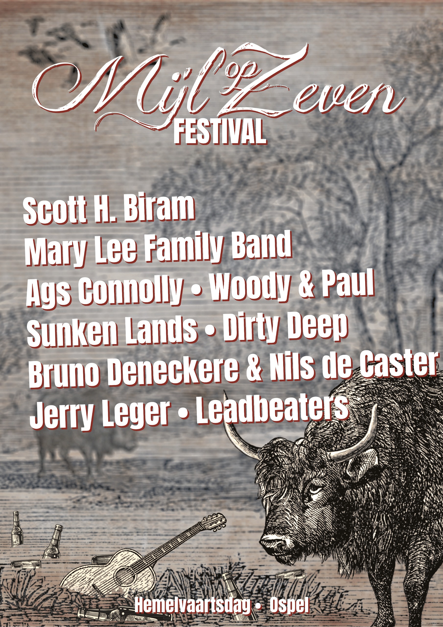 Internationaal vist Festival Mijl op Zeven fantastische bands uit de rootsvijver: van de Amerikaanse legende Scott H. Biram die al niet de minste is met zijn hillbilly, country en punkblues tot de Canadees singer-songwriter Jerry Leger met zijn topklasse en tijdloze rootsmuziek, de Garageblues sensatie Dirty Deep uit Frankrijk en Bluegrass, Honky tonk hoge snelheidstrein Mary Lee Family Band uit Berlijn. Als kers op de tranentrekkende country taart komt ook de Engelse Ags Connolly singer songwriter betoverende honky tonk suffles liedjes als “I hope you unhappy” brengen. En dan hebben we nog niet Bruno Deneckere en Nils de Caster genoemd van onze buren in België. Dit virtuoze magische duo zal op de cherry stage hun eigen songs, gelinked aan Bob Dylan, Willie Nelson, Merle Haggard en aanverwanten de Peel inslingeren.