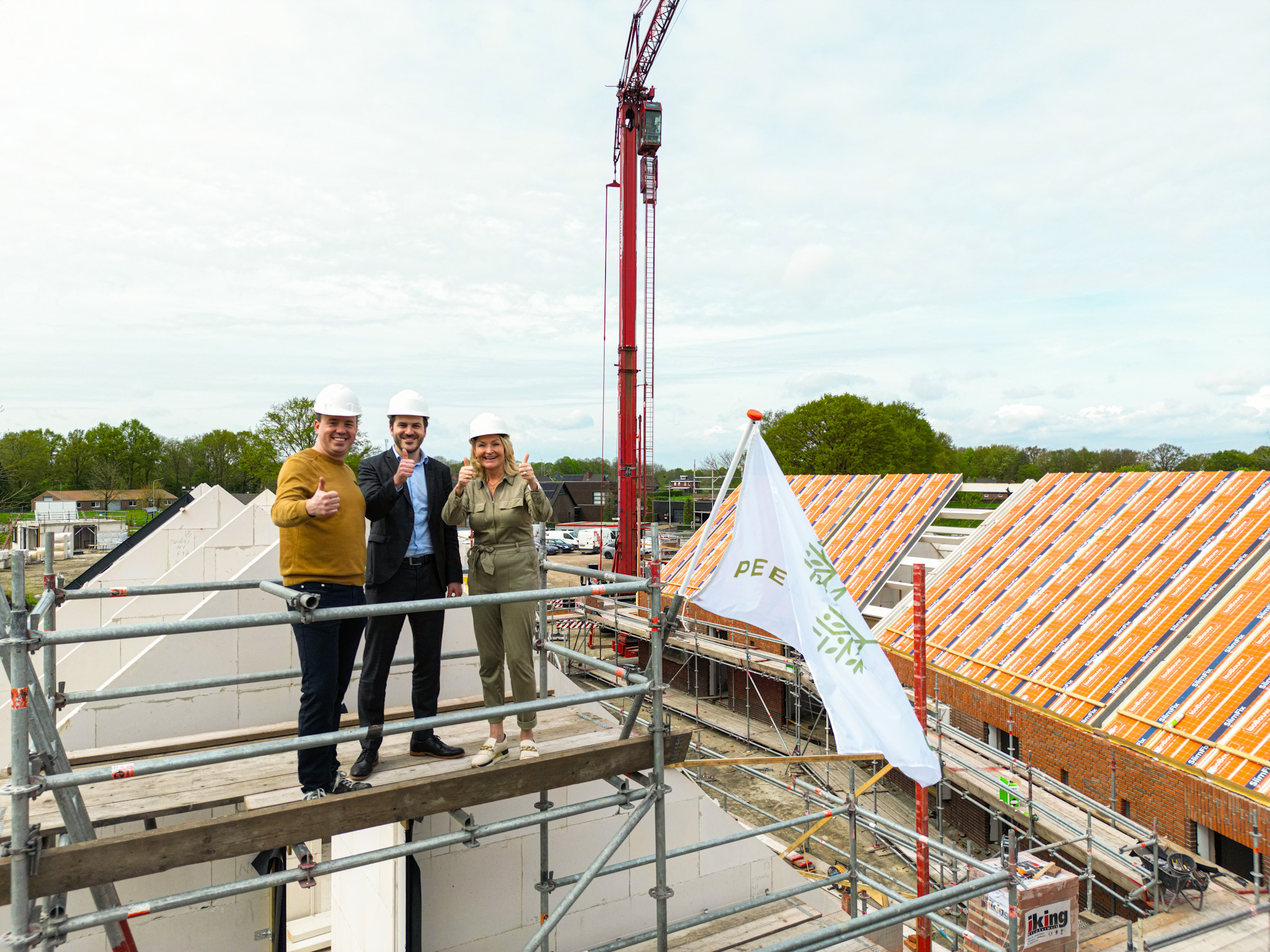 Op vrijdagmiddag 12 april 2024 is bij nieuwbouwproject Peelwachter in Ospel het hoogste punt bereikt. Kets-Maantje BV, initiatiefnemer van Peelwachter, plaatst samen met Bouwbedrijf Teng Wijen en wethouder Boris Meessen van gemeente Nederweert de vlag op het dak bij de 21 huurwoningen.