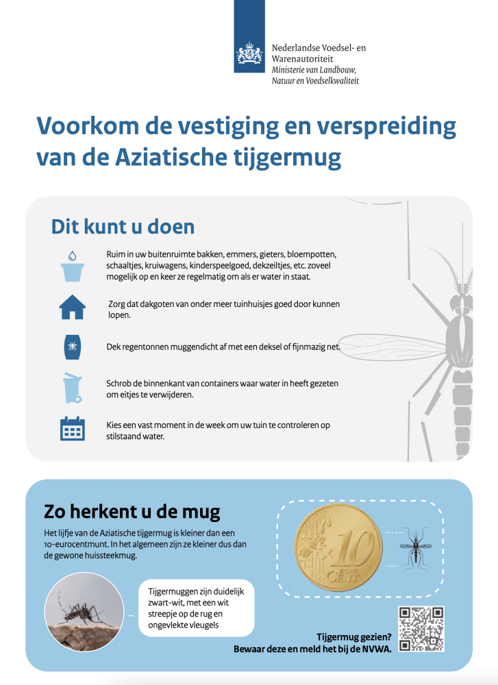 Vanwege de vondst van de Aziatische tijgermug in Nederweert heeft de NVWA vorig jaar het gebied rond de vindplek onderzocht, muggenvallen geplaatst en mogelijke broedplaatsen verwijderd of behandeld. Omdat het niet zeker is dat de tijgermug volledig is verdwenen in Nederweert, gaat de NVWA vanaf april het gebied wederom onderzoeken en vallen zetten. Wordt de tijgermug opnieuw aangetroffen, dan zal de NVWA nieuwe bestrijdingsacties uitvoeren en zullen ze je informeren.