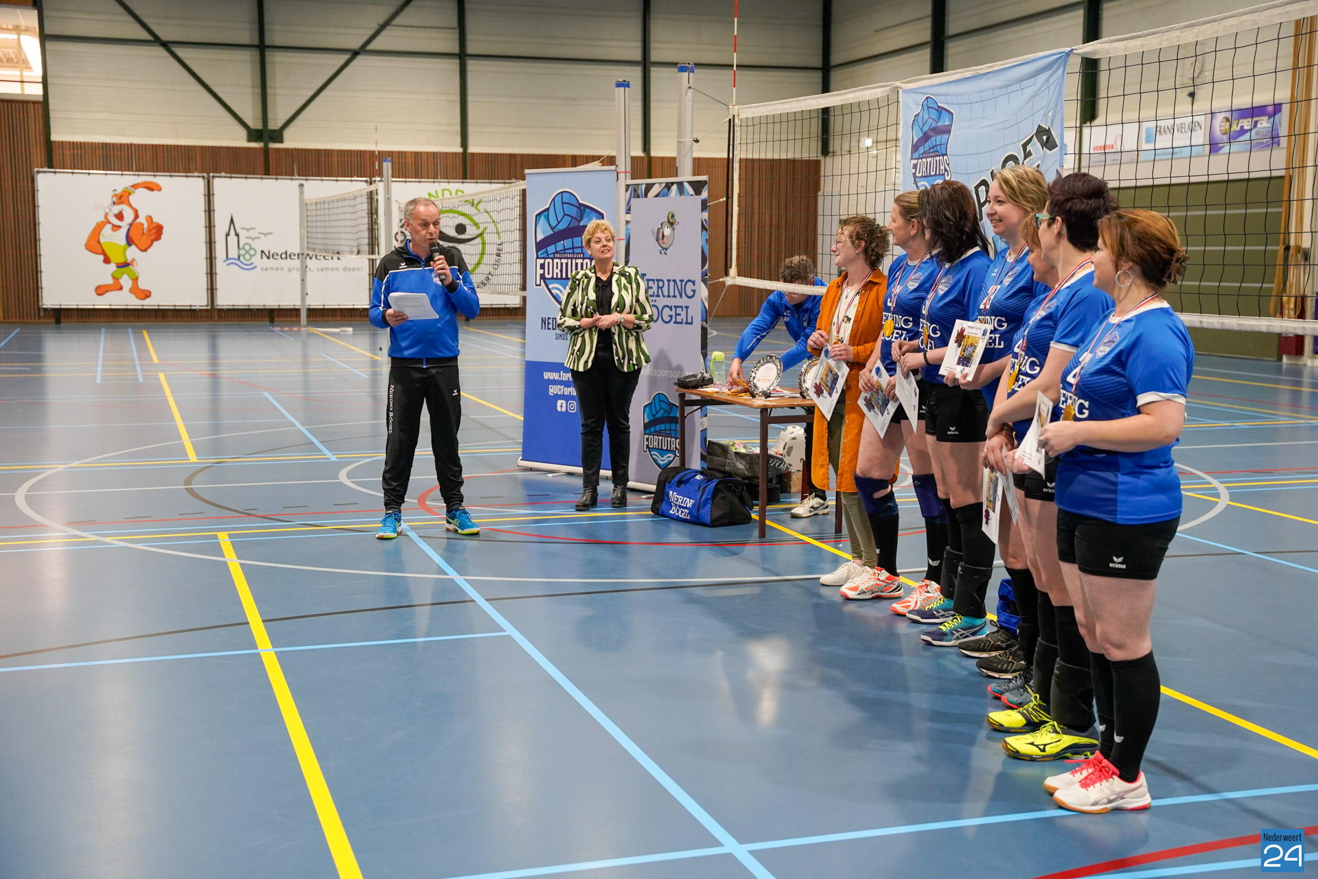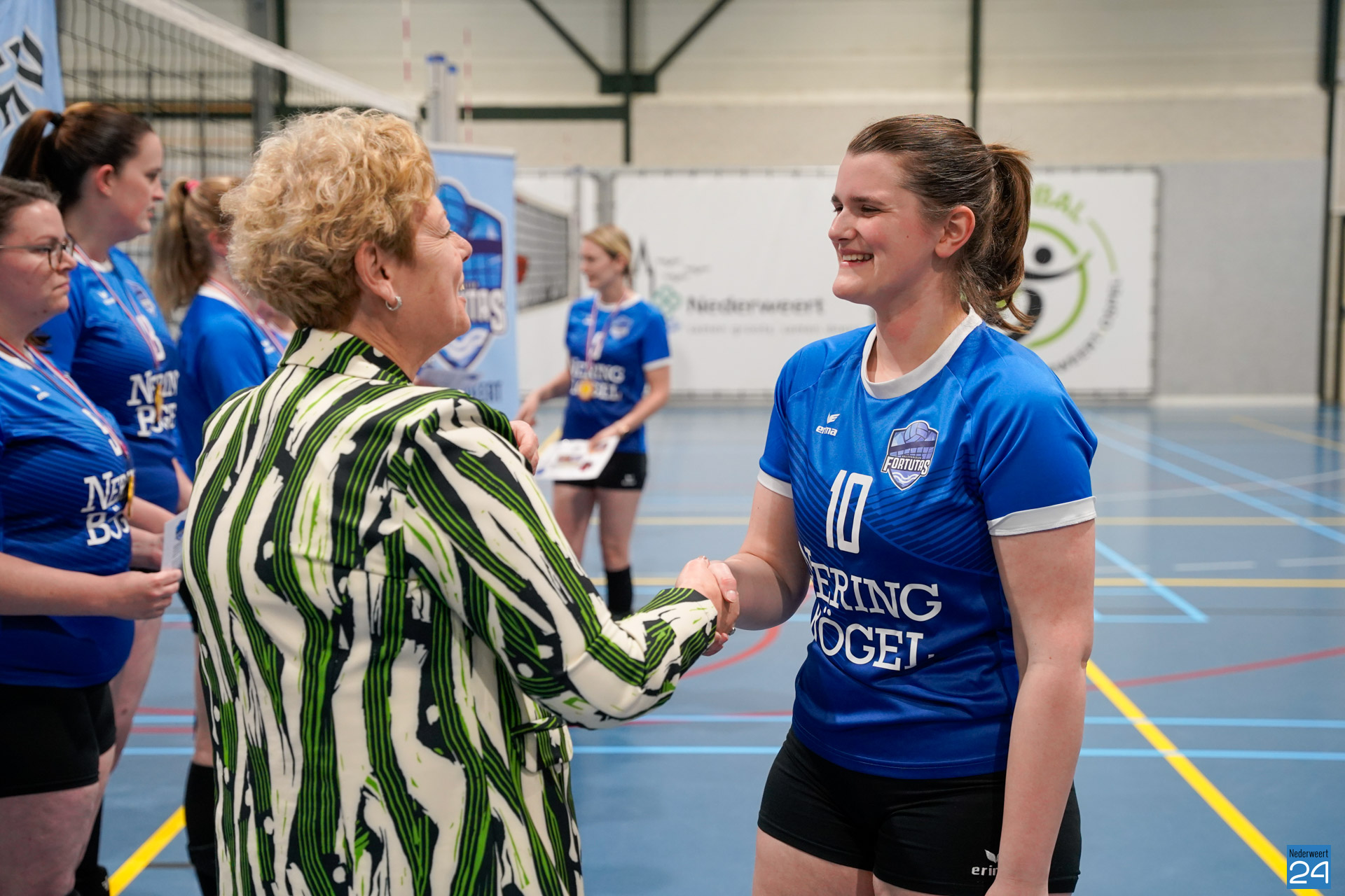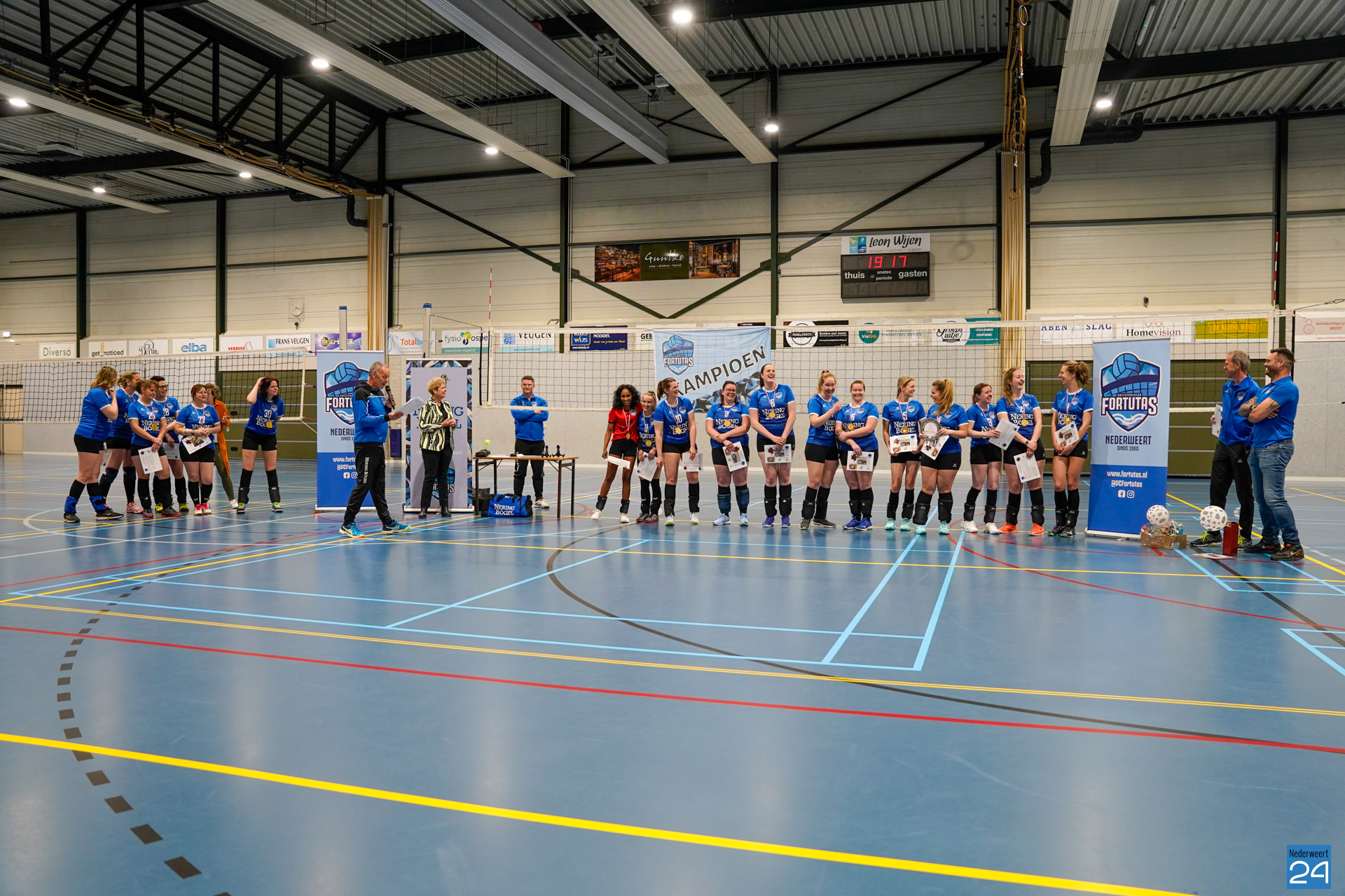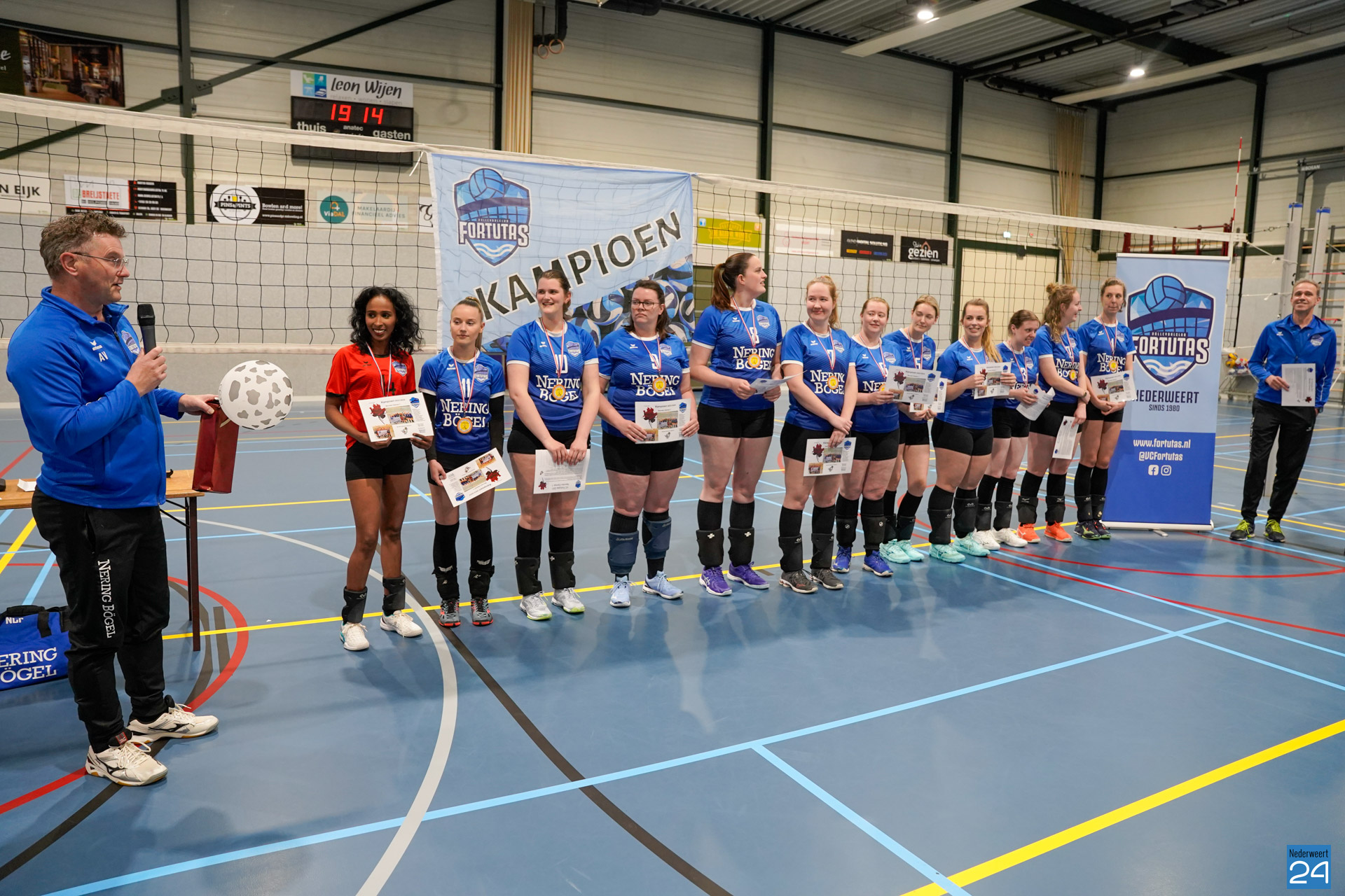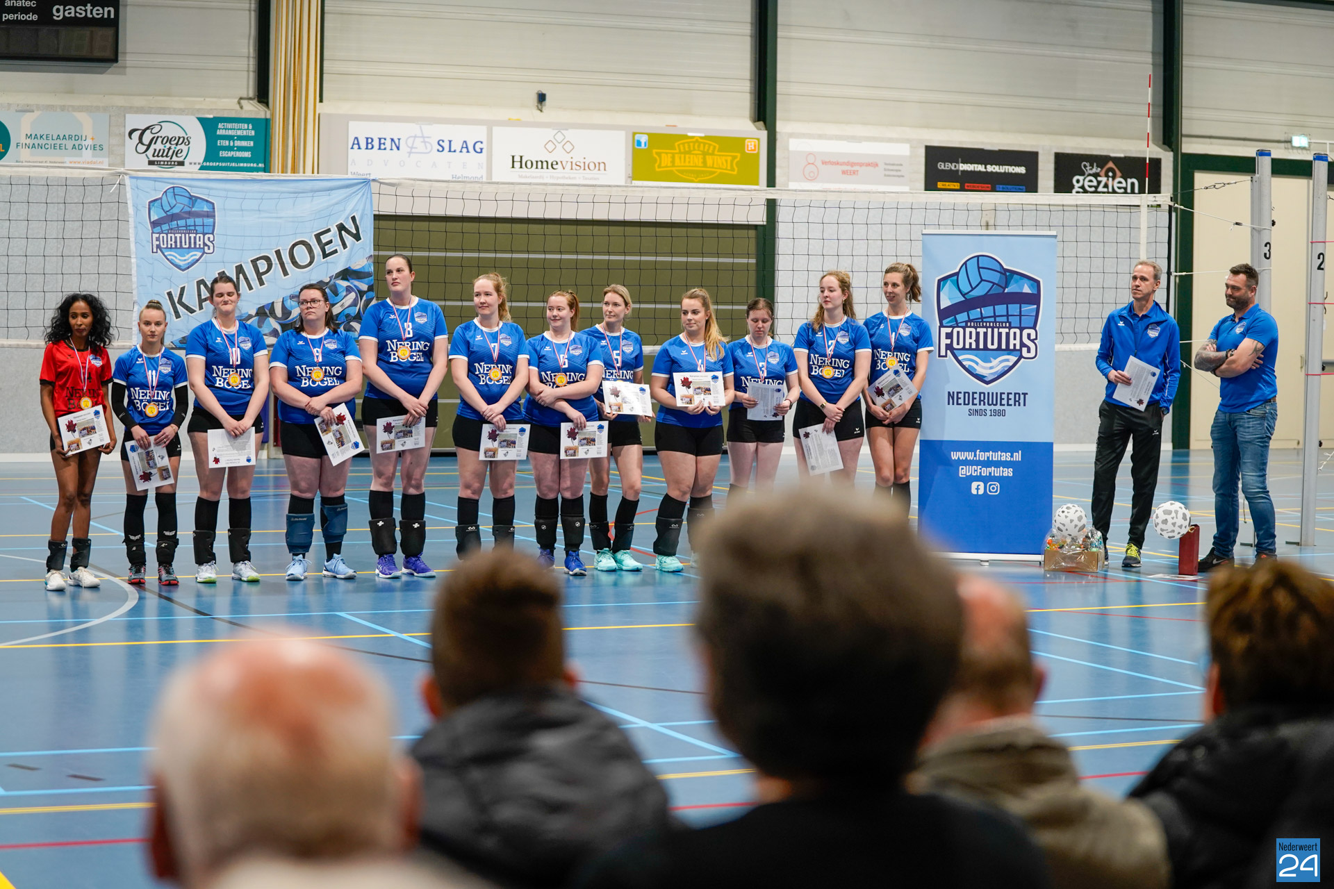 Elk jaar organiseert een Fortutas team het Fortutas Feest. En daar lijkt nu ook een mooie stimulans in te zitten. Immers, begin van dit seizoen organiseerden de Recreanten Damers 1 het Fortutas feest. En zij zijn kampioen geworden. Afgelopen zaterdag organiseerden de Nevobo Dames 1 het Fortutas Feest en ook zij zijn kampioen geworden. Voor beide teams een geweldige teamprestatie! De huldiging start met de Recreanten Dames 1. Elke speelster wordt naar voren geroepen onder luid applaus en ontvangt een medaille en oorkonde.