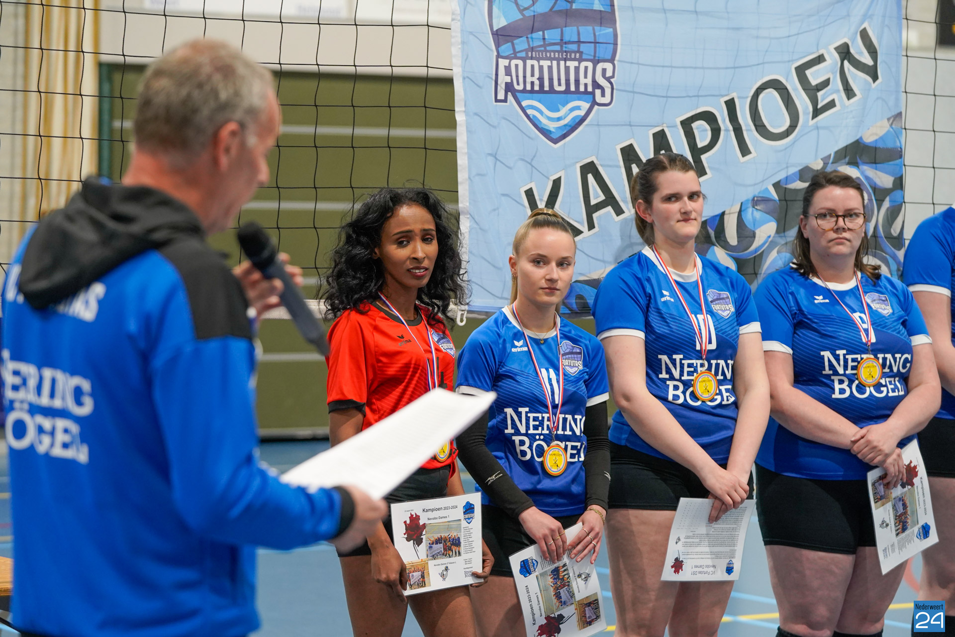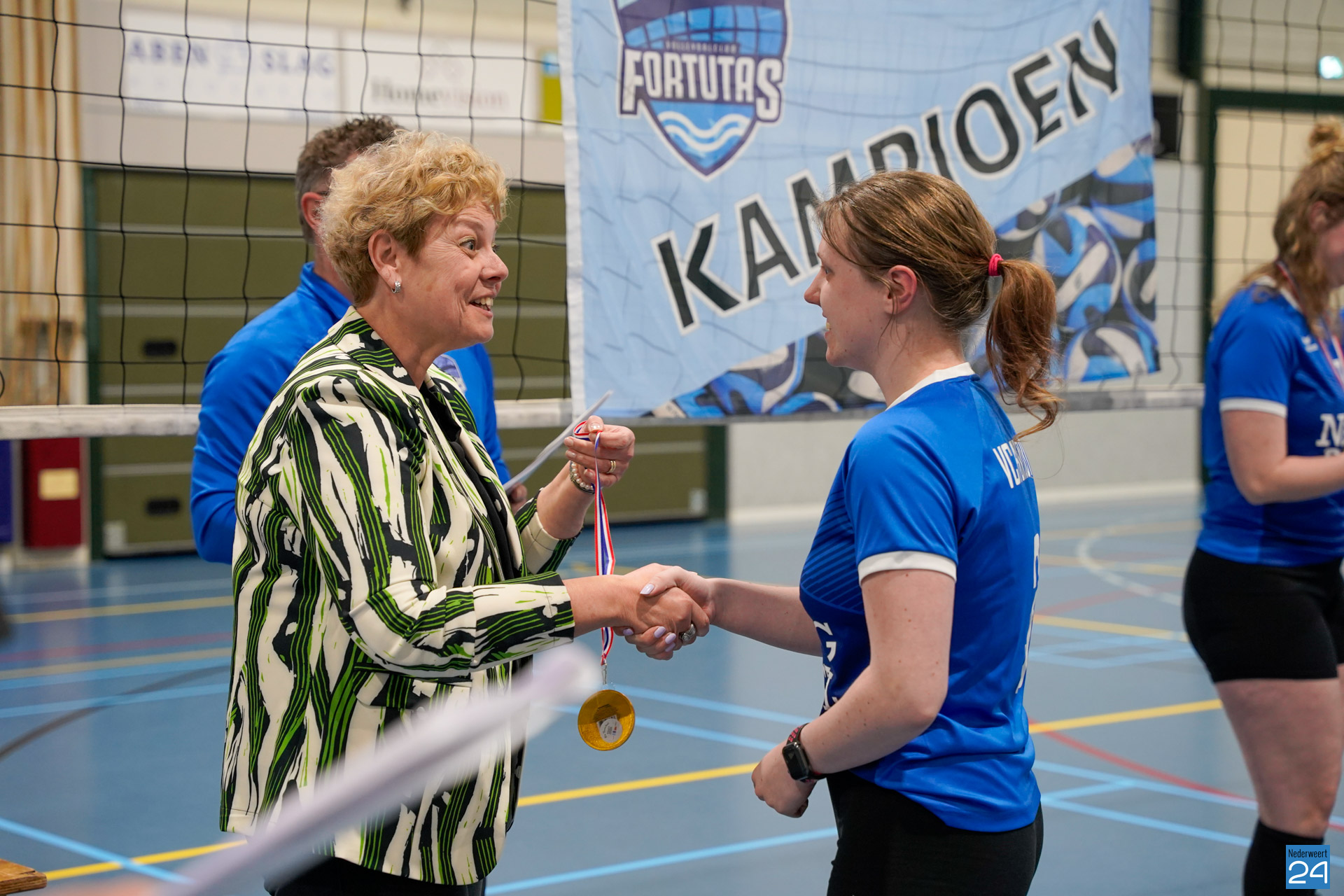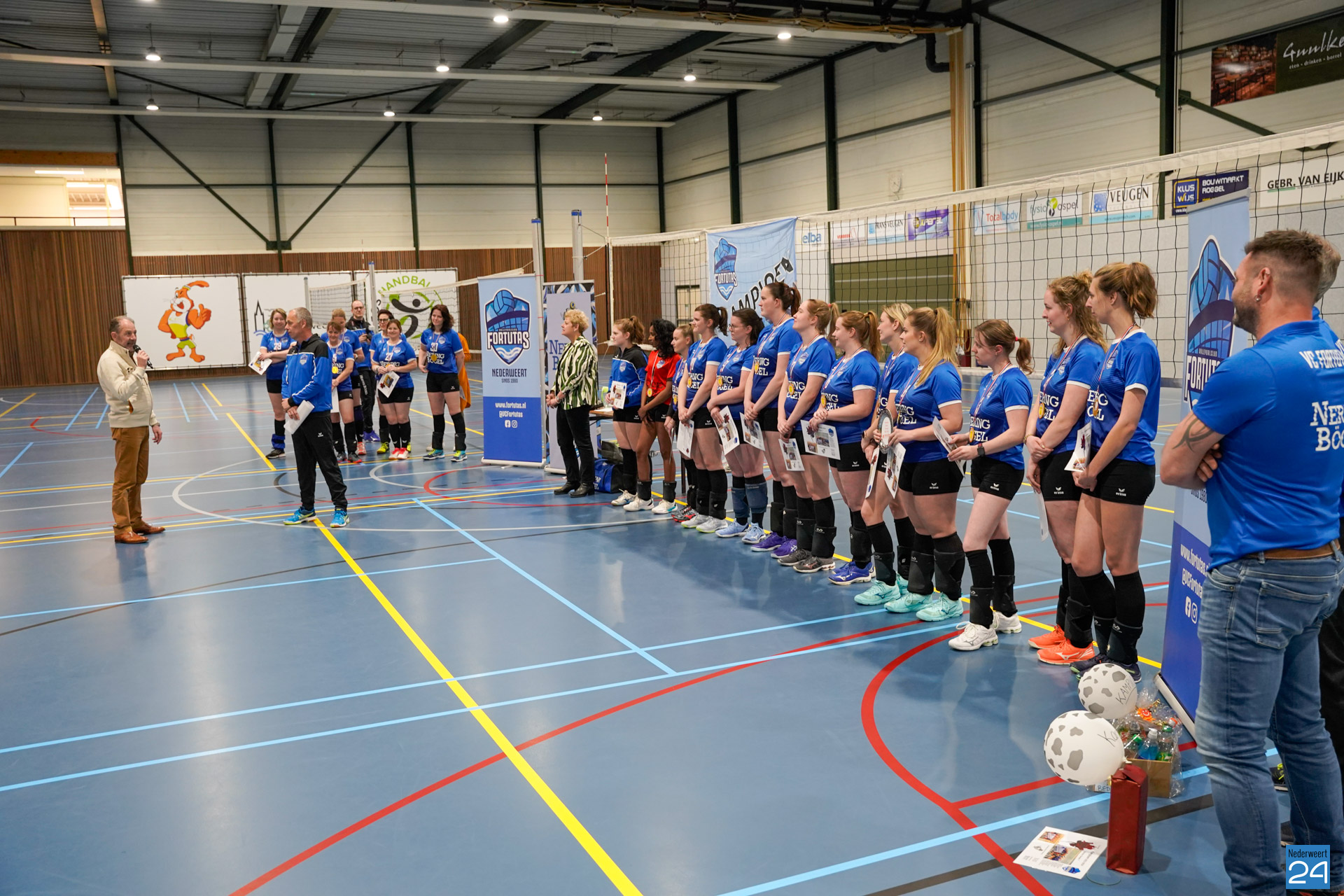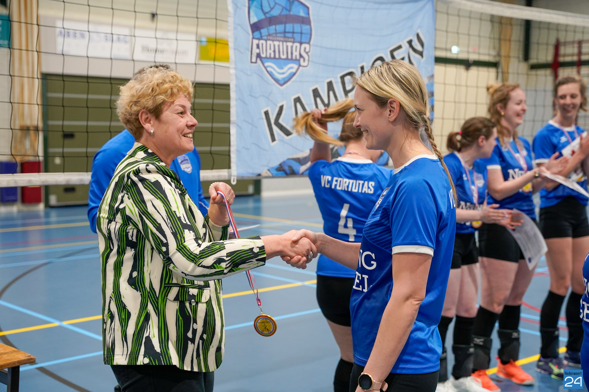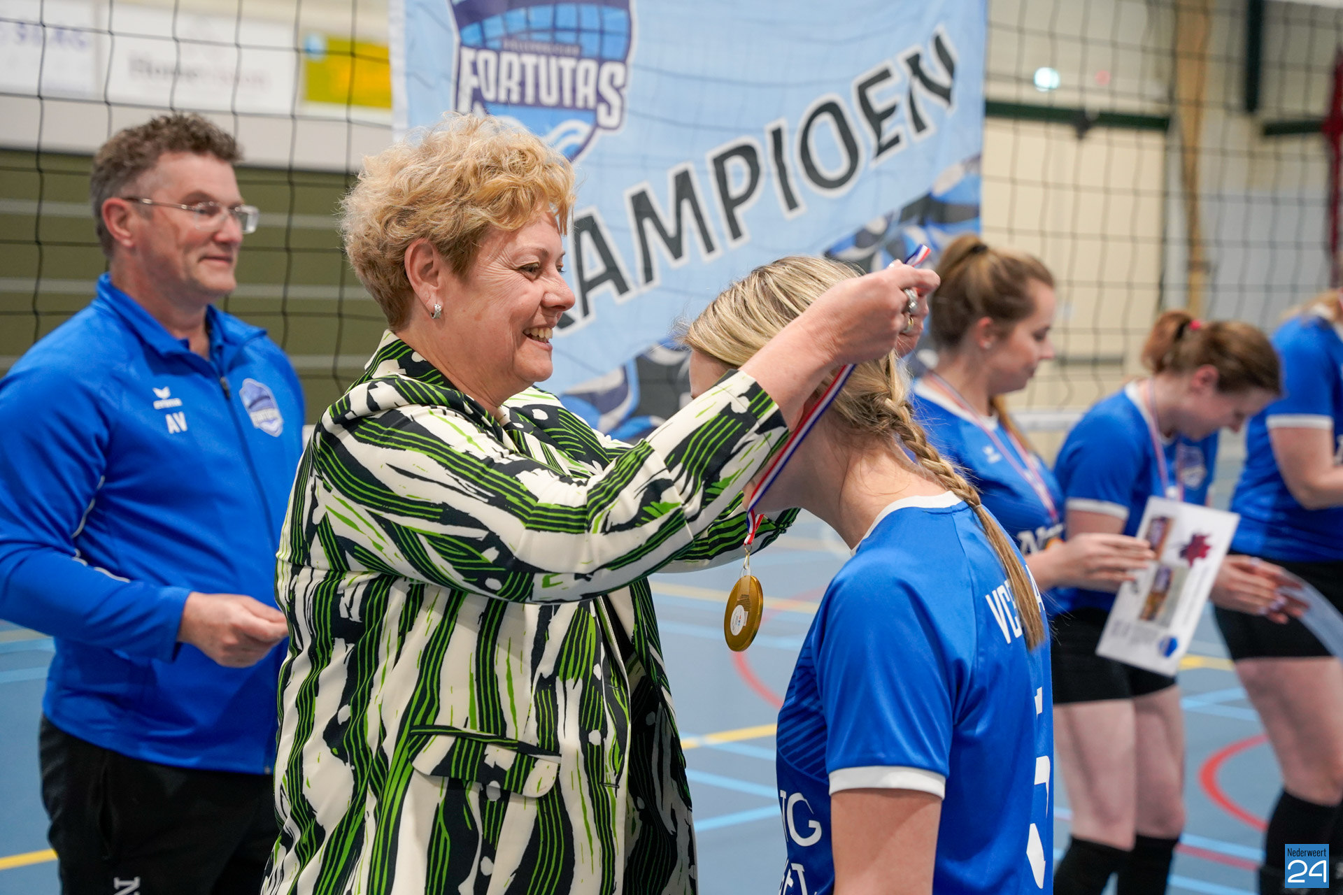 Elk jaar organiseert een Fortutas team het Fortutas Feest. En daar lijkt nu ook een mooie stimulans in te zitten. Immers, begin van dit seizoen organiseerden de Recreanten Damers 1 het Fortutas feest. En zij zijn kampioen geworden. Afgelopen zaterdag organiseerden de Nevobo Dames 1 het Fortutas Feest en ook zij zijn kampioen geworden. Voor beide teams een geweldige teamprestatie! De huldiging start met de Recreanten Dames 1. Elke speelster wordt naar voren geroepen onder luid applaus en ontvangt een medaille en oorkonde.