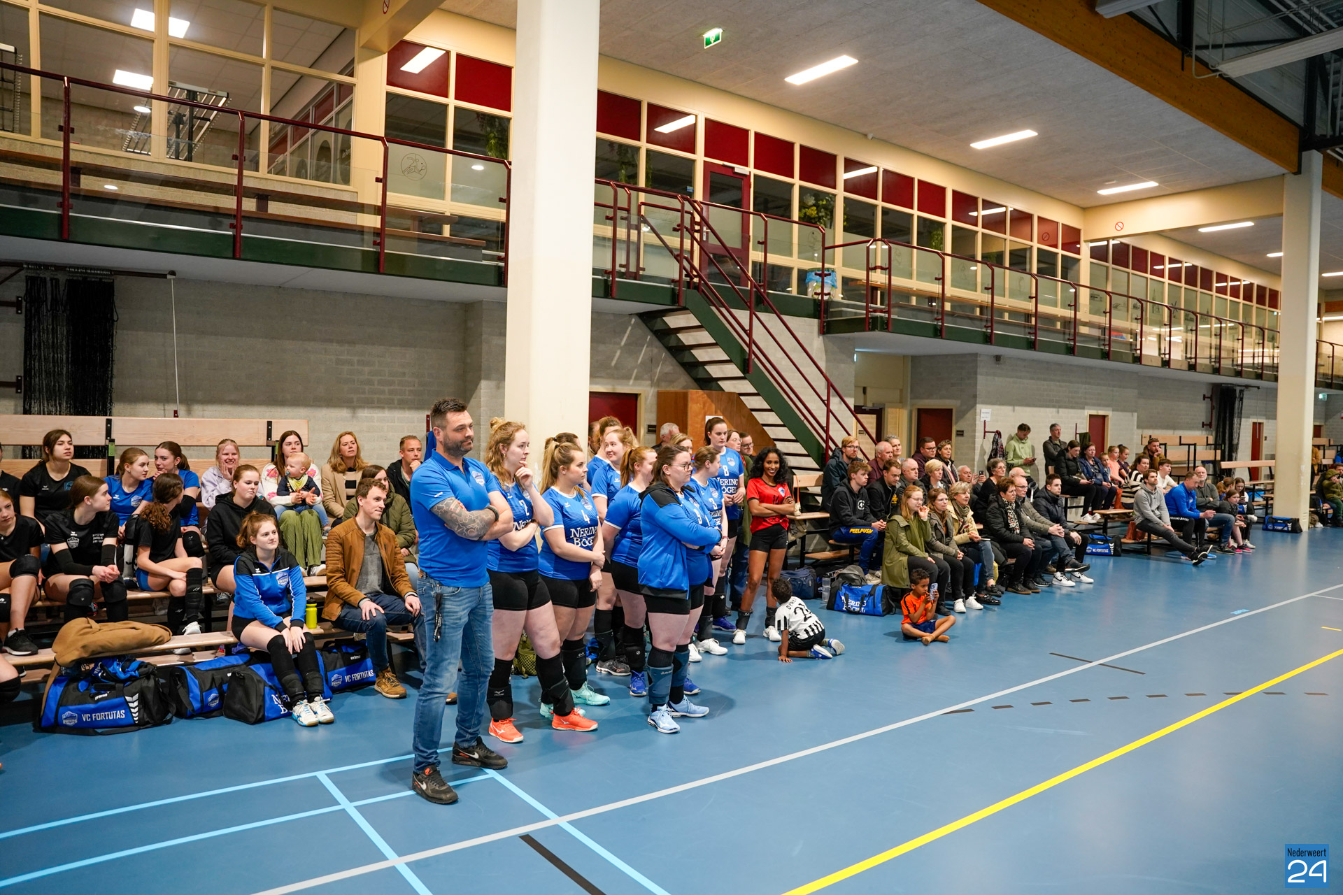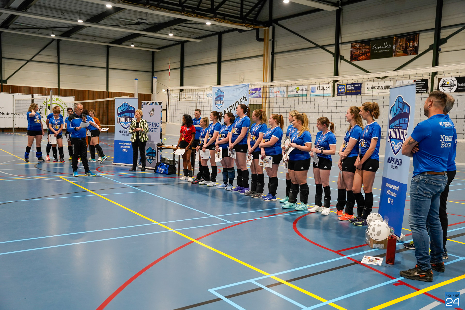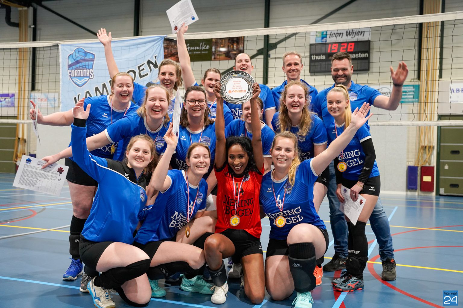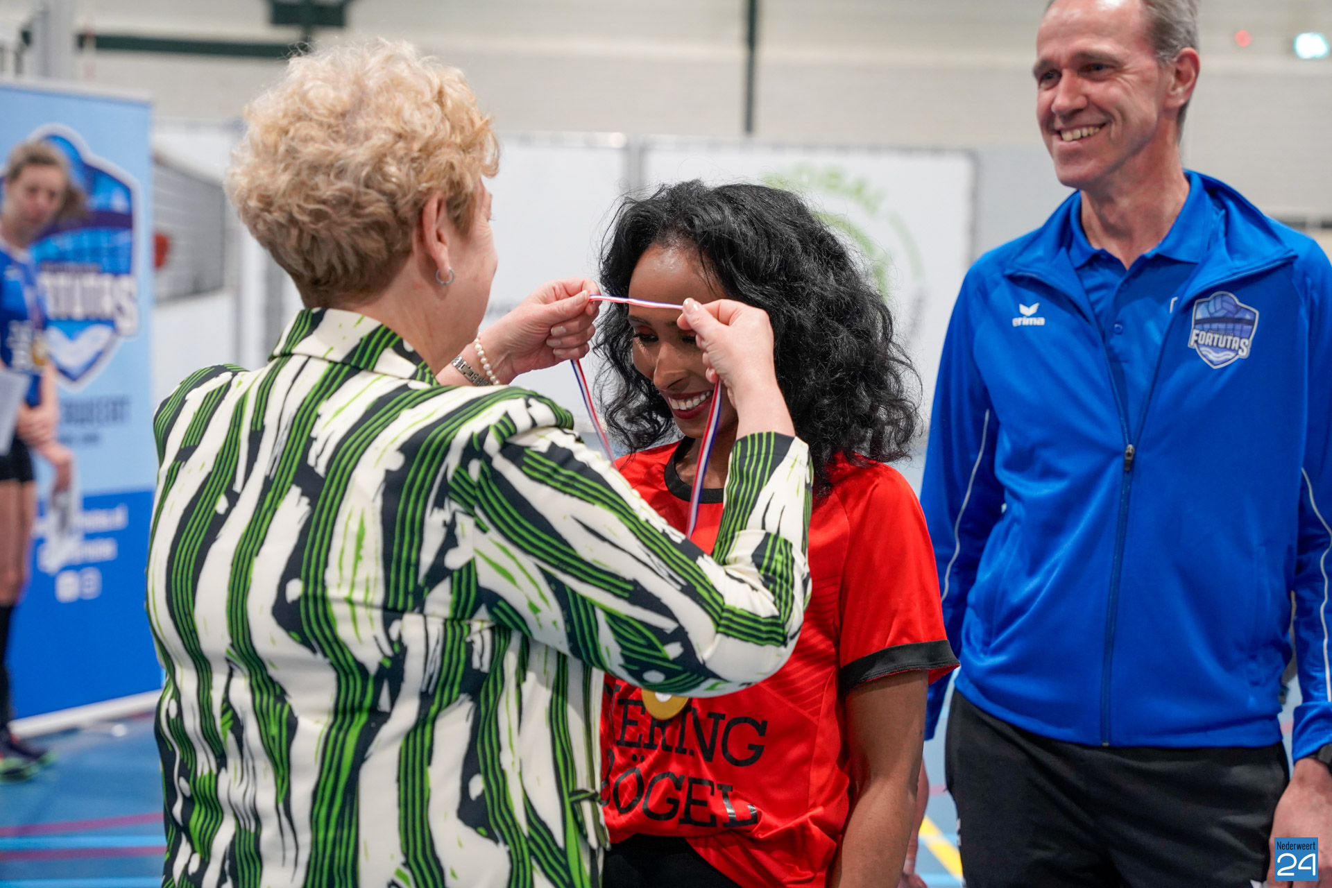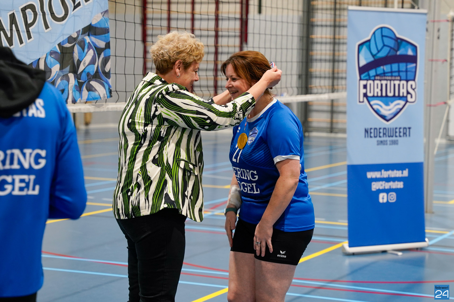 Elk jaar organiseert een Fortutas team het Fortutas Feest. En daar lijkt nu ook een mooie stimulans in te zitten. Immers, begin van dit seizoen organiseerden de Recreanten Damers 1 het Fortutas feest. En zij zijn kampioen geworden. Afgelopen zaterdag organiseerden de Nevobo Dames 1 het Fortutas Feest en ook zij zijn kampioen geworden. Voor beide teams een geweldige teamprestatie! De huldiging start met de Recreanten Dames 1. Elke speelster wordt naar voren geroepen onder luid applaus en ontvangt een medaille en oorkonde.