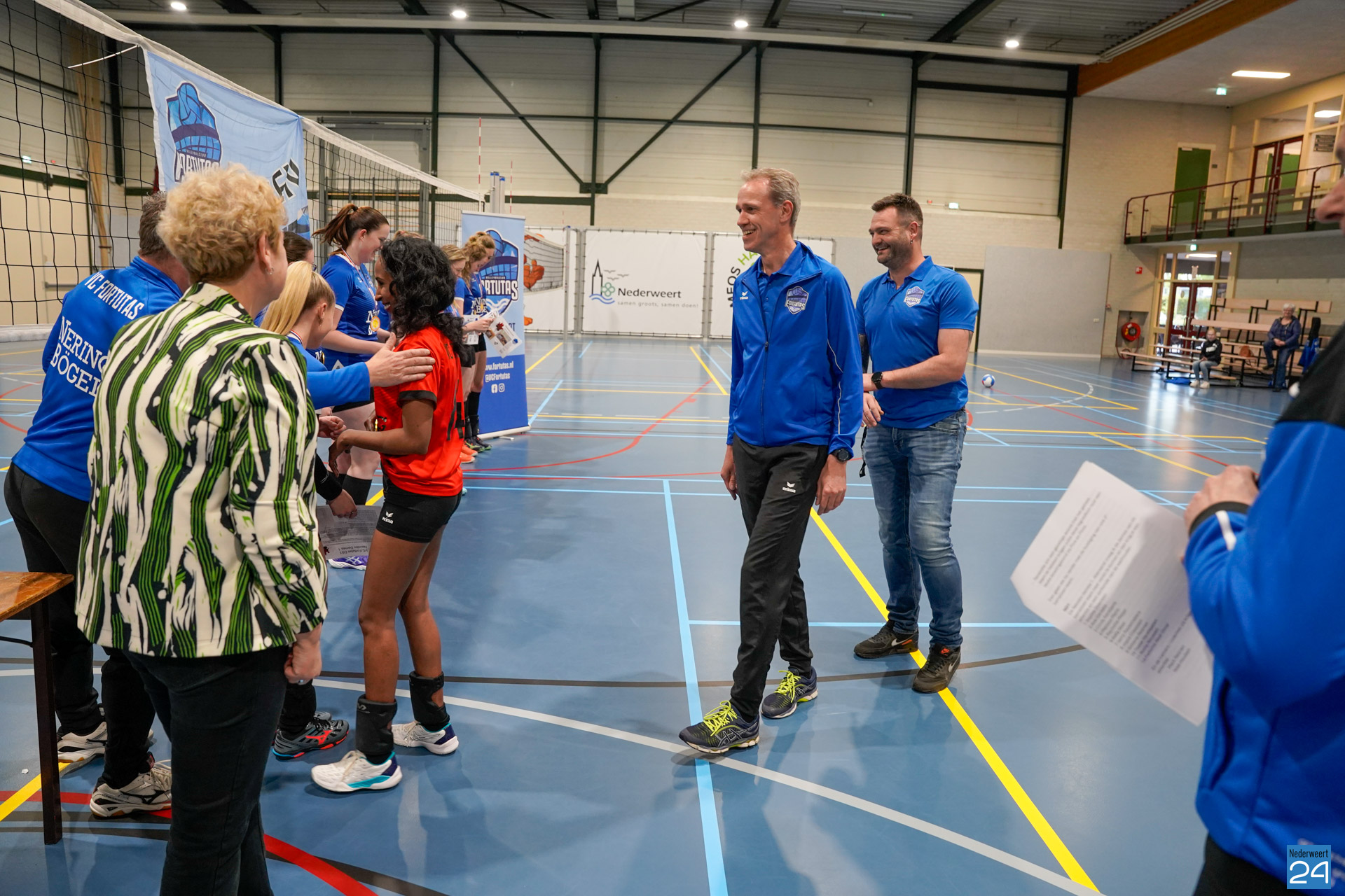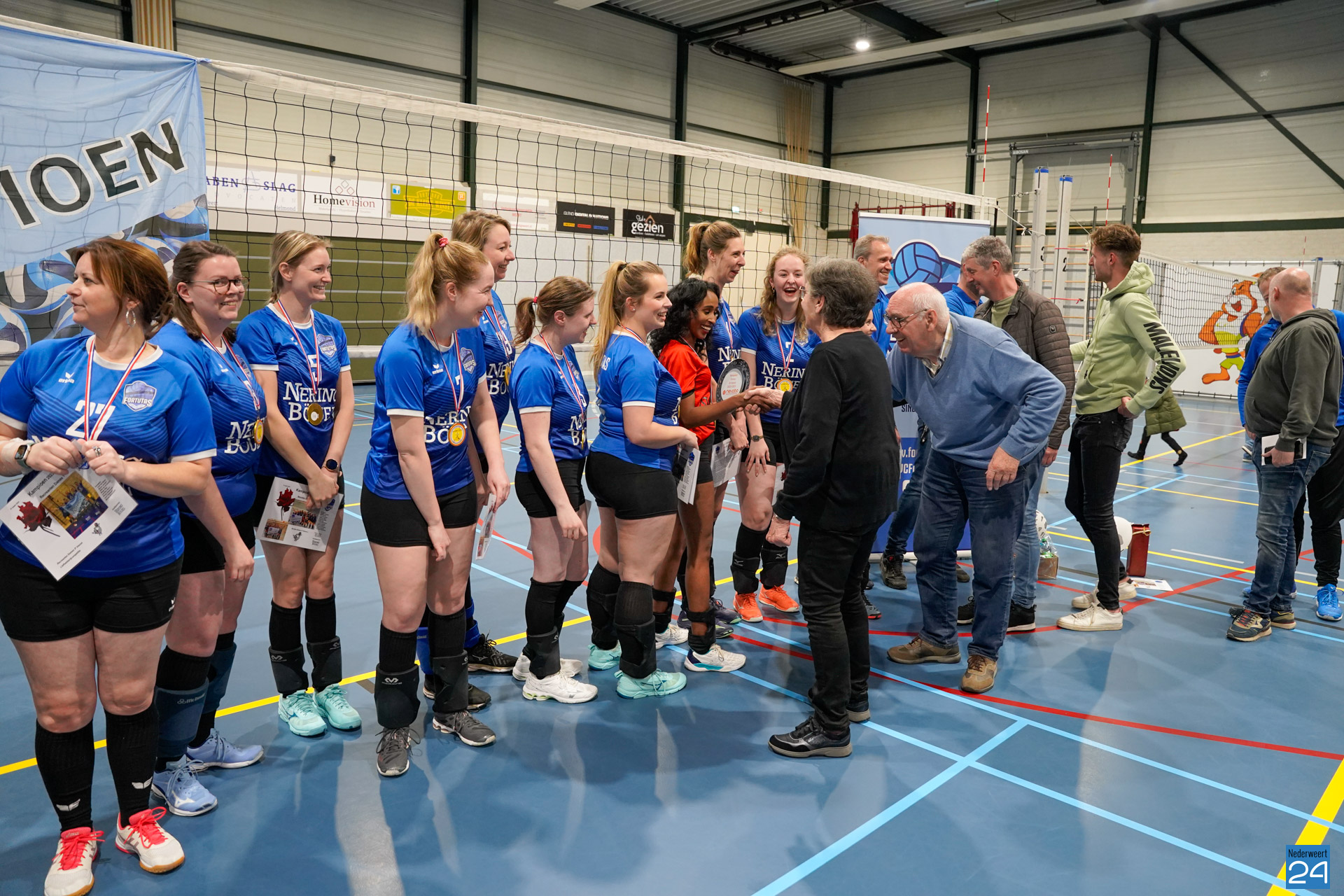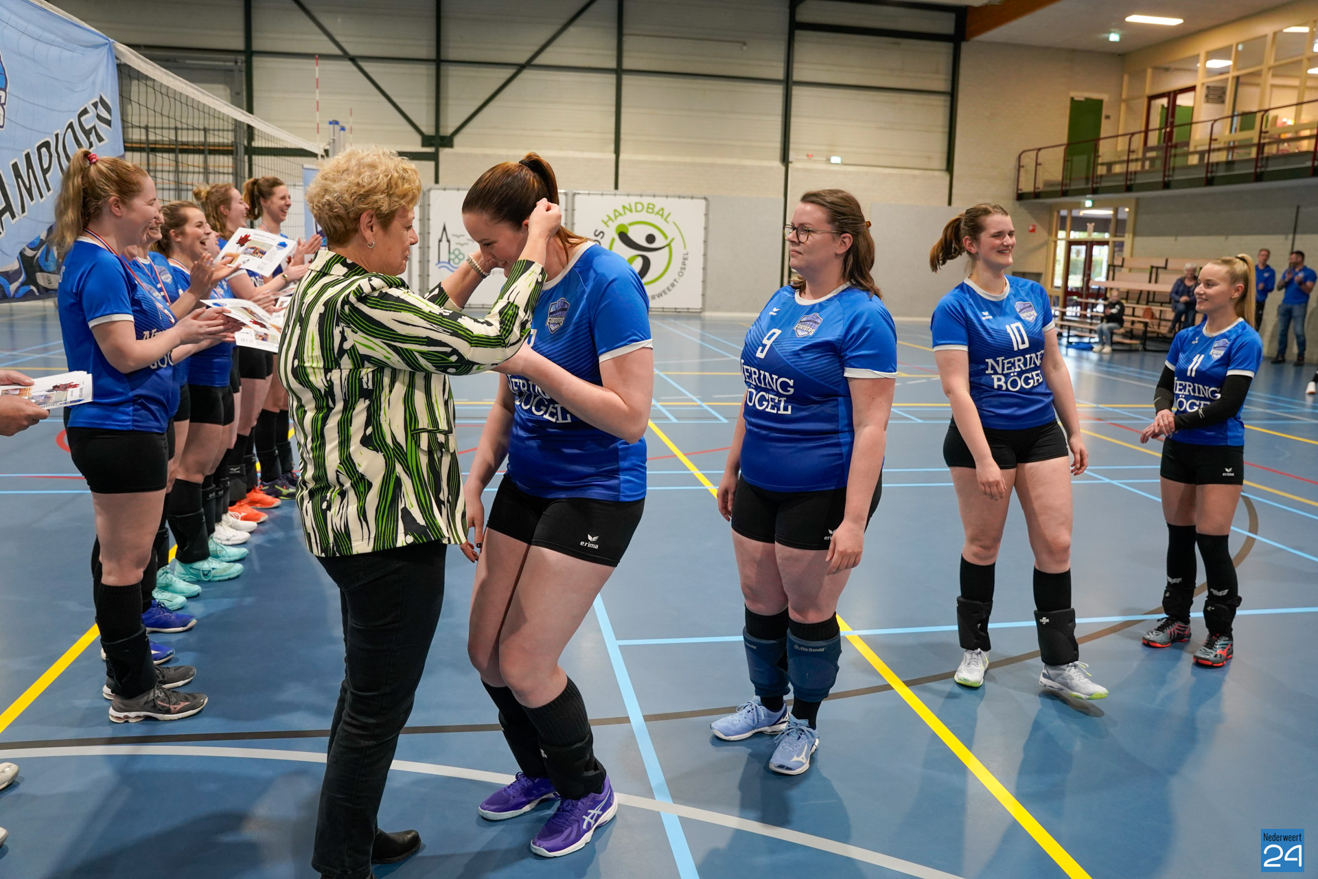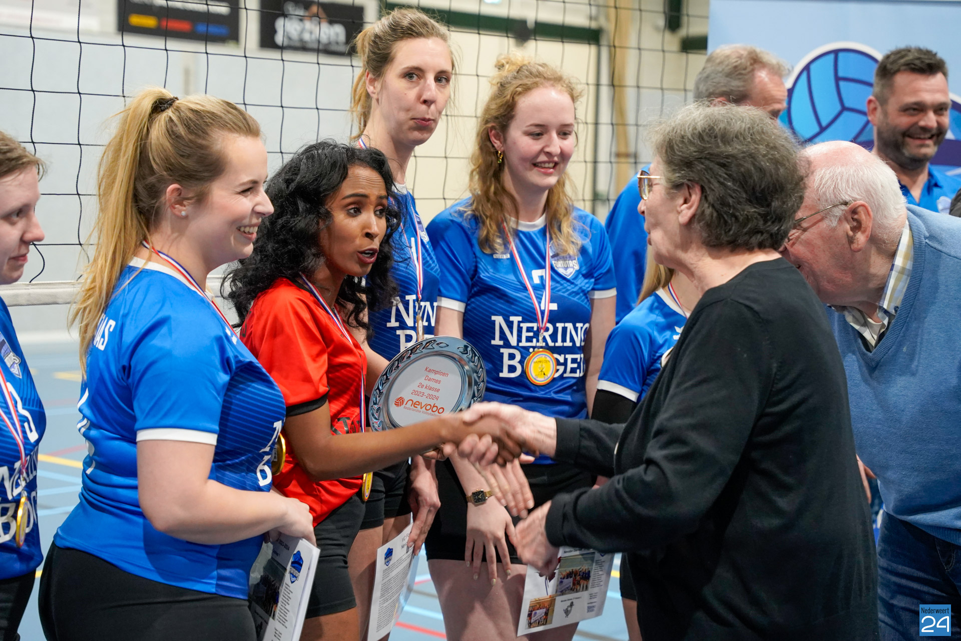 Tenslotte ontvangt de aanvoerder voor het gehele team nog een kampioenschaal en een tegoedbon om met het gehele team een leuke bowlingavond bij Pins en Pints te beleven. Vervolgens wordt het team Nevobo Dames 1 gehuldigd. Ook deze dames komen onder luid applaus een voor een naar voren en ontvangen een medaille en oorkonde. Ook de beide trainers / coaches worden gehuldigd en ontvangen een speciale attentie.