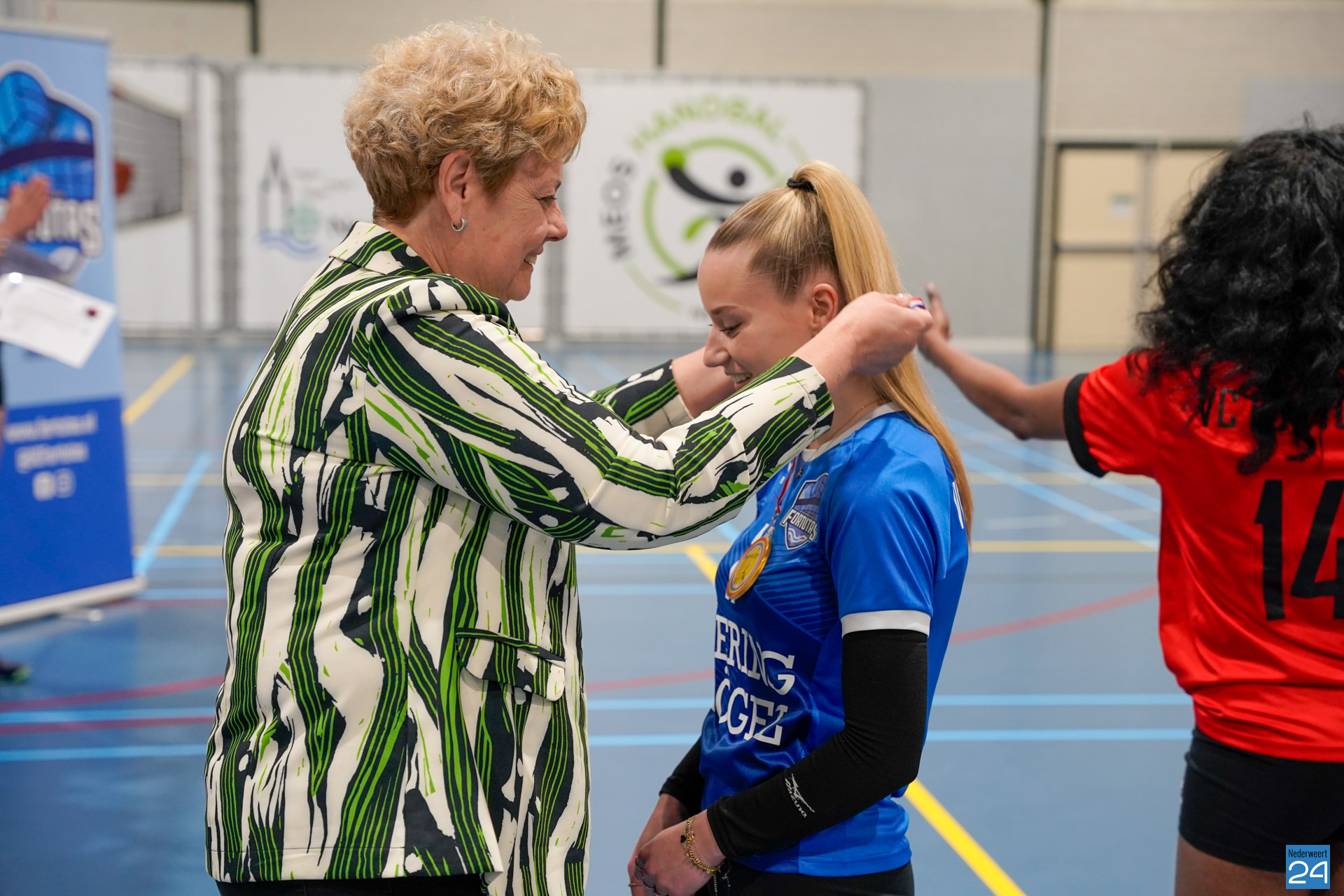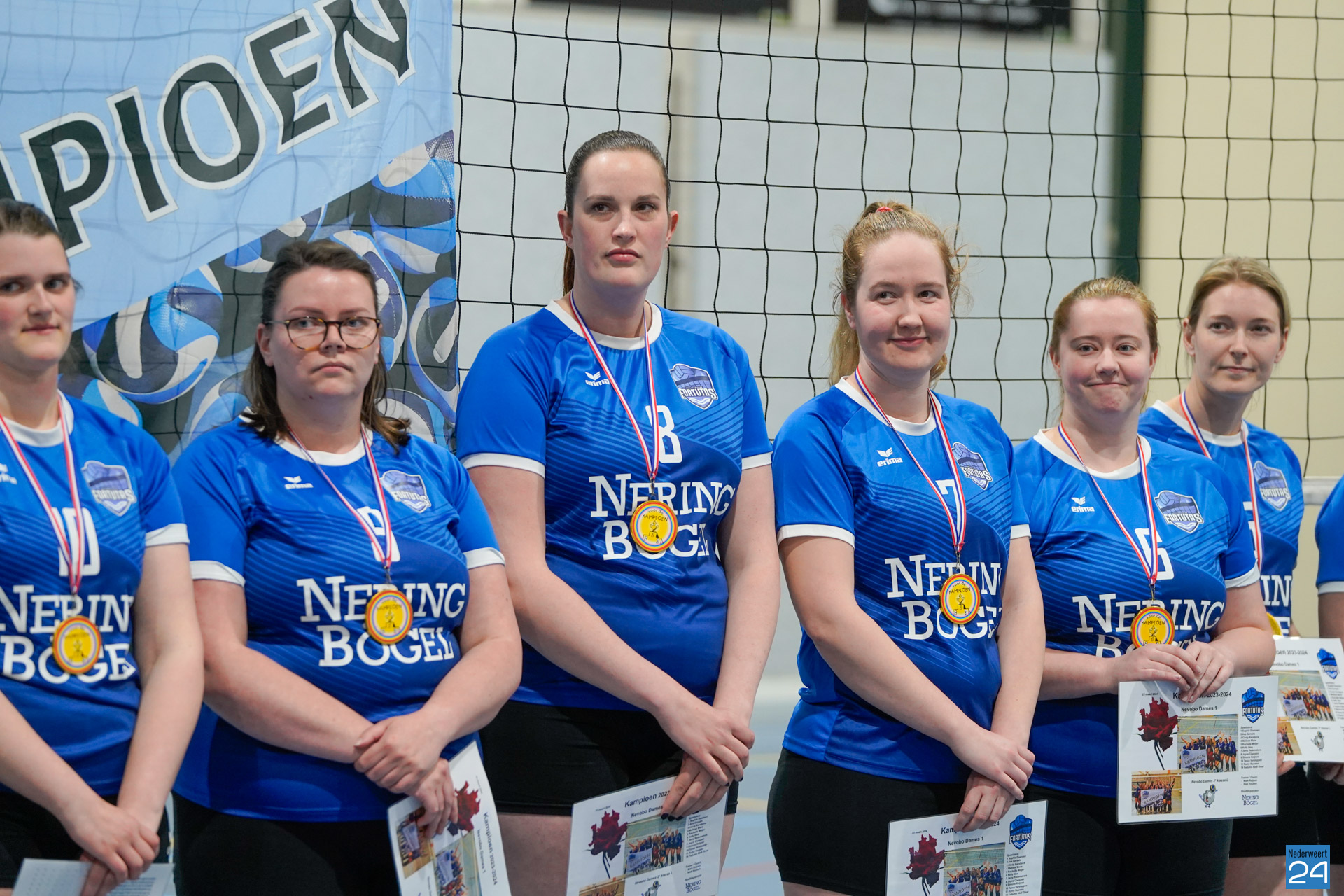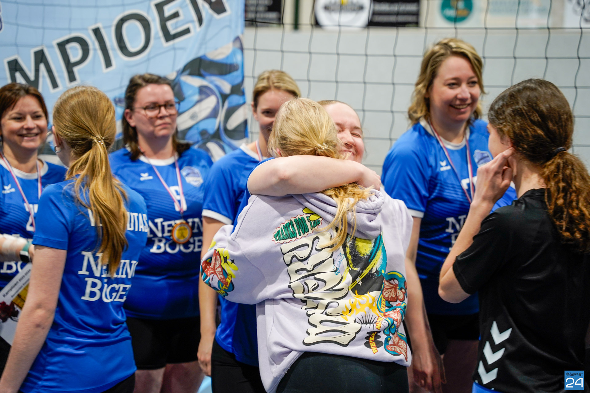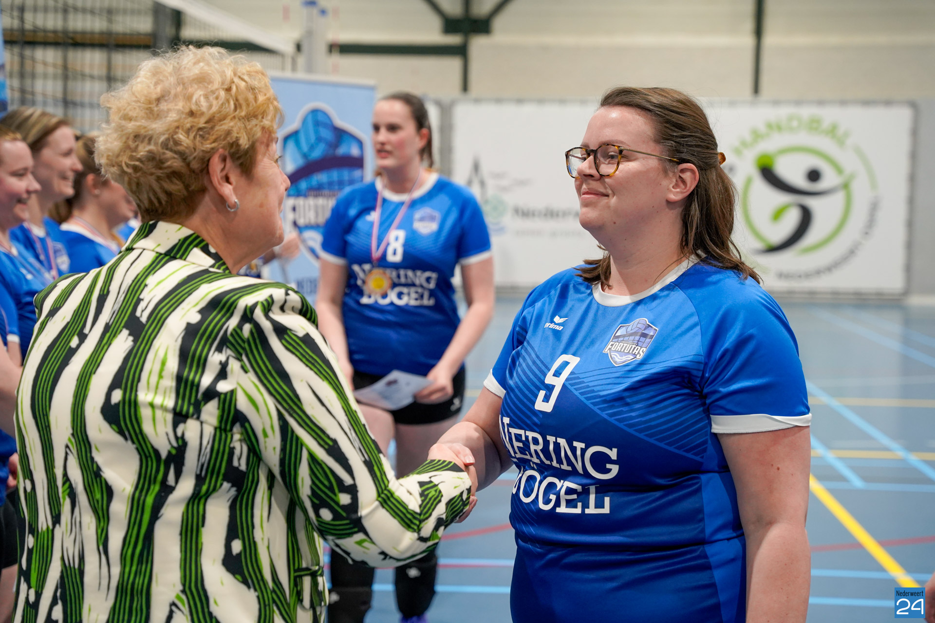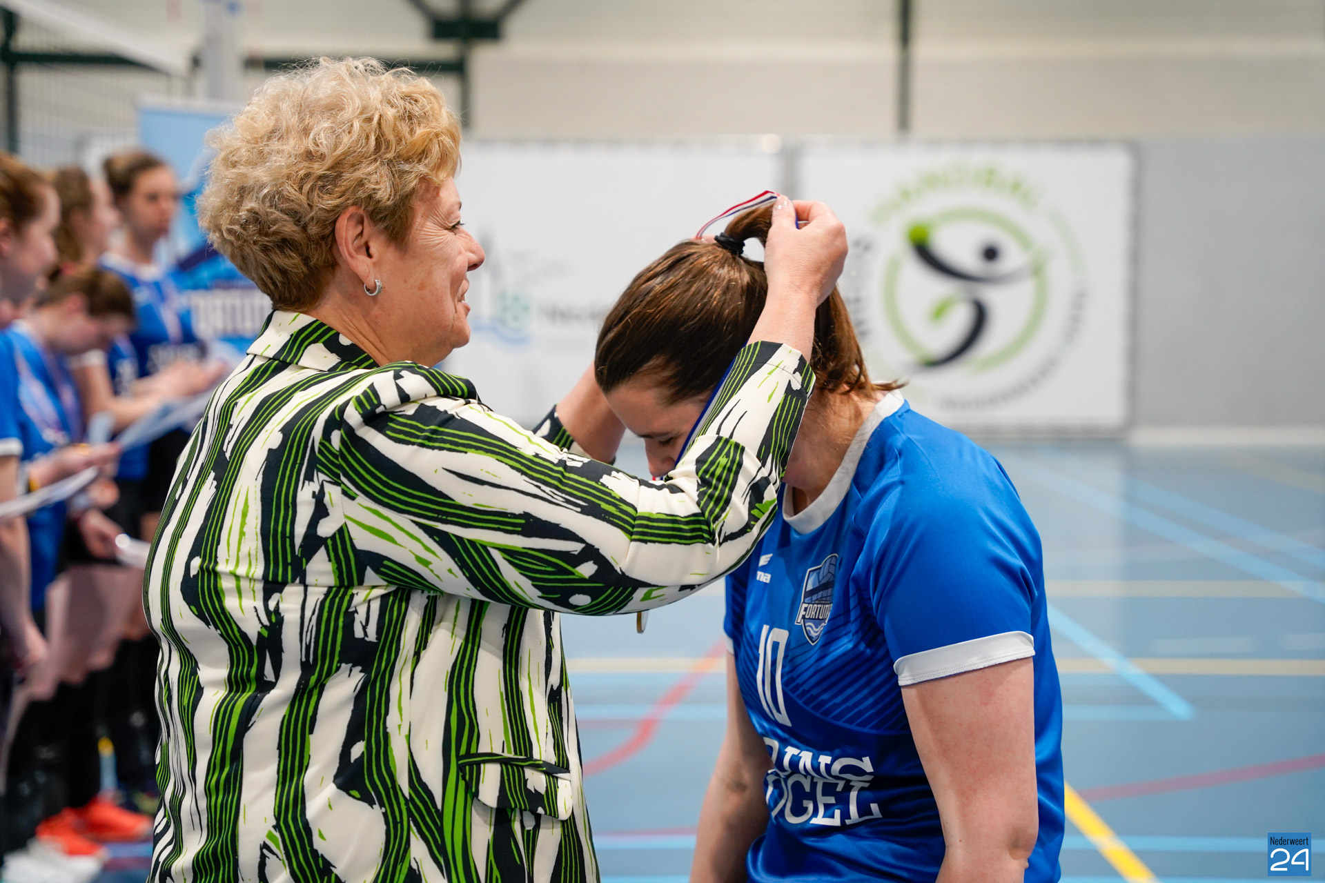 Tenslotte ontvangt de aanvoerder voor het gehele team nog een kampioenschaal en een tegoedbon om met het gehele team een leuke bowlingavond bij Pins en Pints te beleven. Vervolgens wordt het team Nevobo Dames 1 gehuldigd. Ook deze dames komen onder luid applaus een voor een naar voren en ontvangen een medaille en oorkonde. Ook de beide trainers / coaches worden gehuldigd en ontvangen een speciale attentie.