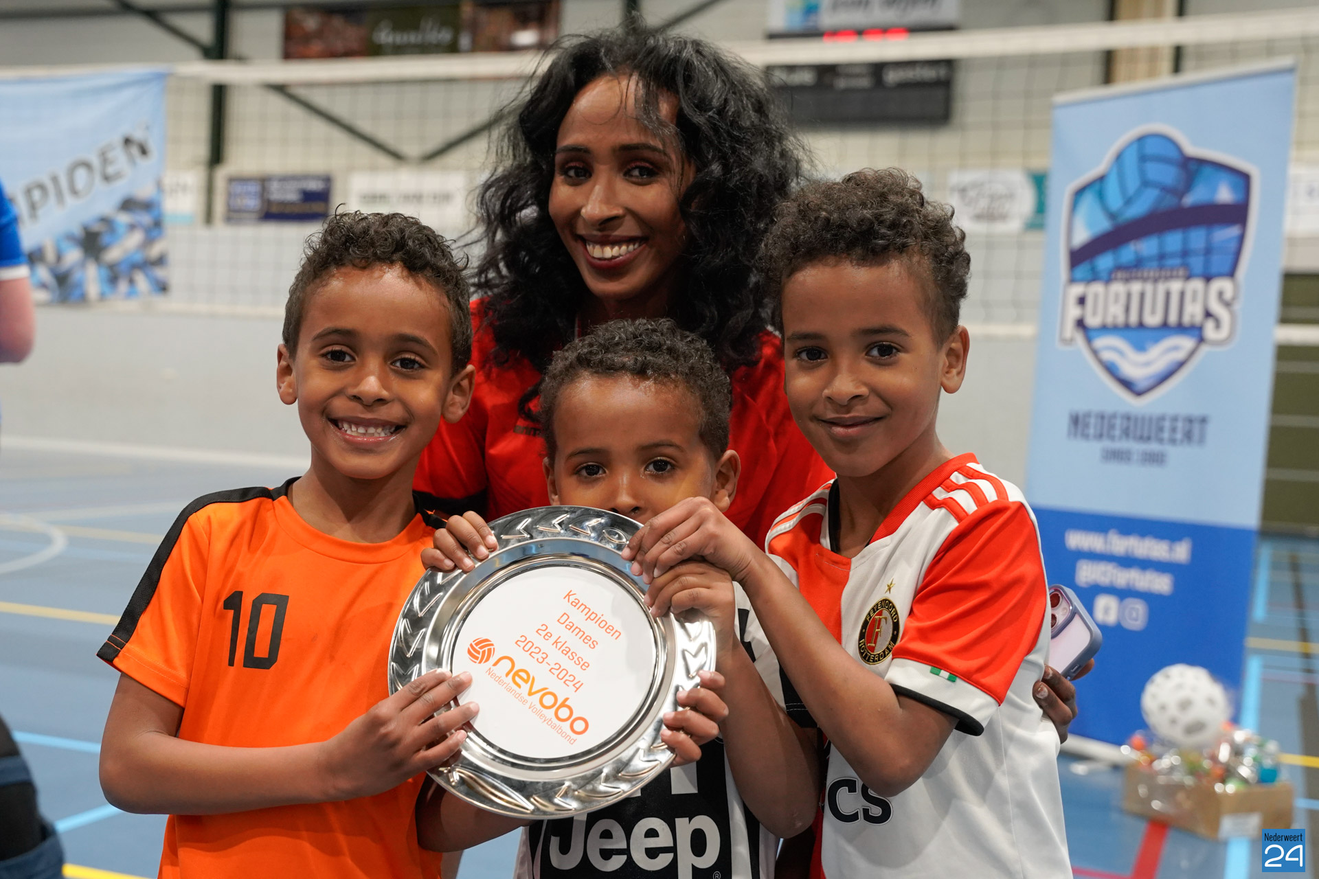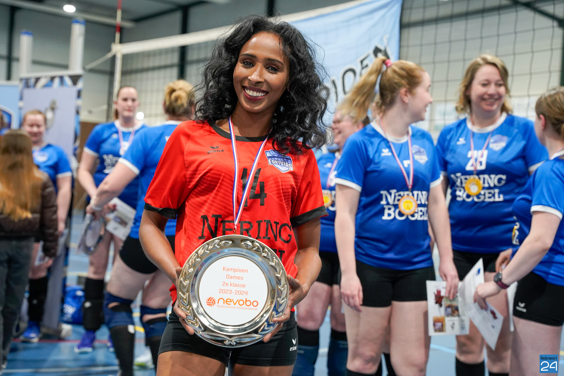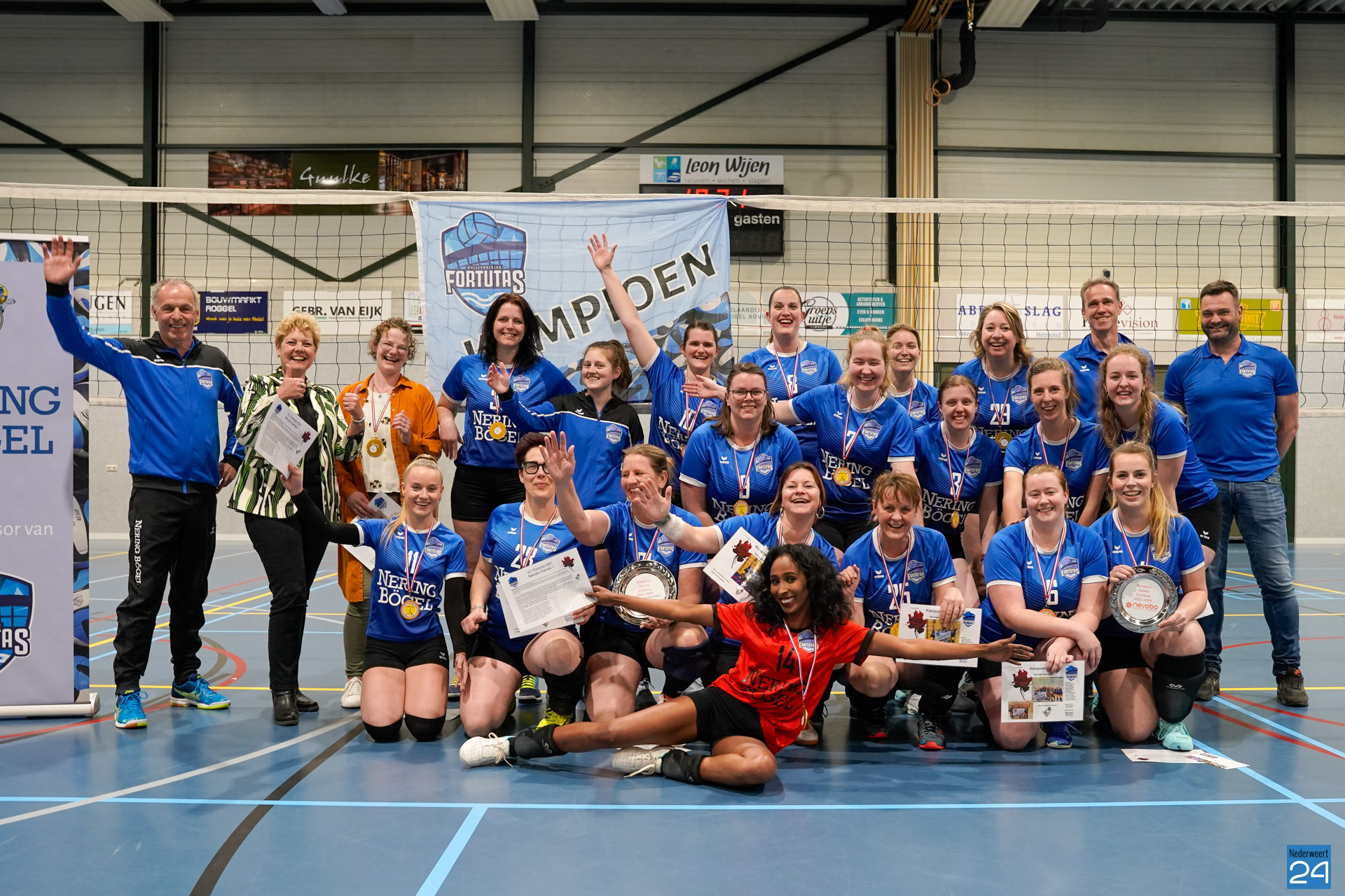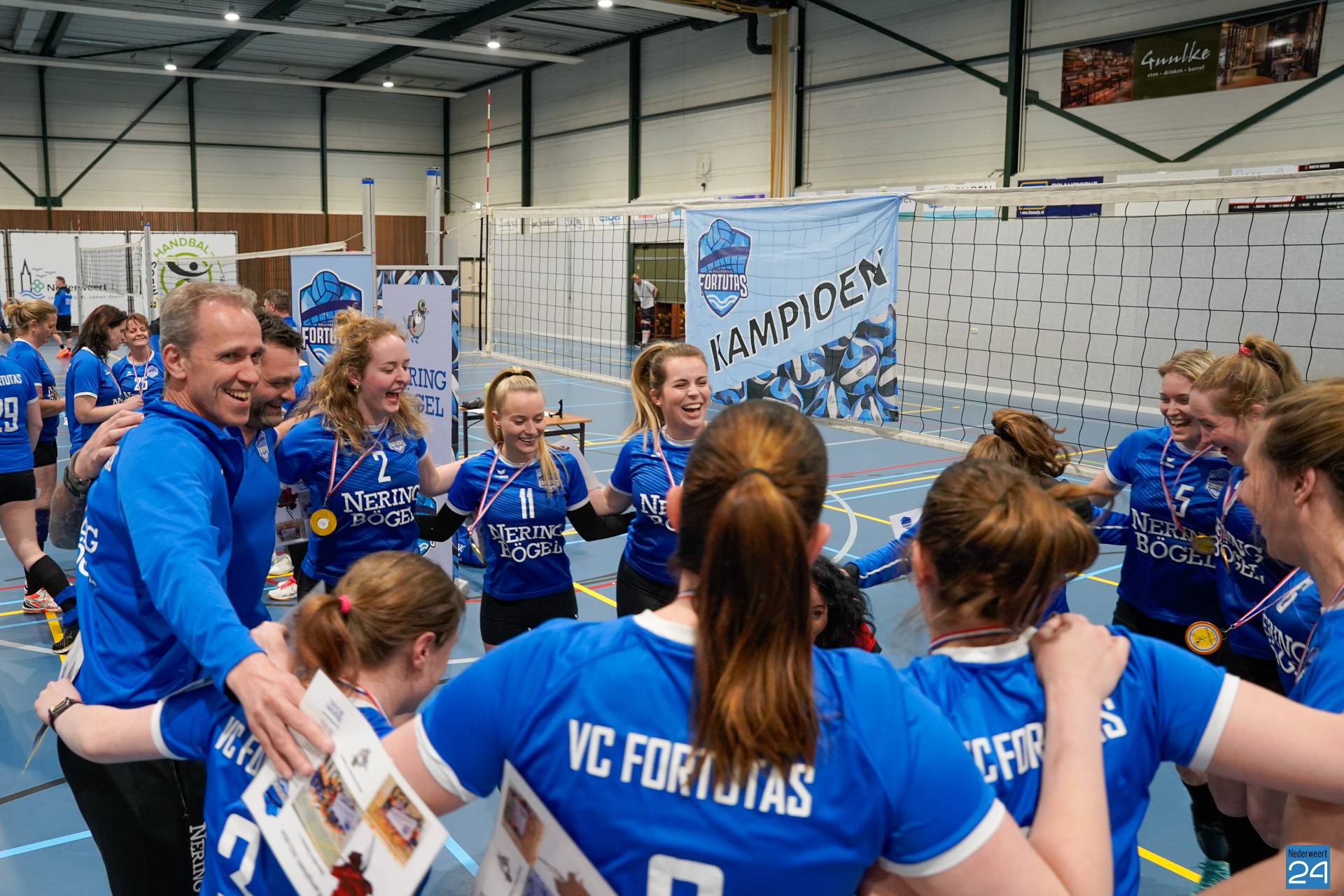 Het team is kampioen geworden in de 2e klasse van de Nevobo (Nederlandse Volleybal Bond) in een zeer spannende competitie. Veel wedstrijden werden er gewonnen, enkele verloren maar op het juiste moment waren jullie goed bij de les. Want op zaterdag 24 maart kon het plotseling al gaan lukken om kampioen te worden. Via de uitslagen in de Nevobo app zagen we dat concurrent Tecona een set had verloren en dat daarmee voor de Fortutas dames een 4-0 overwinning later op die dag voldoende zou zijn om kampioen te worden. Dit vergde wel nog extra berekeningen en bestudering van het wedstrijdreglement. Want wat gebeurt er als twee teams gelijk aantal wedstrijdpunten hebben. Uit het reglement bleek dat de set quotiënt van alle wedstrijden dan bepalend is. Toen die was uitgerekend, rekening houdende met nog een laatste wedstrijd, was het duidelijk. Die 4-0 overwinning in Herten tegen VC Hero was op 24 maart voldoende om zeker te zijn van het kampioenschap. Daarbij was het wel nog erg spannend want de 3e set werd maar nipt met 25-23 gewonnen. Maar met een 25-12 overwinning in de 4e set kon het feest beginnen. Het kampioenschap was binnen!! Tenslotte ontvangt de aanvoerder voor het gehele team nog een kampioenschaal en een tegoedbon om met het gehele team een leuke bowlingavond bij Pins en Pints te beleven.