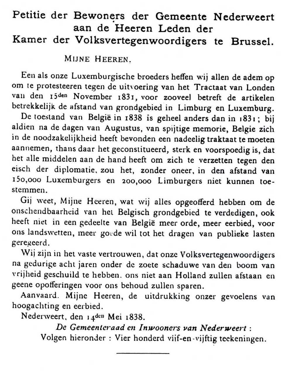 Het gemeentebestuur van Nederweert, net als dat van omliggende gemeenten, nam daarom in mei 1838 het initiatief tot een volksraadpleging of referendum. Dat gebeurde in de vorm van het verzamelen van handtekeningen onder een petitie met als stellingname: ‘Nederweert wil blijven bij Brussel (België) en zegt nee tegen Nederland’. In hedendaagse woorden: geen ‘Brexit’ maar ‘Nexit’. Maar liefst 455 gezinshoofden uit Nederweert zetten hun handtekening. Dat was een buitengewoon hoge score, vooral als men zich realiseert dat het totaal aantal gezinnen in het hele dorp ongeveer 800 bedroeg. Een groot deel van de inwoners was analfabeet en kon dus geen naam of handtekening plaatsen. Het Nederweerter referendum werd zelfs in de vorm van een gedrukt pamflet uitgegeven en vervolgens aangeboden aan de regering in Brussel.