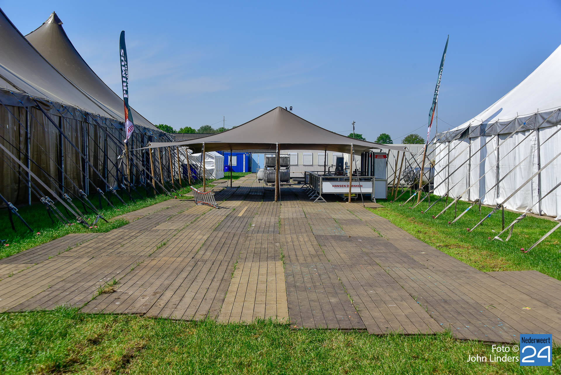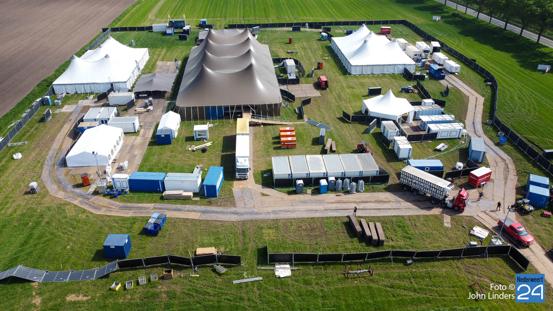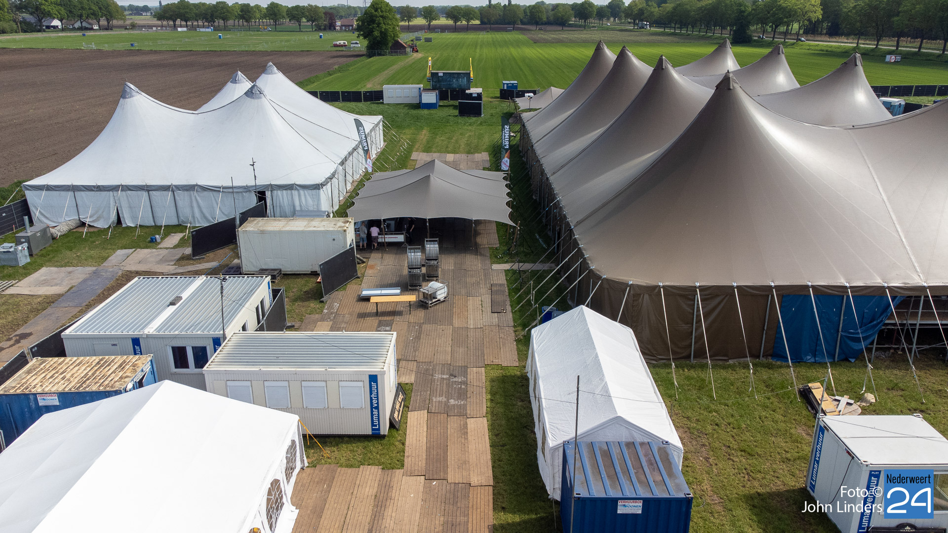 Soms is er een kleine tegenslag zoals hekwerken die zijn omgewaaid afgelopen nacht, een vrachtwagen die vast komt te zitten in de natte onderlaag, maar ze laten de moed niet zakken en er wordt weer een tandje extra bijgezet. Op de dronefoto is te zien dat er tussen de hoofdtent en het Blues Café een soort van horecaplein gemaakt is. Dit gaat zeker een zeer gezellige plek worden voor een mooi samenzijn met een heerlijk glas bier.