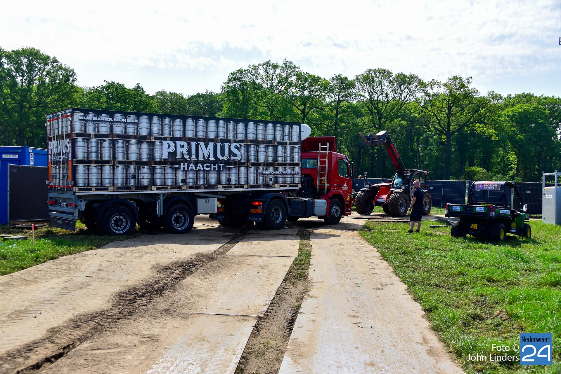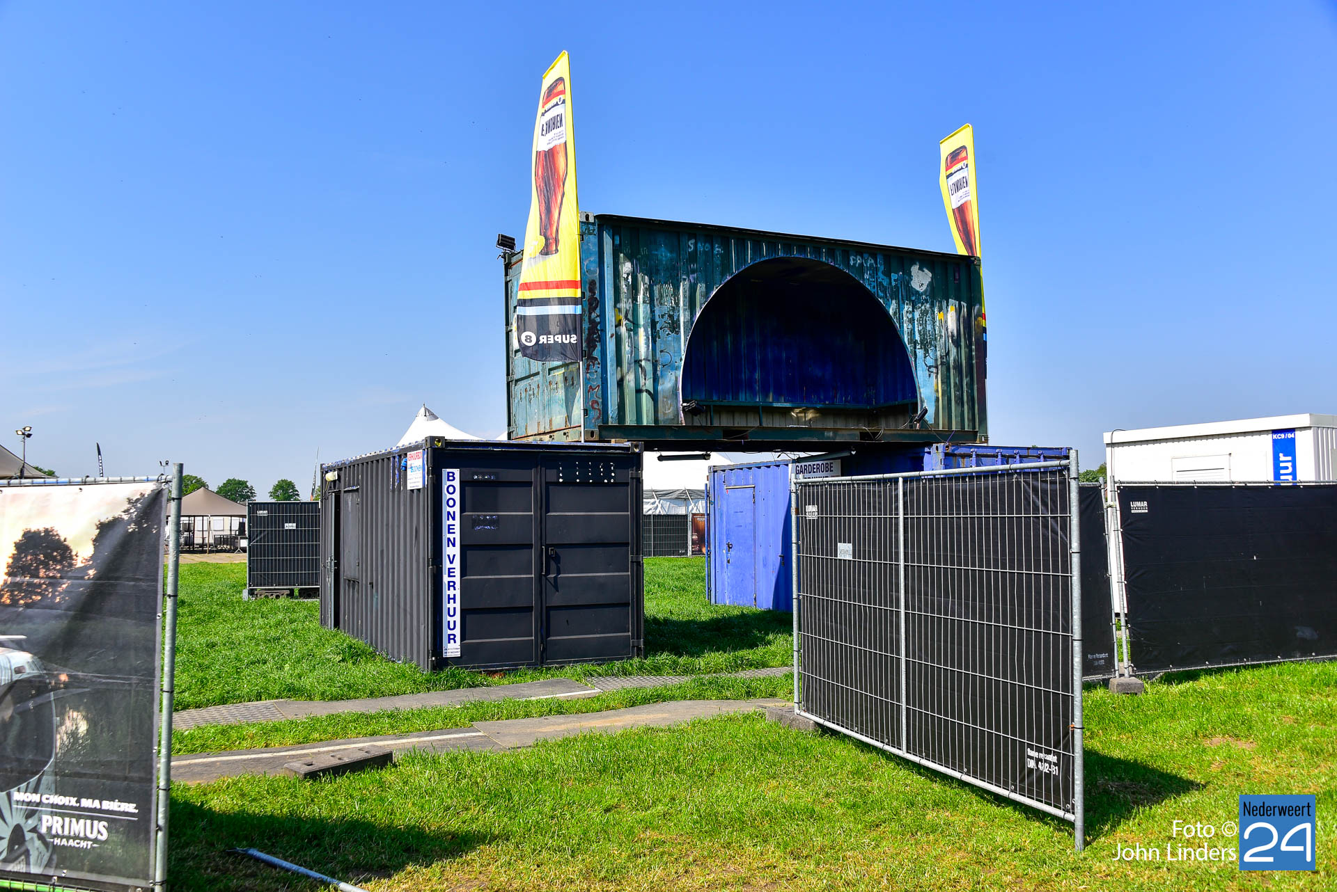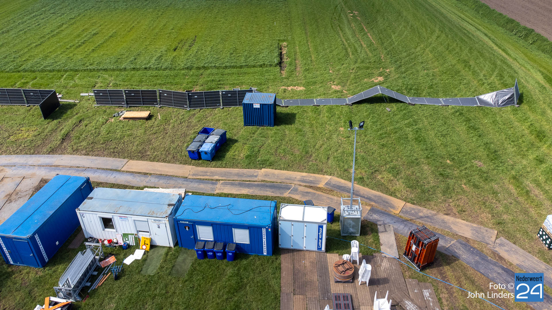 Soms is er een kleine tegenslag zoals hekwerken die zijn omgewaaid afgelopen nacht, een vrachtwagen die vast komt te zitten in de natte onderlaag, maar ze laten de moed niet zakken en er wordt weer een tandje extra bijgezet. Op de dronefoto is te zien dat er tussen de hoofdtent en het Blues Café een soort van horecaplein gemaakt is. Dit gaat zeker een zeer gezellige plek worden voor een mooi samenzijn met een heerlijk glas bier.