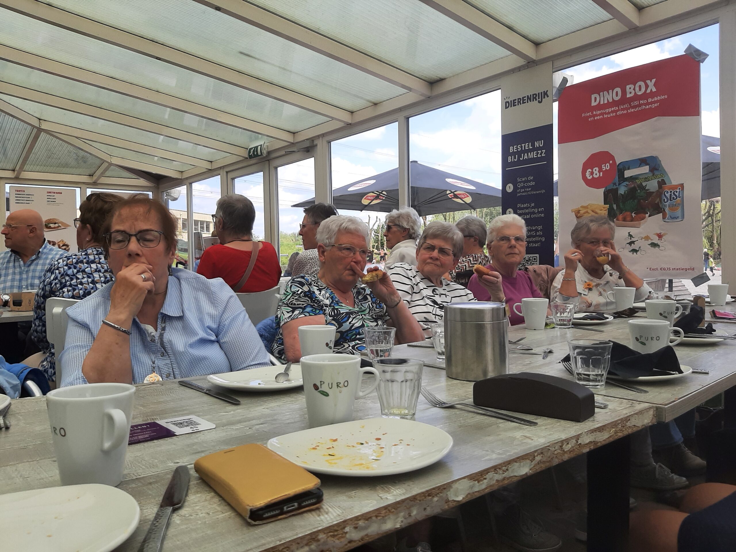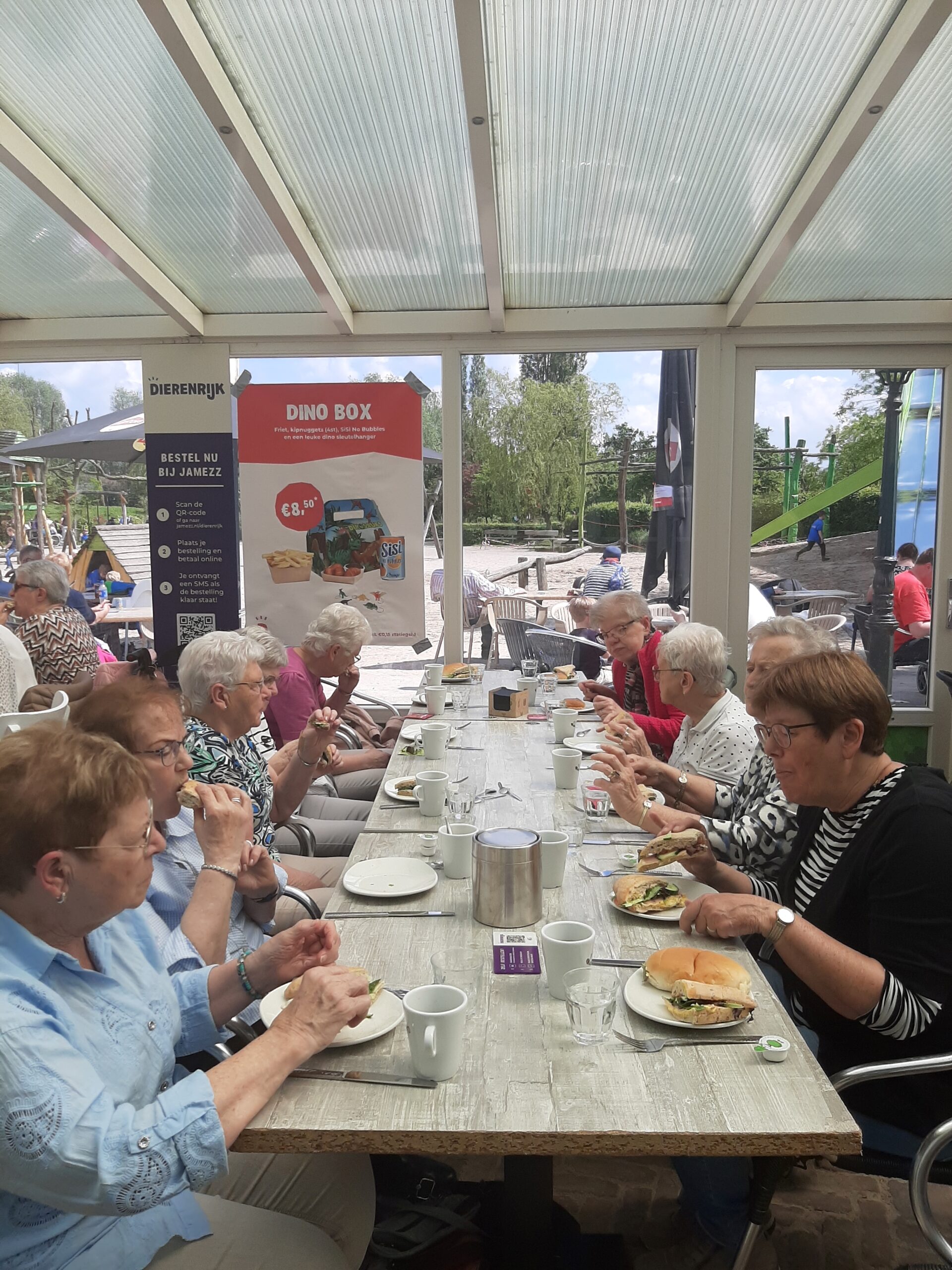 Het gezelschap begon het dagprogramma met een eerste wandeling door het Dierenpark. De groep werd in delen opgesplitst; de gasten genoten zichtbaar, want de dieren, schoeën en liele-ke, waren van dichtbij te zien. Rond de klok van 13.00 uur genoot het gezelschap van een goedverzorgde Brabantse lunch. Ook de eigen vrijwilligers droegen hun steentje bij aan de bediening. Het was goed toeven in het restaurant en de eerste belevenissen werden al gedeeld.