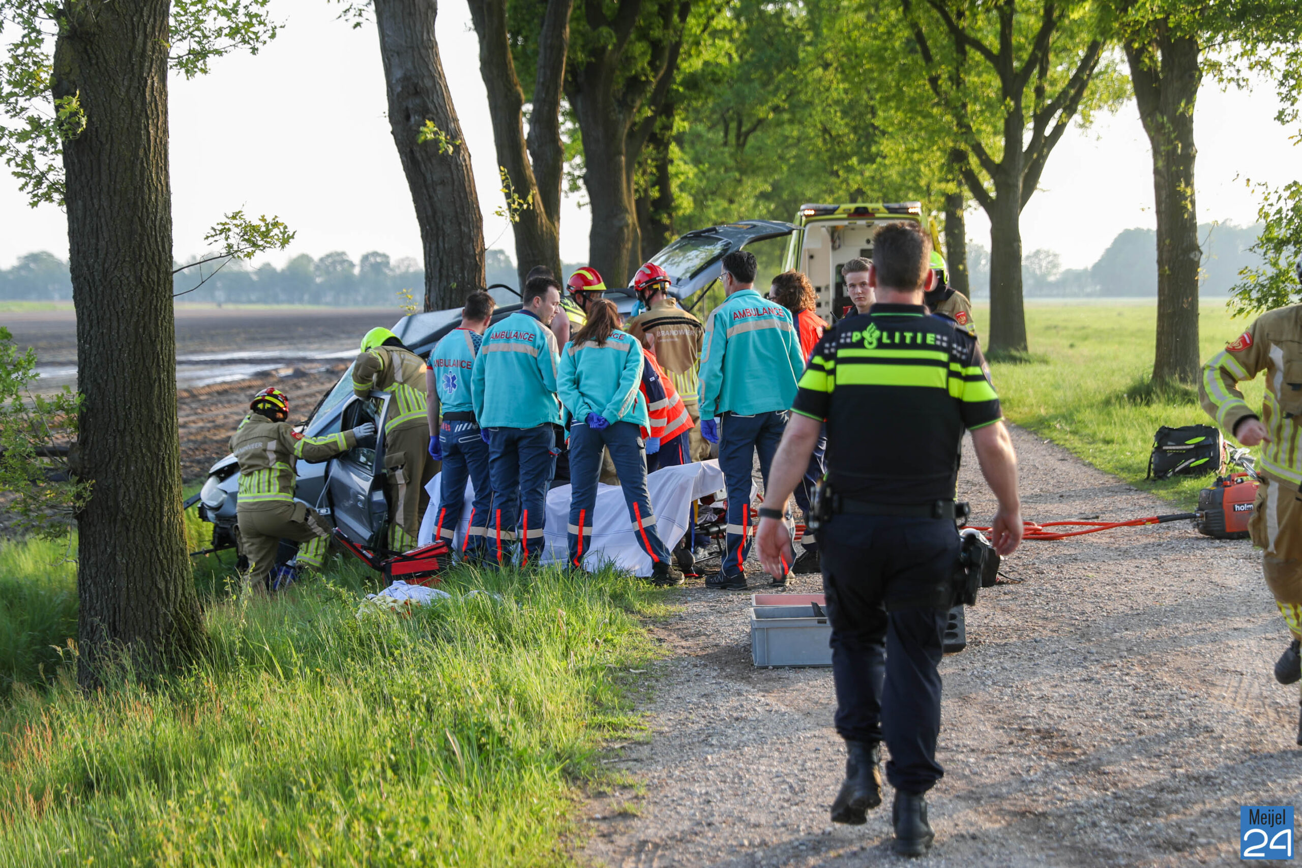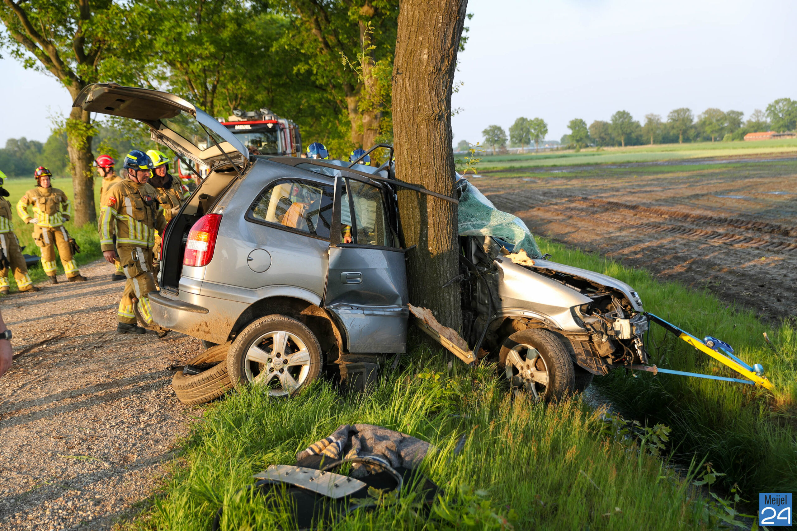De bestuurder van de auto is waarschijnlijk rechts naast het zandpad geraakt en vervolgens aan de overkant van de weg, links tegen een boom gebotst. De auto was om de boom heen gevouwen.