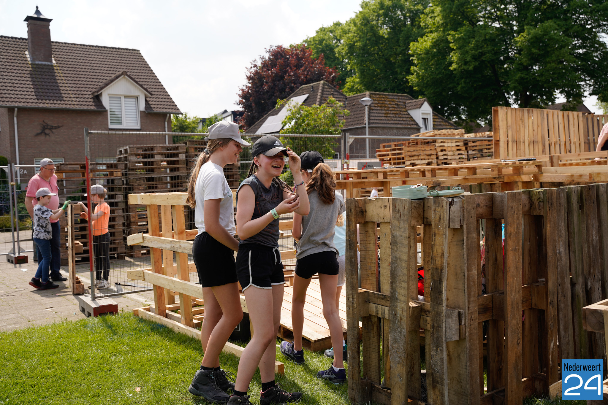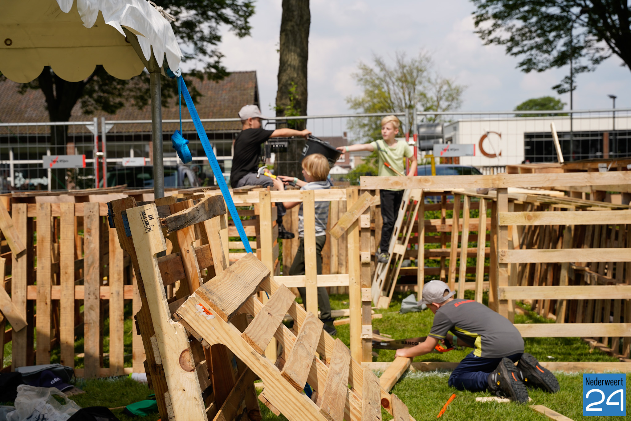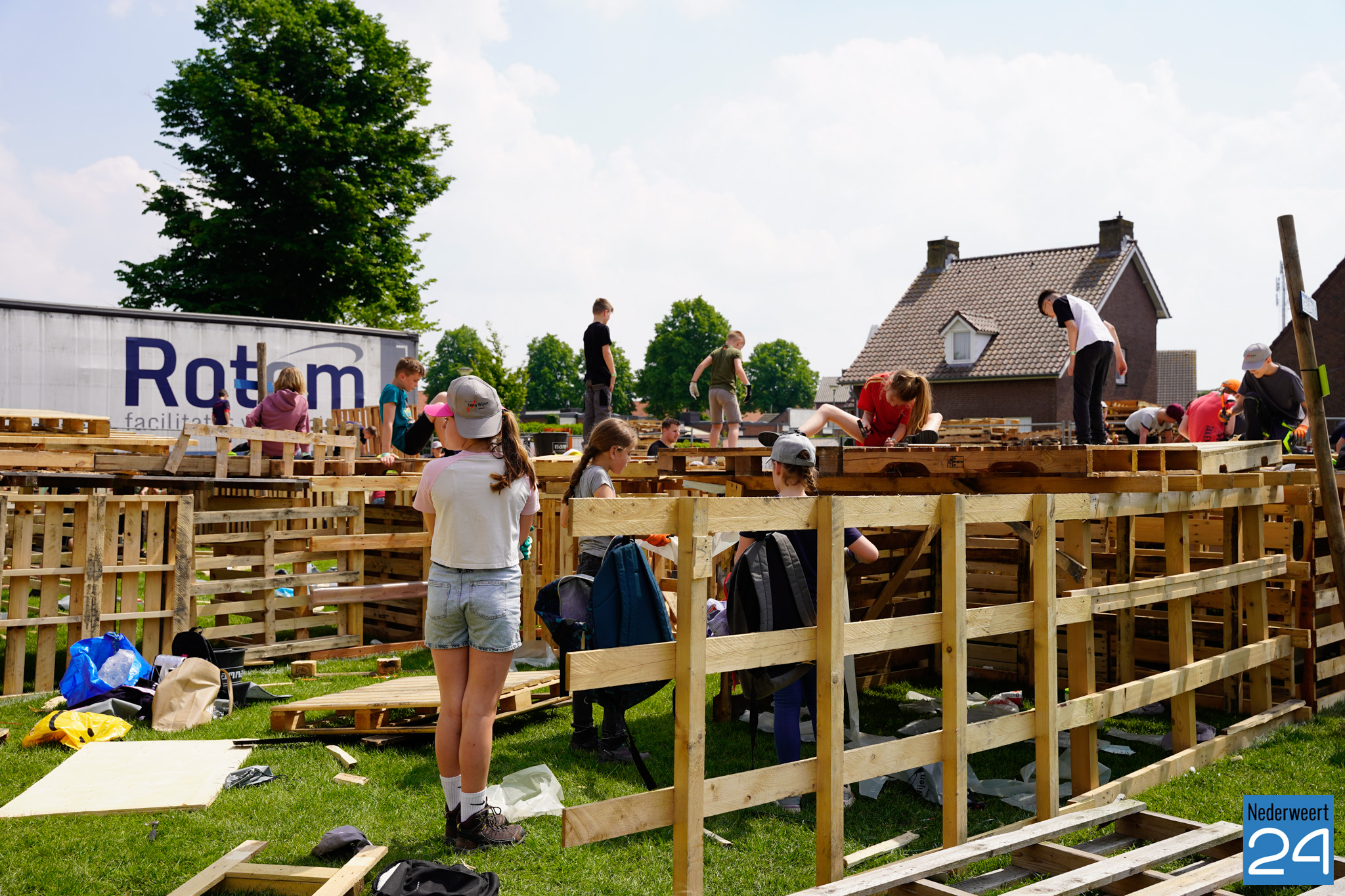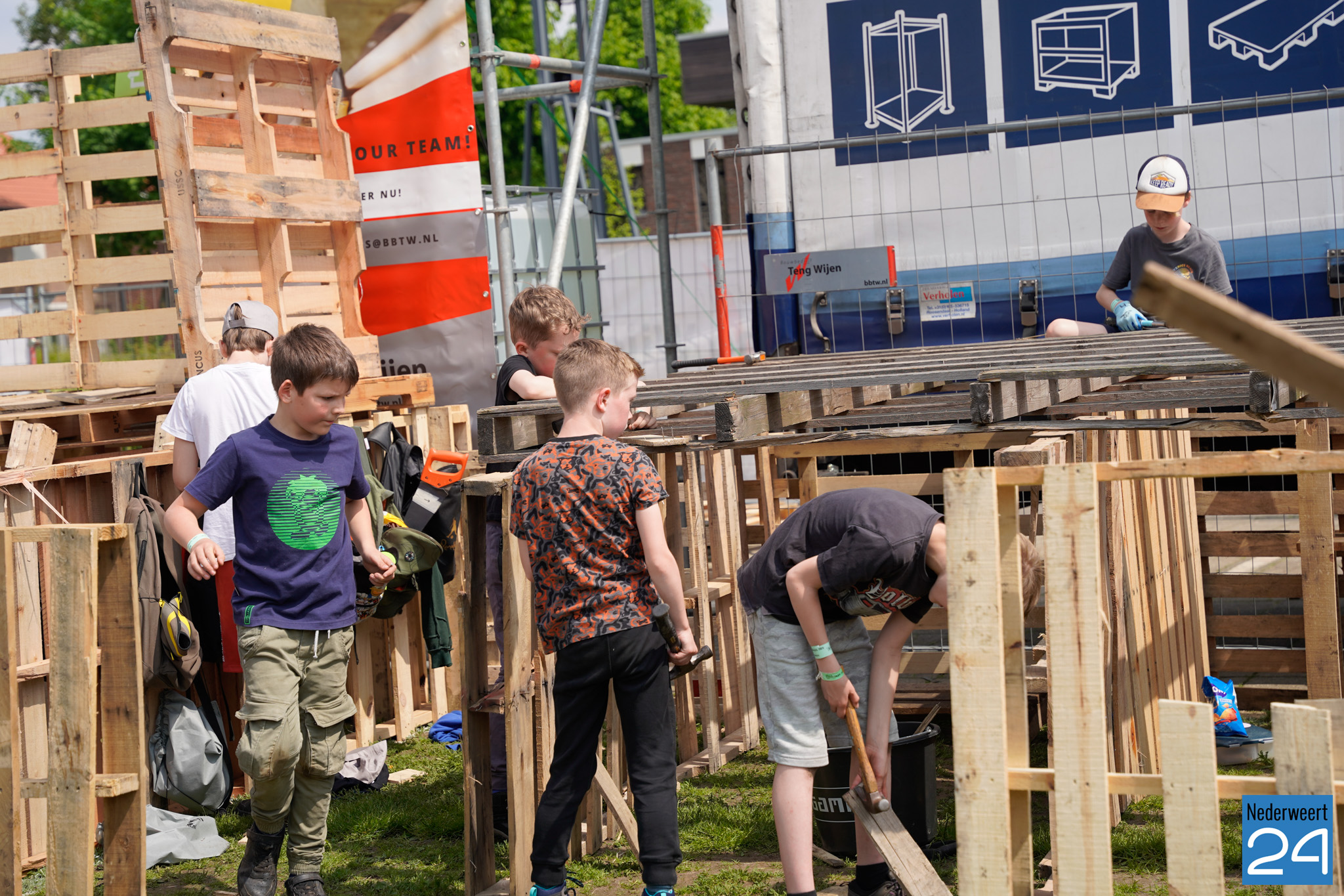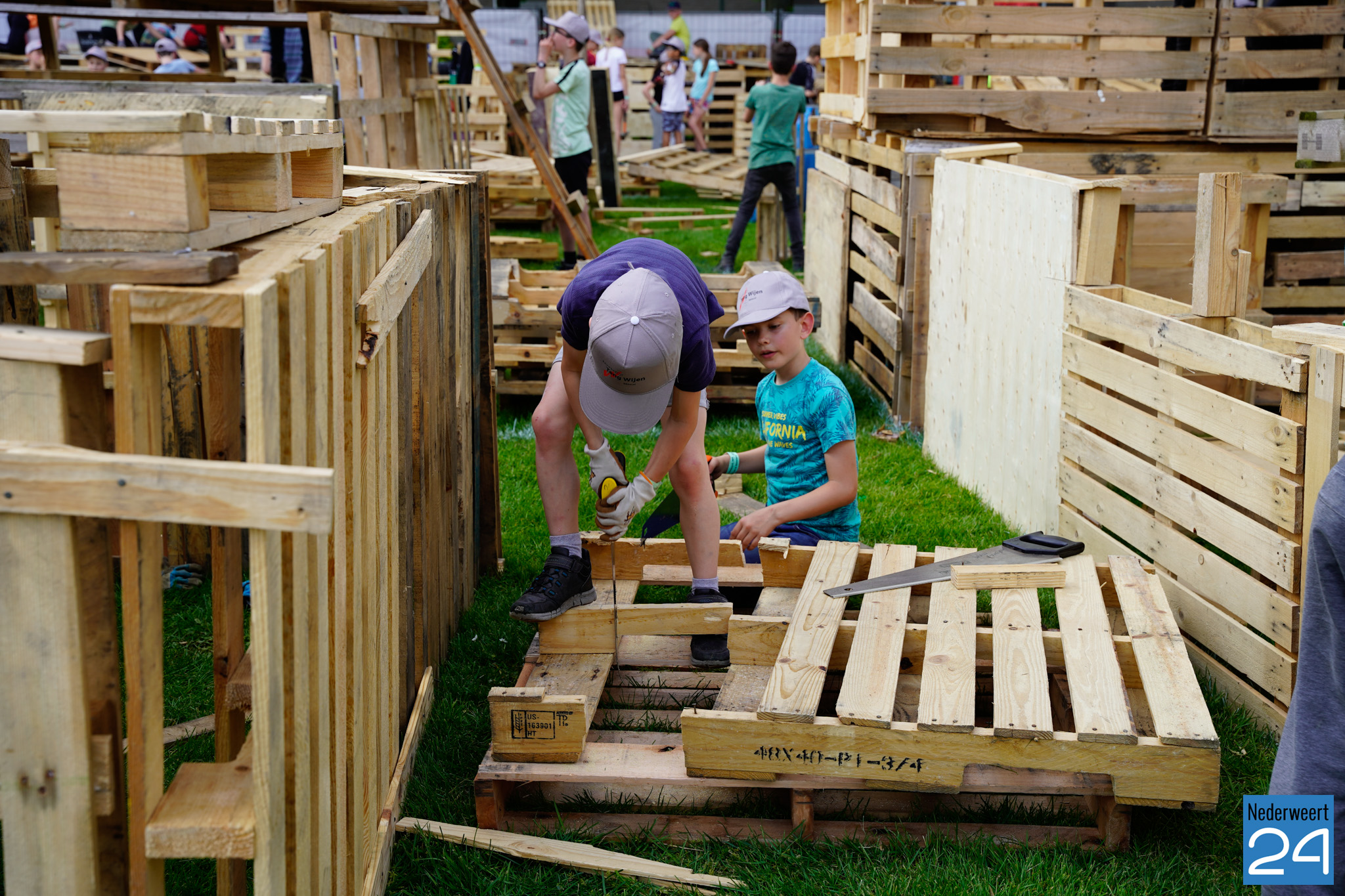 Het Sint Rochusplein in Budschop is weer omgetoverd tot timmerdorp, kinderen van groep 4 t/m 8 mogen in groepjes van 4 tot 12 personen verdeeld over ongeveer 45 kavels hun eigen ontworpen “palletwoning” gaan realiseren.