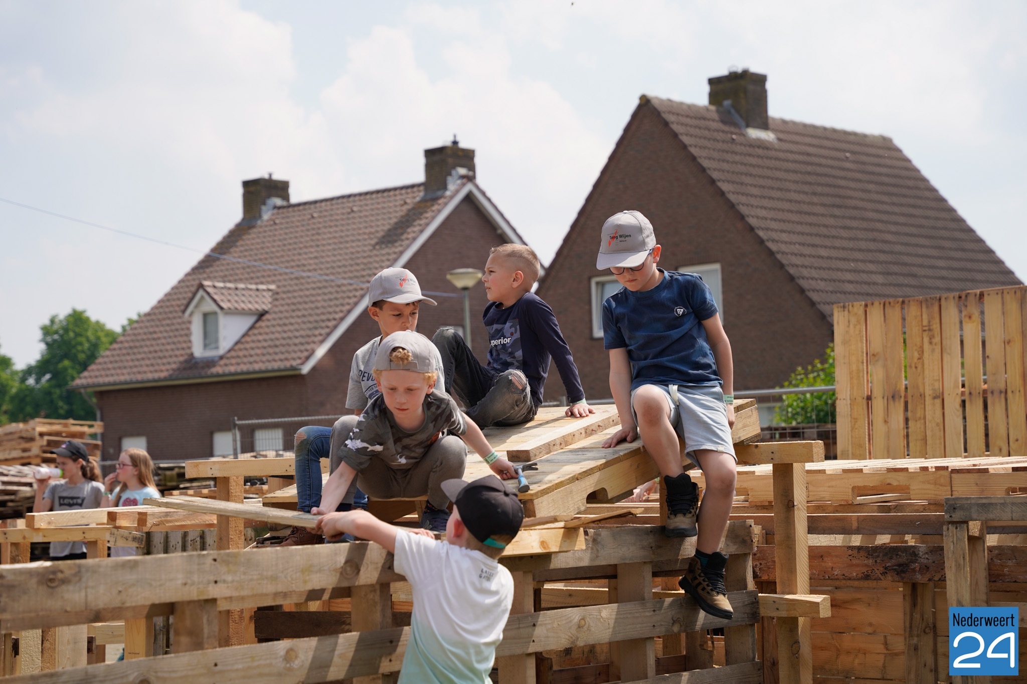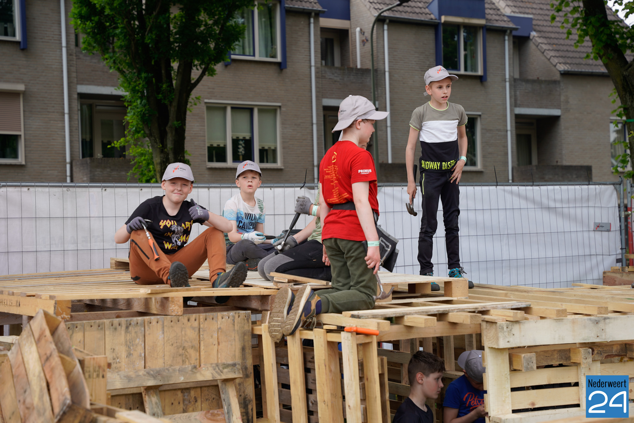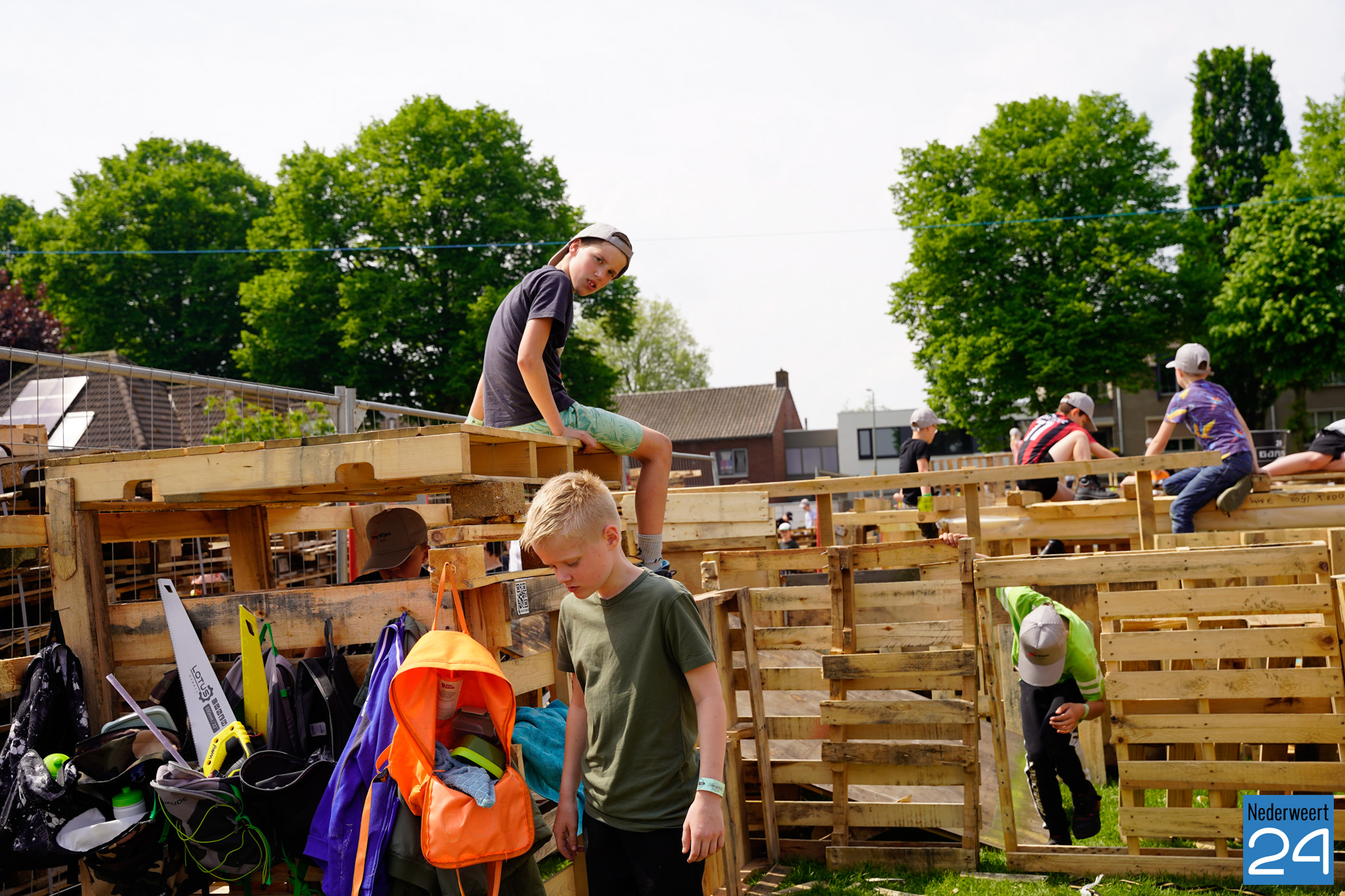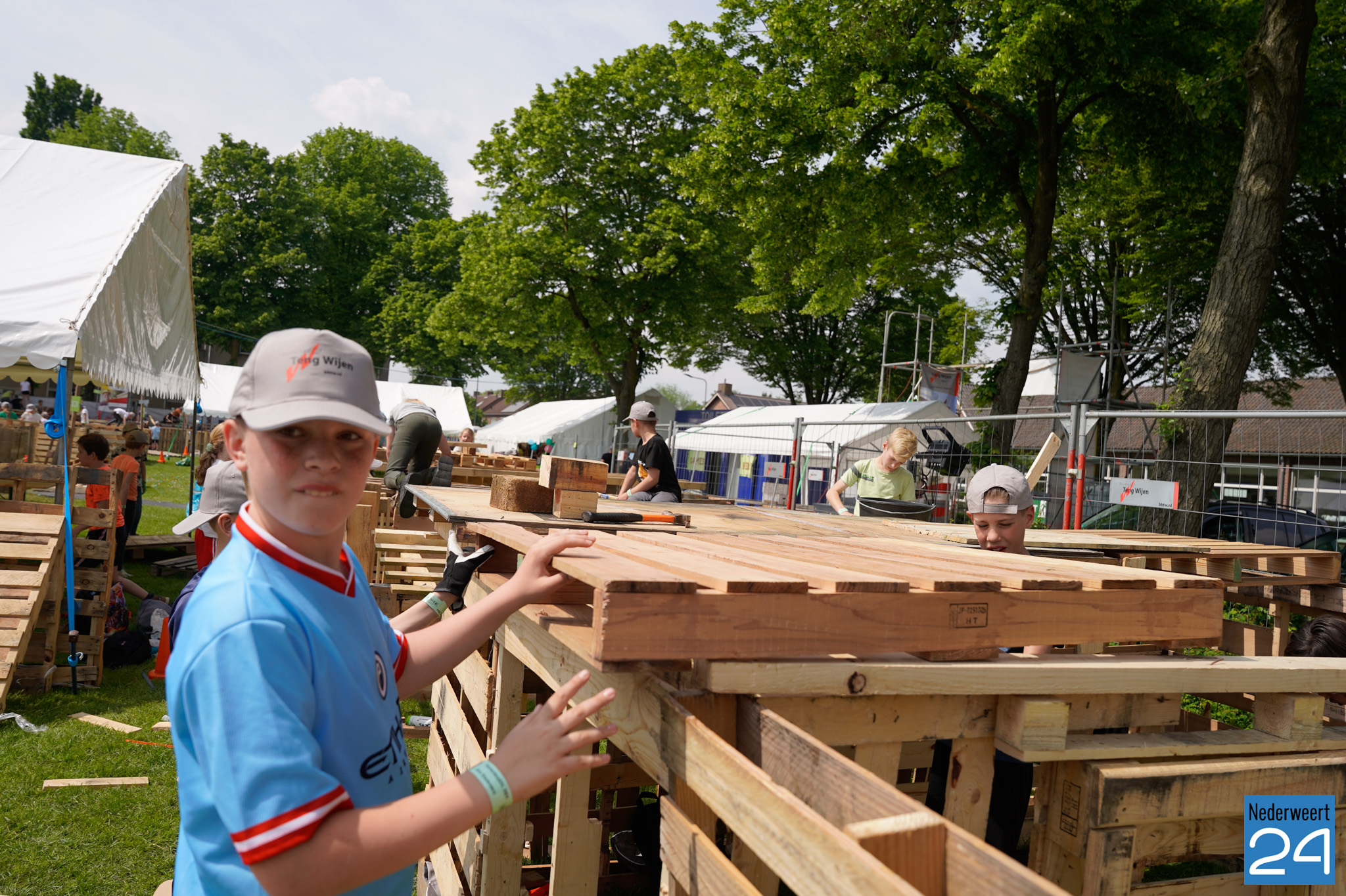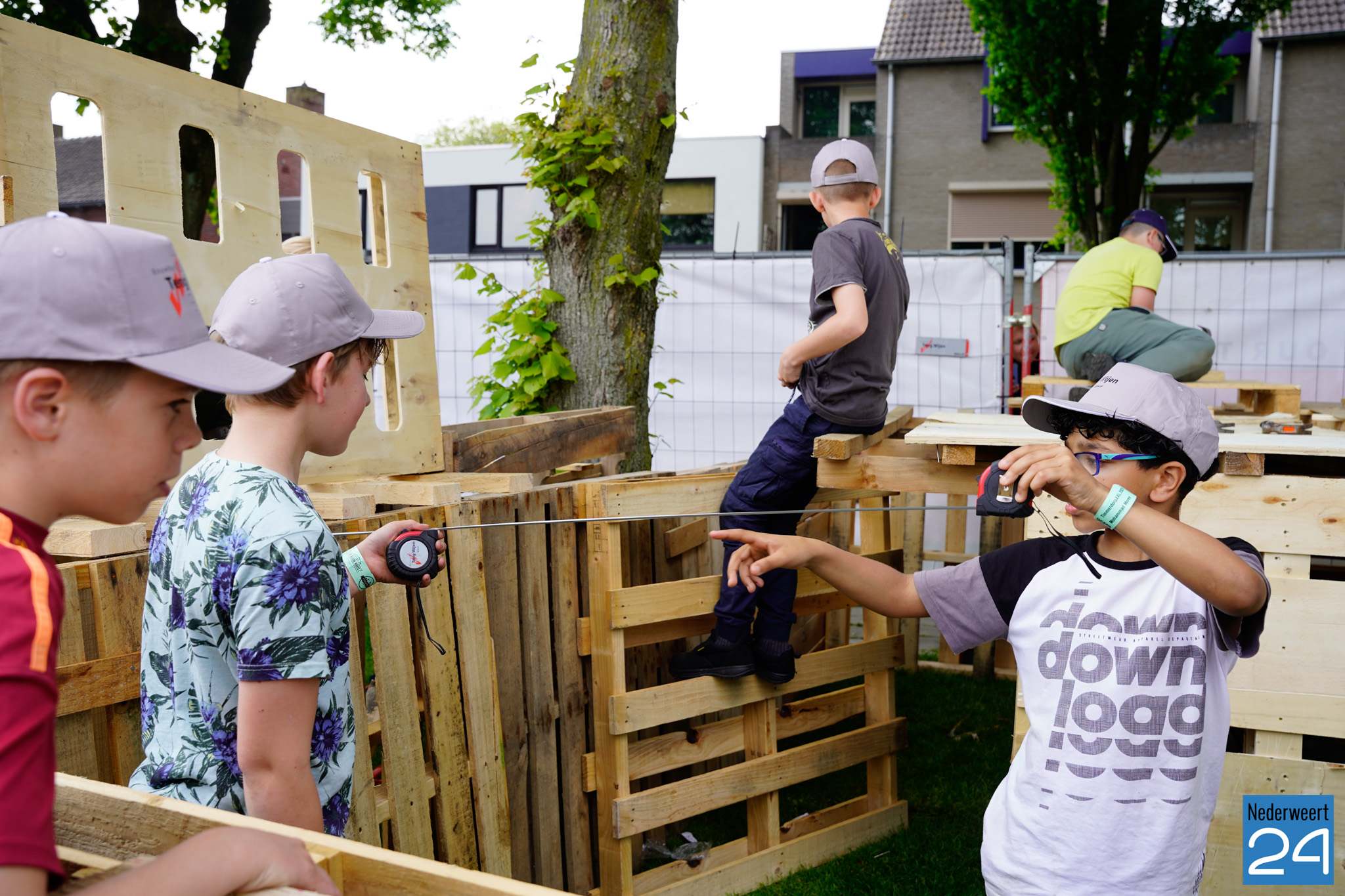 Het Sint Rochusplein in Budschop is weer omgetoverd tot timmerdorp, kinderen van groep 4 t/m 8 mogen in groepjes van 4 tot 12 personen verdeeld over ongeveer 45 kavels hun eigen ontworpen “palletwoning” gaan realiseren.