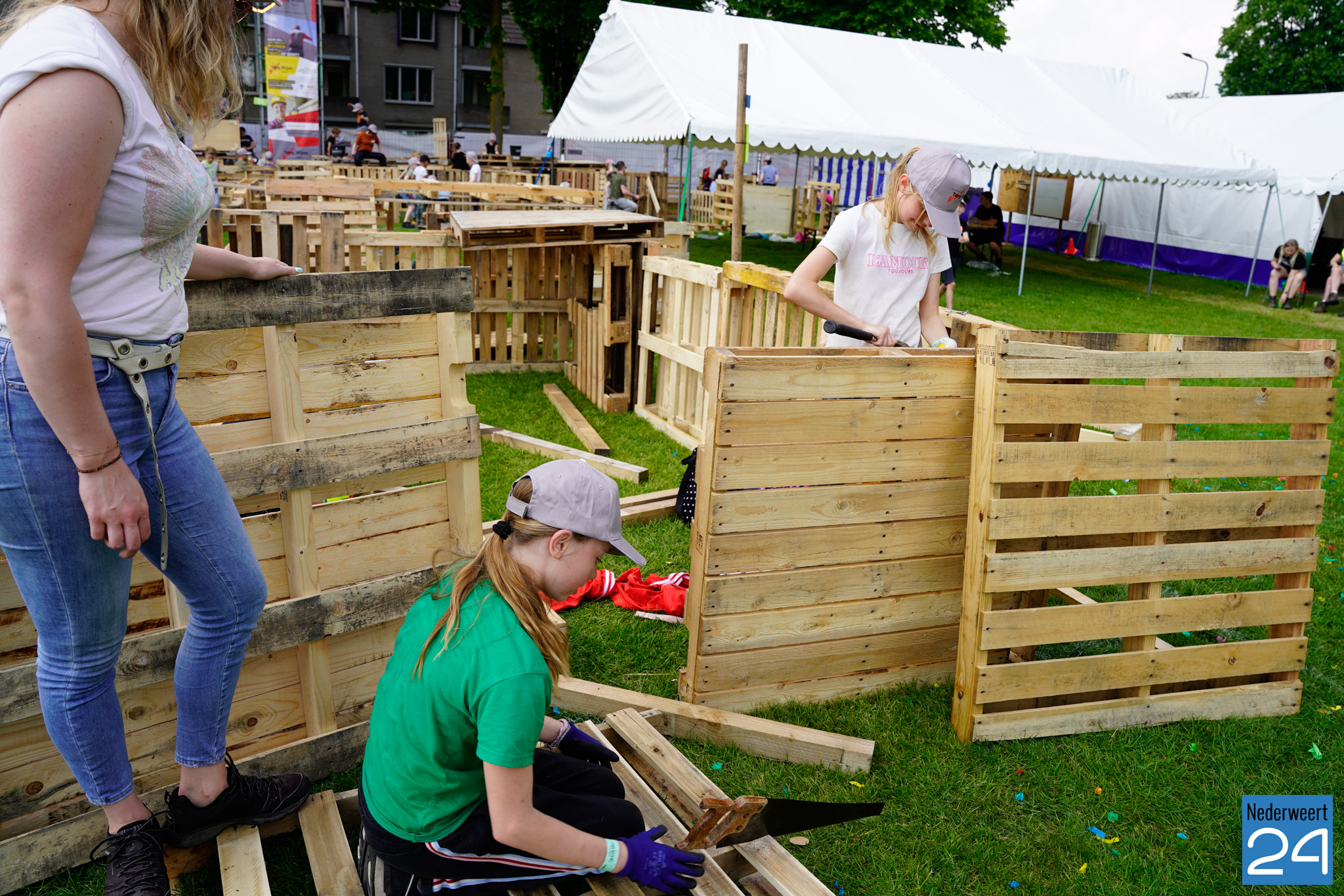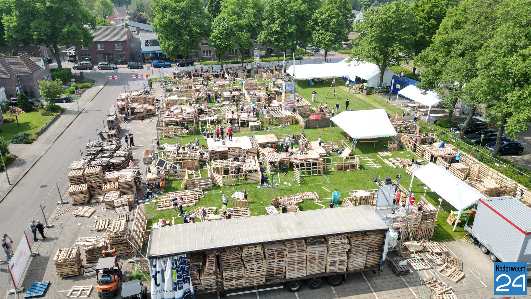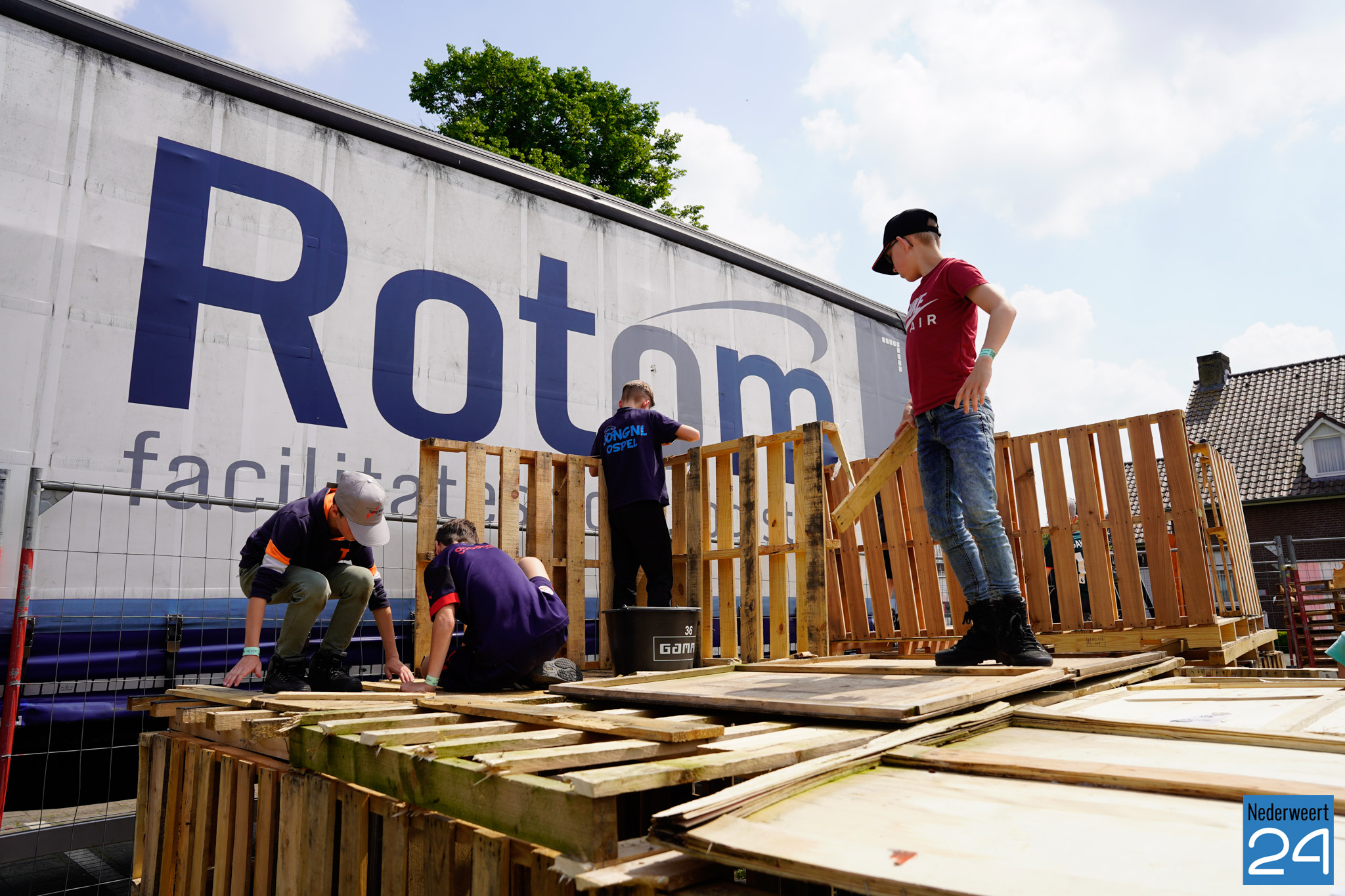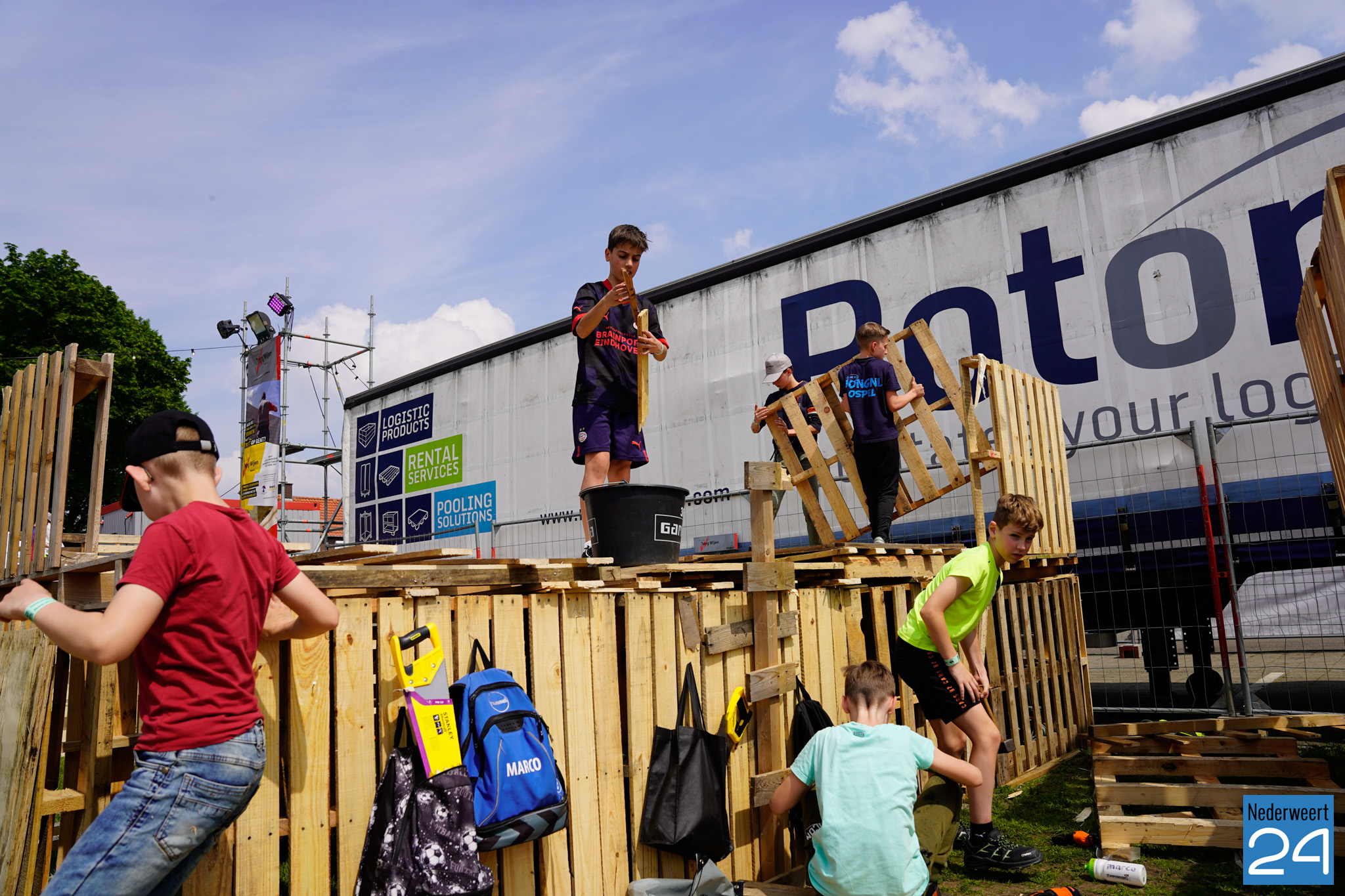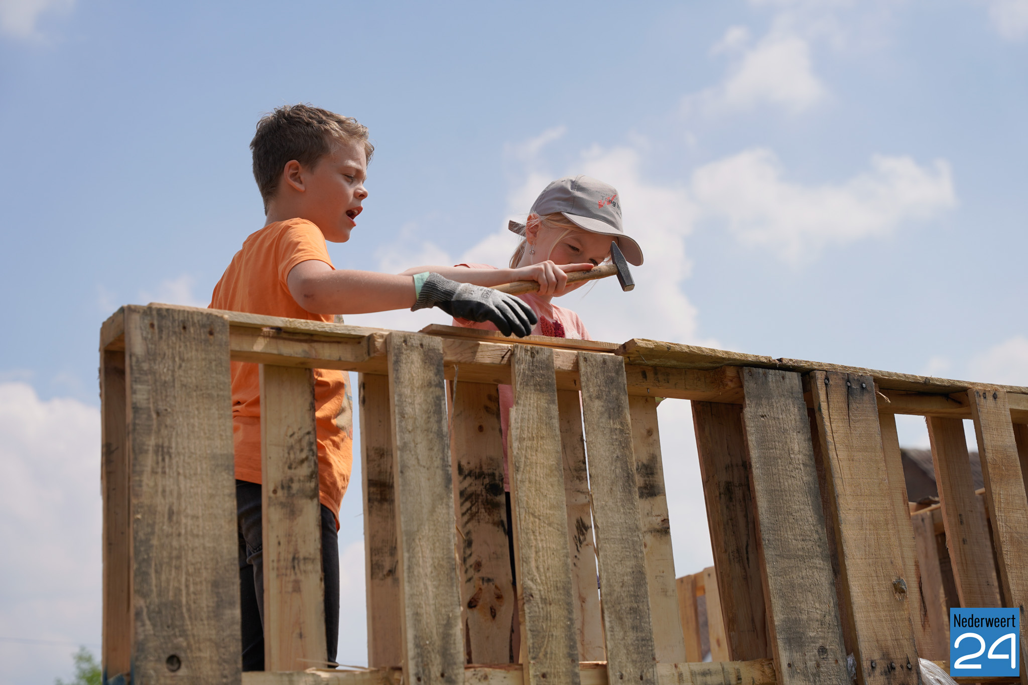 Het Sint Rochusplein in Budschop is weer omgetoverd tot timmerdorp, kinderen van groep 4 t/m 8 mogen in groepjes van 4 tot 12 personen verdeeld over ongeveer 45 kavels hun eigen ontworpen “palletwoning” gaan realiseren.